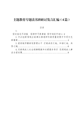 主题教育专题读书班研讨发言汇编(4篇)目录1.坚定信念不动摇 坚持学习提素能 坚守岗位守初心22.守正创新唱响主旋律在推进师市高质量发展中书写文艺新篇章..43.提高城市精细化管理水平 打造品质之城、和谐之城、共享之城..64.完善残疾人社会保障制度和关爱服务体系 促进残疾人事业全面发展.8坚定信念不动摇 坚持学习提素能 坚守岗位守初心强党性、长志气,坚定信念不动摇。我们必须坚定共产主义理想信念,坚守共产党人的精神追求,坚决捍卫两个确立,切实做到两个维护,自觉在政治上思想上行动上同以XXX同志为核心的党中央保持高度一致。恪守干净做人、踏实干事、清廉从政的原则不动摇,切实增强纪律意识、规矩意识,严格遵守党纪党规、国家法律法规和兵师的规章制度,自觉做到不破红线、不越底线,确保在思想上不抛锚、在行动上不出轨。学思想、养才气,坚持学习提素能。正确对待学习。在思想上真正意识到学习的重要性和迫切性,把学习当作一件大事、一件快乐的事情,自觉地坚持下去、抓好落实、久久为功。在平时工作中,要正确处理工学矛盾,善用时间、挤出时间来认真学习XXX新时代中国特色社会主义思想、法律法规、专业知识、文章写作、社会科学等多方面知识,从而不断打牢理论功底,掌握专业技能,拓宽人生阅历,提高自身素质,增强办事能力。在学习工作生活中,我们要善于做有心人,对重要讲话、重点知识、核心观点、好句好段等要搜集整理、摘抄勤看,从而做到厚积薄发、为我所用。重实践、接地气,转变作风求实效。学思想、强党性、重实践、建新功正是要通过学习贯彻XXX新时代中国特色社会主义思想,锻炼党性,淬炼党性,提高觉悟,最终落实到为人民服务,从江山就是人民,人民就是江山的要求从深层次上去思考,才能做到怀着务实之心调查研究,带着诚见之意求计问策,为民排忧解难。立新功、树锐气,坚守岗位守初心。要始终保持昂扬斗志,爱岗敬业,乐于奉献,敢于担当,努力做好本职工作和交办工作。近期我们加强了对民营企业走访调研的频次与密度,进一步跟进了解到企业疫情过后新的诉求与愿望,了解到了企业当前最新的困难,通过最大限度跟踪服务,真心实意为企业解难题、办实事,工商联利用党和政府联系民营企业的特长和优势,一步一个脚印,把工作做好做实。守正创新唱响主旋律在推进师市高质量发展中书写文艺新篇章唱响文化自信自强的主旋律。用XXX新时代中国特色社会主义思想凝心铸魂,领悟好、把握好蕴含其中的世界观和方法论,坚持好、运用好贯穿其中的立场观点方法,并转化为推动文艺创作、指导工作实践的强大力量。师市文联要带领师市广大文艺工作者深刻领会民族复兴的时代主题,感知和跟上时代脉动,以艺术的独特方式,生动鲜活地弘扬社会主义核心价值观,弘扬伟大建党精神和兵团精神、胡杨精神、老兵精神,让文化的自信自强为全面推进中国式现代化提供更为强劲的价值引导力、文化凝聚力、精神推动力,在围绕中心、服务大局中彰显文艺工作者的担当与作为。发挥文艺展示形象、沟通各界的独特作用,以更加开放的心态、更加自信的涵养、更加博大的胸怀,广泛参与文化艺术交流,生动讲述中国故事、兵团故事、师市故事,大力弘扬奋进新征程、自信向未来的主旋律。强化以人民为中心的创作导向。社会主义文艺是人民的文艺,弘扬人民性是党领导百年文艺发展道路最根本、最鲜明的特征。只有为了人民、抒写人民、讴歌人民,文艺才能为人民需要、被人民喜爱。文联要组织引导师市广大文艺工作者从中国式现代化的伟大实践中感悟时代激情,在兵团职工群众的奋斗史中进行艺术的审美创造,在描写职工群众普通生活中体现意义、表达情怀、传递温暖。进一步完善深入生活、扎根人民主题实践常态化工作机制,向基层一线扎根,推出一批接地气、有灵气、聚人气的优秀文艺作品。守正创新推动文艺高质量发展。党的XX大把守正创新列入大会的主题,XXXXXX指出,我们从事的是前无古人的伟大事业,守正才能不迷失方向、不犯颠覆性错误;创新才能把握时代、引领时代。作为兵团文艺工作者,要进一步强化质量意识和精品意识在文艺创作中要注重把艺术创造力和中华文化价值结合起来,把中华美学精神和当代审美追求特别是兵团特色结合起来,把美的价值注入美的艺术之中,不断创新新时代兵团艺术叙事体系,增强师市本土作品的思想穿透力和审美洞察力,在中华民族特色的文艺样态中感悟和汲取营养,让优秀传统文化活在新时代的艺术精品之中。发挥优势,凝聚铸就文艺新辉煌的生力军。作为文艺界人民团体,文联必须充分发挥组织优势和专业优势,以更加强烈的历史主动精神