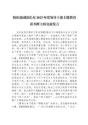 组织部副部长在2023年度领导干部主题教育读书班上的交流发言扎实组织开展学习贯彻XXX新时代中国特色社会主义思想主题教育是衷心拥护两个确立、忠诚践行两个维护的政治检验,必须准确把握主题教育的总要求和目标任务,在深学细悟、笃信笃行上走在前、作表率,切实以主题教育的扎实成效,推动组织工作高质量发展。近段时间,本人通过个人自学,深入学习了党的XX大报告、党章等学习材料,对新思想有了更进一步的认识。下面,结合工作实际,谈几点心得体会。一要通过学习领悟对党忠诚的使命,汲取信念如磐的力量。XXXXXX指出:全心全意为人民服务,是中国共产党人的根本宗旨。过去,我们深入学习贯彻XXX新时代中国特色社会主义思想,牢记为人民服务的根本宗旨,坚定理想信念,增强政治意识。比如,我们组织党员干部认真学习党章党规,开展不忘初心、牢记使命主题教育,重温入党誓词,自觉在思想上政治上行动上同党中央保持高度一致。这增强了我们的政治定力,使我们在工作中牢记为人民服务的宗旨。作为党员领导干部,我们必须牢记入党誓言,坚定理想信念,增强政治意识。下一步,我们还要继续深入学习贯彻XXX新时代中国特色社会主义思想,自觉在思想上政治上行动上同党中央保持高度一致,坚决维护以XXX同志为核心的党中央权威和集中统一领导。我们一定要坚持正确政治方向,增强四个意识,坚定四个自信,做到两个维护,以对党忠诚的信念如磐之力量推动各项工作。二要通过学习感悟增强本领的担当,汲取勤学苦练的力量。XXXXXX指出:一切工作都要从实际出发。过去,我们在制定工作计划时,都会组织力量深入基层调研,充分了解人民群众的意见和要求。比如,在拟定十四五规划时,我们多次开展调研,广泛征求群众对发展的意见,在此基础上制定出符合实际的规划。这增强了我们办事的本领和能力。作为党员领导干部,我们必须坚持调查研究,深入实际,勤学苦练,提高工作本领。下一步,我们还要继续深入基层一线调研,广泛听取群众呼声,不断提高工作能力。我们一定要做到知行合一,以勤学苦练的精神增强工作本领和能力。三要通过学习省悟严守规矩的警戒,汲取不越底线的力量。XXXXXX指出:党员干部是党的干部,必须严守规矩。过去,我们严格要求党员干部遵守党纪国法,坚决反对特权思想和特权现象。比如,我们制定出台了廉洁自律各项规定,并组织党员干部签订承诺书,接受监督。这增强了我们党员干部的纪律性和规矩意识。作为党员领导干部,我们必须牢记入党誓词,严格遵守党纪国法,坚决反对特权思想。下一步,我们还要继续加强作风建设,严格落实中央八项规定精神,坚决防止特权思想蔓延。我们一定要树牢守纪律底线的思想,以不越底线的力量推动全面从严治党向纵深发展。