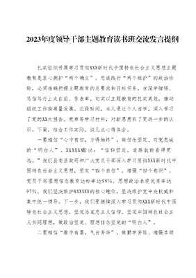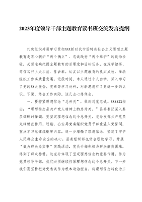 2023年度领导干部主题教育读书班交流发言提纲扎实组织开展学习贯彻XXX新时代中国特色社会主义思想主题教育是衷心拥护两个确立、忠诚践行两个维护的政治检验,必须准确把握主题教育的总要求和目标任务,在深学细悟、笃信笃行上走在前、作表率,切实以主题教育的扎实成效,推动组织工作高质量发展。近段时间,本人通过个人自学,深入学习了党的XX大报告、党章等学习材料,对新思想有了更进一步的认识。下面,结合工作实际,谈几点心得体会。一、要拧紧理想信念总开关,做到对党忠诚。XXXXXX指出:理想信念是共产党人精神上的总开关。县委书记深入基层调研时强调,要坚定理想信念这个总开关,充分发挥共产党员先锋模范作用。近期,公安局党委组织党员干部重温入党誓词,重点学习纪律规矩等内容,进一步增强了理想信念,坚定了守护人民群众生命安全的决心。县委组织部也结合理论学习,开展我为群众办实事实践活动,党员干部积极为群众解决困难,得到了群众称赞。这充分体现了坚定理想信念的重要作用。作为党员领导干部,我们必须继续拧紧理想信念这个总开关。下一步我们要坚持把对党忠诚作为根本政治担当,将理想信念转化为工作动力;要强化理论武装,坚定四个意识、增强四个自信、做到两个维护;还要发挥表率作用,带动群众坚定理想信念。二、要练好调查研究基本功,遵循实事求是。XXXXXX指出:一切工作都要从实际出发。我们县各级领导干部经常深入基层一线调研,掌握第一手资料,坚持问题导向,遵循实事求是。例如,县长多次深入农村调研,了解农田水利建设情况。通过调研发现问题,及时召开会议研究解决方案,确保农田供水保障到位。这充分体现了实事求是的工作作风。水利局也结合实际,深入河道调查研究,找出治理难点,提出针对性整治方案,保障了河道畅通。这进一步彰显了调查研究的重要作用。作为党员领导干部,我们必须继续练好调查研究这个基本功。下一步,我们要坚持深入基层调查研究,掌握第一手资料;要坚持与群众面对面,倾听群众心声;还要坚持问题导向,从实际出发遵循实事求是原则。三、要锤炼能力素养内生力,坚持干事创业。XXXXXX指出:干部要有作为,敢于担当。我们县广大党员干部勇于担当作为,锤炼过硬的能力素养,积极推动各项工作。例如,发改委在产业扶贫中,精心谋划,大力发展特色产业,去年帮助1000多户贫困户实现增收,为脱贫攻坚作出了突出贡献。这充分体现了干事创业的精神。公安局也着力提升政法队伍专业化水平,严格培训标准,加强业务技能训练,全面增强履职能力,有力保障了社会大局稳定。作为党员领导干部,我们必须继续锤炼过硬的能力素养。下一步,我们要坚持知难而进,提高驾驭复杂情况的能力;要坚持勤学善思,深入学习XXX新时代中国特色社会主义思想;还要坚持敢于担当,以钉钉子精神抓好各项工作。