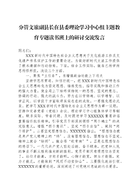 分管文旅副县长在县委理论学习中心组主题教育专题读书班上的研讨交流发言同志们:XXX新时代中国特色社会主义思想关于文化旅游工作及文化遗产传承保护工作的重要论述,为做好新时代文旅工作提供了根本遵循和行动指南。下面,结合工作实际,就自己所学所思所悟所获,浅谈三个方面。一、聚焦主任务,在增强政治功能上下功夫坚持学思用贯通、知信行统一,把XXX新时代中国特色社会主义思想转化为坚定理想、锤炼党性、指导实践和推动工作的强大力量,使全局上下始终保持统一的思想、坚定的意志、协调的行动、强大的战斗力,努力在以学铸魂、以学增智、以学正风、以学促干方面取得实实在在的成效。一要强化理论武装。把学习XXX新时代中国特色社会主义思想作为第一议题,坚持和完善党委(党组)会议、理论学习中心组集体学习等制度,联系实际、带着问题、及时跟进学习XXXXXX重要讲话重要指示批示精神,引导党员干部深刻领悟两个确立的决定性意义,增强四个意识、坚定四个自信、做到两个维护。二要坚定理想信念。XXXXXX指出,理想信念就是共产党人精神上的钙。没有理想信念,理想信念不坚定,精神上就会缺钙,就会得软骨病。正是在理想信念的感召下,一代代共产党人前赴后继、奋不顾身,把党和人民的事业不断从胜利推向新的胜利。党员干部只有理想信念坚定了,站位才能高,方向才能明,心胸才能宽,担当才能强,定力才能足,才能做到风雨不动安如山。三要强化政治引领。XXXXXX的重要论述,深刻阐述了对党绝对忠诚的内在要求,深入学习XXX新时代中国特色社会主义思想,就是要把贯彻政治路线、服务发展大局、体现社会价值作为一种品行修养来加强,一种道德操守来保持,一种思想境界来提升,学深悟透XXX新时代中国特色社会主义思想所蕴含的思想伟力和实践伟力,深刻感悟XXXXXX视察甘肃重要讲话中所蕴含的殷殷嘱托、鞭策激励和为民情怀,坚定政治立场,以党的方向为方向,以党的意志为意志,不折不扣地贯彻党的路线方针政策,坚定自觉执行中央、省市县委决策部署,在是非面前分得清,在关键时刻靠得住。二、聚焦强产业,在提升服务效能上下功夫开展学习贯彻XXX新时代中国特色社会主义思想主题教育要立足文旅发展实际,抓项目、抓融合、抓宣传,抢占疫情后文旅发展第一个关键年,让文旅市场尽早热起来火起来,助力县域社会经济发展。一要抓项目,着力提升文旅产业核心竞争力,推动产业发展。以开展项目攻坚突破年活动为契机,干当前、谋长远,一手抓今年项目建设,一手抓明年项目谋划,有效拉动固定资产投资稳步增长。立足全县发展定位,聚焦项目和产业两个重点,深入推进产业赋能行动和产业链链长制工程,争建产业项目,扩大产业规模,提升产业质效,为高质量发展蓄势赋能。以X行动为重要抓手,转变思想观念,强化招商引资政策宣传,利用各种机会,大力宣传推介我县良好的投资环境、产业定位、优惠政策、发展潜力和巨大商机,让各地各界更多地了解投资X、发展X。二要抓融合,着力延长和拓展文旅产业链,提升经济效益。推动文旅、住建、交通、农业等多部门资源、资金整合利用,真正构建综合的旅游产业集群。推动旅游演艺、主题公园、红色旅游、文化节庆会展旅游等现有融合业态转型升级、提质增效。把旅游演艺作为文化和旅游融合发展重要载体,支持国营公司、招商引进企业加强业态模式创新、数字技术应用,因地制宜打造中小型、主题性、特色类旅游演艺项目,盘活景区资源。丰富文化和旅游消费场景的产品供给,打造文化之旅,让游客把文创产品带回家。深挖中医药健康产业这篇大文章,让游客把健康带回家。加快户外运动基地建设,打造批国家级和省级户外运动基地和品牌项目,推动康养、体育与文旅融合。三要抓宣传,着力提升X影响力美誉度,撬动文旅经济发展。资金制约是目前文化旅游产业发展的瓶颈问题,自行组织大型的宣传推介困难重重,但是积极利用国家、省市组织的各类宣传平台和机遇,走出去宣传、展示,也是扩大影响和朋友圈的捷径。事实证明,在信息化时代,酒好也怕巷子深。发展文化旅游产业必须大胆地走出去,在更高层次、更广领域开展宣传推介,让更多的人认识X、接受X、走进X。今后,要深度挖掘县域文化旅游资源,加强与央视、甘肃卫视、凤凰网等主流媒体合作,邀请网络大V、摄影达人,全方位、广领域、滚动式讲述好X故事,展示好X魅力。三、聚焦严纪律,在锻造党员队伍上下功夫党章明确规定,党的各级领导干部必须信念坚定、为民服务、勤政务实、敢于担当、清正廉洁。党员是党的机体细胞,加强党员队伍建设,就要坚持党性党风党纪一起抓,推动全面从严治党向纵深发展。要打造过硬队伍,实谋不务虚。坚持新时代好干部标准,优化干部选育管用机制,引领广大党员干部白天走干讲、晚上读写想,加快填补本领赤字,努力消除知识恐慌,着力建设忠诚干净担当的