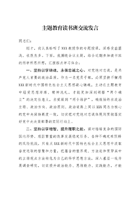 主题教育读书班交流发言同志们:刚才,我认真聆听了XXX教授作的专题授课,深感受益匪浅、收获良多。下面,我围绕会议主题,结合近期参加读书班的所学所思所想,汇报四点学习体会:一、坚持以学铸魂,永葆忠诚之心。对党绝对忠诚,是共产党人首要的政治品质。作为一名党员干部,必须坚持不懈用XXX新时代中国特色社会主义思想凝心铸魂,主动在主题教育中经受思想淬炼、精神洗礼,才能更加深刻领悟两个确立的决定性意义,自觉做到两个维护,确保始终在政治立场、政治方向、政治原则、政治道路上同以XXX同志为核心的党中央保持高度一致,切实把对党绝对忠诚体现到贯彻落实好党中央决策部署的实际行动上。二、坚持以学增智,提升履职之能。面对错综复杂的国际国内形势、艰巨繁重的改革发展稳定任务、各种不确定难预料的风险挑战,只有从XXX新时代中国特色社会主义思想中汲取奋发进取的智慧和力量,把蕴含的世界观、方法论和贯穿其中的立场观点方法转化为自己的科学思想方法,深入基层一线开展调查研究,切实提升政治能力、思维能力、实践能力,才能够有能力、有底气扎实做好推动高质量发展、服务群众、防范化解风险等各项工作,不断创造经得起历史和人民检验的实绩。三、坚持以学正风,厚植为民之情。XXXXXX始终把人民放在最高位置,多次强调坚持人民至上中国共产党根基在人民、血脉在人民。在县区工作的我们同群众联系更直接更紧密,学习XXX新时代中国特色社会主义思想,就是要牢固树立以人民为中心的发展理念,紧紧围绕群众最关心、最直接、最现实的利益问题,立足岗位职责,扎实做好职工、青年、妇女、残疾人等各项工作,用心用情用力化解好信访积案,让人民群众的获得感、幸福感、安全感更加充实、更有保障、更可持续。四、坚持以学促干,狠抓落实之效。理论学习的目的在于应用,在于指导实践、推动工作。参加主题教育,就是要把学思想和见行动结合起来,把学习XXX新时代中国特色社会主义思想的成果,转化为坚定理想、锤炼党性和指导实践、推动工作的强大力量,紧紧围绕新时代新征程党的中心任务,主动融入江西打造三大高地、实施五大战略的决策部署,积极作为、狠抓落实,以实实在在的工作成效不断为推动XX高质量发展贡献力量。发言完毕。
