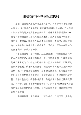 主题教育学习研讨发言提纲近期,通过院内组织学习及本人自学,认真学习了《党的XX大报告》《中国共产党章程》《XXX著作选读》等内容,更加深刻认识到新思想的真理力量和实践伟力,理解了聚焦学习贯彻XXX新时代中国特色社会主义思想主题教育,应严格按照学思想、强党性、重实践、建新功的总要求读原著、悟原理,在以学铸魂、以学增智、以学正风、以学促干上下功夫,现结合本职工作及自身实际,谈谈如下感悟。一要坚持真理、坚守理想。XXXXXX指出:理想信念是共产党人的精神之钙,没有理想信念,就没有精神支撑。理想信念是我们党立党为公、执政为民的根本出发点和落脚点。回顾历史抗日战争胜利、改革开放的推行,到实现中华民族伟大复兴的中国梦,无一不是理想信念指引下历史的必然结果。在实际工作中我们应当将理想信念作为党员干部的行动指南,合理规划区域发展,倡导绿色生态,提倡科教兴国,共建共享社会主义现代化强国。下一步,我们要不断增强理论学习,尤其是对XXX新时代中国特色社会主义思想的深入理解,以理论武装头脑,确保决策和行动的正确方向。二要不畏牺牲、实干担当。实干兴邦,空谈误国。实干是最有效的战略。XXXXXX的这一论断,为我们提出了明确的工作导向。无论是推进科技创新,还是推动经济结构调整,或是优化业务环境、强化治理能力,我们党的历史一次次证明,只有不懈奋斗和实干担当,才能让梦想照进现实。比如,在推动环境保护方面,通过严格执法、绿色发展政策导向和技术创新等举措,我们取得了显著的成效。下一步,我们要强化责任感与紧迫感,以踏石留印、抓铁有痕的决心和执着,推动各项事业在攻坚克难中迈出新的步伐。三要厚植情怀、为民服务。XXXXXX曾强调:人民对美好生活的向往,就是我们的奋斗目标。深厚的为民情怀,是我们每个党员领导干部的必修课。在城市建设、文化教育、医疗卫生等方面,通过减税降费、提供优质服务等措施,致力于改善民生、促进社会公平正义。我们的实际行动和政策落实,展现了党的宗旨和担当。下一步,我们要从民众需求出发,广泛听取民意,真正做到以人民为中心,不断推动改革开放和社会治理创新,务实解决民生问题,实现共建共治共享的社会治理格局。在持续学习和实践XXX新时代中国特色社会主义思想的过程中我们每位党员领导干部都应牢记三个要,即坚持真理、坚守理想,不畏牺牲、实干担当,厚植情怀、为民服务。这不仅是我们的行动指南,更是党和人民的共同期待。让我们共同携手,逐梦前行,为实现第二个百年斗争目标贡献力量。