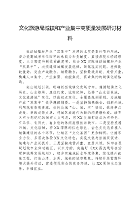 文化旅游局城镇和产业集中高质量发展研讨材料推动城镇和产业双集中发展的本质是集约节约用地,着力提高城市单位面积的承载力和贡献度,直接表现在经济强度、人口密度和税收贡献度等。结合XX实际推动城镇和产业双集中,必须遵循城镇发展规律,聚焦现实问题,发挥比较优势,突出产城融合、城景融合,坚持景城共建、建管并重,构建人口集中、产业集聚、功能集成、要素集约的城镇化新格局。突出规划引领,明确新型城镇化发展方向。遵循城镇文化历史、山水格局、底线约束、比较优势,坚持山水园林城、文化旅游城定位,以高起点定位、全覆盖规划原则,为城镇产业双集中提供遵循纲要。一是坚持城景融合,创新兴城。利用现有景观资源,依托县城山、城、河格局,做好串点成线、串珠成景文章,将城区旅游作为新的消费增长极,培育具有乡愁记忆的城市人文气息,把XX县城打造成为有特色、有品位、有历史、有乡愁的休闲度假旅游城市。二是坚持旅游兴城、文化活城。将XX深厚的红色绿色、古色文化元素植入城镇建设的各个环节,让城区文化基因更加鲜明,让游客全方位、多层次体验XX文化特色,实现文化与旅游双促进、城建与产业双提升。三是坚持建管并重,宜居兴城。科学合理规划城市主体功能区,以水为韵,实施好《XX县流域综合治理和统筹发展规划》,稳步实施城区水环境修复、绿化提升改造工程,打造山清、水秀、城美的城市景象。持续开展营商环境大提升行动,营造便民利企的政务环境,让XX更加生态宜居、幸福宜业。完善功能配套,夯实城镇化发展根基。坚持全县一盘棋,统一思想,提高认识,聚焦城区龙头不强、亮点不突出的问题,完善吃住行游购娱旅游全链条功能配套。一是以高颜值推动主城更新。以A级旅游景区标准,开展城市亮化美化行动和传统街区宜游化改造,提升城市风貌,打造一批城市公园、休闲运动场、旅游休闲街区、城市观光长廊、滨河民宿等设施,形成处处是景、时时宜游的城景一体化发展格局。二是以高标准推动短板提升。以美食一桌菜药膳一条街夜游经济集中区旅游购物集中区等为切入点,提升主城区城市功能和服务品质。鼓励酒店、民宿积极评星创牌,推动旅游服务提档升级。找准中央、省、市政策与我县发展的结合点,打造以一河两岸为中心坐标的文化旅游集聚区。三是以高品质促进城区扩容。推进以县城为重要载体的就地城镇化,提升产业平台功能,培育具有文化旅游专业功能县城和重点生态功能县城,推动县城人口集中、产业集聚,增强高质量发展的内生动力。注重产业特色,助推产城景融合发展。依托XX丰富的生态资源禀赋、深厚的人文积淀,推进以人为中心的新型城镇化,打造以山水为底色、以生态为特色、以文化为灵魂、以康养为载体、以旅游为纽带的宜业宜游宜居宜养的美丽县城。一是以供应链思维加强产的培育。做强温泉旅游产业,抓好温泉旅游头部企业的培育和引进,扶持一批中小型温泉旅游企业,对标国内一流温泉康养旅游目的地建设,打造全国知名温泉康养名城。根据文化旅游资源禀赋,培育文化体验、休闲度假、特色民宿、养生养老等产业。二是以融合发展的思维做强XX文章。实施文化强县工程,打造XX名人品牌,举办XX文化论坛,加强XX文化研究,推动文旅康养多元融合,让文化软实力成为推动美丽县城建设的硬支撑。三是以创新突破的思维拓展公共文化空间。树立以人民为中心的文化建设理念,深挖文化特色,按照规模适当、布局科学、特色鲜明的原则重新规划建设图书馆、文化馆、博物馆, 创新打造一批融合图书阅读、艺术展览、文化沙龙、轻食餐饮等服务的城市书房文化驿站等新型文化业态,营造小而美的公共阅读和艺术空间。