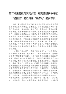第二批主题教育交流发言:在调查研究中练就能担当的宽肩膀善作为的真本领当前,第二批学习贯彻XXX新时代中国特色社会主义思想主题教育正在扎实推进。全体党员、干部要扎实弘扬四下基层优良作风,直奔基层、直击矛盾、现场应考,通过高质量调查研究,把握事物的本质和规律,摸清基层实践的急难愁盼,找到破解难题的办法和路径,努力使调查研究的过程成为理论学习向实践运用转化的过程,成为转变作风、解决问题、推动工作的过程,不断以生动实践提升主题教育的整体效果和质量。调查研究是我们党的传家宝,是谋事之基、成事之道、决策之要。广大党员干部要以真字当头,掌握调查研究这项基本功,推动调查研究往深里走、往实里走,切实提升调查研究质效。一、倾注真心思,找清痛点堵点。物有甘苦,尝之者识;道有夷险,履之者知。问题找得准不准,是调查研究实不实的基础和关键。《关于在全党大兴调查研究的工作方案》明确了12个方面调研方向,为我们找准问题指明了方向。与此同时,党员干部开展调查研究,要立足工作实际,突出重点、找准靶心、抓住关键,把调研目标剑指制约高质量发展的短板弱项和居民群众亟待解决的急难愁盼问题,对梳理出的调研提案反复进行可行性研究审核,把情况摸清、把问题找准、把对策提实,确保调研形式科学严谨,调研依据充分可靠、拟解决问题深孚众望,真正在强弱项上下功夫,在解难题上动真章,不断提出解决问题切实可行的新思路新办法。开展调查研究,必须眼睛向下、脚步向下,进万家门、知万家情,多到基层一线去,多到困难多、群众意见集中、工作打不开局面的地方去。敢于钻矛盾窝了解实情,不搞作秀式调研、盆景式调研、蜻蜓点水式调研,身入心入基层,真诚倾听群众呼声、真实反映群众愿望、真情关心群众疾苦,深入了解把握人民最关心最直接最现实的利益问题,特别是就业、教育、医疗、养老、住房等群众急难愁盼的具体问题,真正把调查研究做深做实。二、锚定真问题,使出真招实招。调查是解决问题的基础,研究是认识问题的关键。对现实情况的掌握越是全面、准确,就越能为谋划工作、制定决策提供科学支撑。问题是时代的声音,调查研究不是为了做表面文章,而是为了真正发现问题、解决问题。党员干部开展调查研究,必须转变工作作风,下高楼、出深院,常与群众打成一片、多与群众同坐一条板凳,脚下多沾泥,心里才有底。要采取四不两直方式开展调查研究,多沉到一线耳闻目睹,多走进现场心领神会,要通过对比分析有意识地选择典型案例来研究,从中找出具有共性、普遍性的规律。既要把调查做得充分详实,也要把研究做得深刻有效,真正让调查研究突出重点、直击要害,做到调查研究事半功倍、助推发展取得实效。要在深入分析思考上下功夫,去粗取精、去伪存真,由此及彼、由表及里,找到事物的本质和规律,把解决问题的思路和对策研究透彻,以钉钉子精神破解难题,善于抓住典型案例解剖麻雀,通过解剖一个问题推动解决一类问题。奔着问题去,一锤接着一锤敲,一步紧跟一步行,把一个个问题清单变为成果清单。三、下足真功夫,确保见效成效。调查研究的根本出发点和落脚点是为了实现人民群众对美好生活的向往和追求,其成效最终要体现在问题的解决上。检验调查研究成效,根本在于发现问题并解决问题。党员干部开展调查研究,要深刻认识调研不是目的,形成调研报告也不是终点,解决实际问题、服务科学决策才是调研的价值和意义所在。要通过建立调研成果转化运用清单,全程跟踪调查研究进展、及时发现好建议好办法,积极吸纳进决策、进报告、进实践,让调查研究成果转化为具有创新性、针对性、指导性和操作性的工作举措,谋划提出一批思路举措,办成一批民生实事好事,推动落实一批重点任务,挖掘形成一批典型案例,加强成果转化跟踪问效,把一个个问题清单变为成果清单,真正实现调以务实、研以致用,使调查研究成果转化为推进工作、解决问题的实际成效。广大党员干部要在深入调查研究上下大功夫,努力把调查研究成果转化为推进工作、战胜困难、服务群众的实际成效,让人民群众在主题教育中有更多获得感、更强安全感、更高满意度。