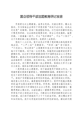 国企领导干部主题教育研讨发言开展好这次主题教育,首责在党委,关键在领导,重点在落实。作为国有企业领导干部要发扬功成不必在我、功成必定有我的精神,坚持一张蓝图绘到底,对已有的部署和规划,只要是科学的、切合新的实践要求的、符合公司发展的,就要坚持,一茬接着一茬干,不当甩手掌柜、不当二传手。关于开展好第二批主题教育,我再讲三点感受:党的十八大以来,党中央先后开展了党的群众路线教育实践活动、三严三实专题教育、两学一做学习教育、不忘初心、牢记使命主题教育和党史学习教育等5次党内集中学习教育,对于统一全党思想,加强党的全面建设发挥了重要作用。这次学习贯彻XXX新时代中国特色社会主义思想主题教育,就是以党的创新理论最新成果武装全党,是对党的政治品格的再一次锤炼。我们都知道,信党为民是X红色基因和政治本色,我们要开展好第二批主题教育,做到在大学习大普及大落实,确保各项事业始终沿着正确方向前进。一是开展本次主题教育,对于激励党员干部担当作为,实现高质量发展具有重要意义。XXXXXX强调,要教育引导广大党员干部学思想见行动,不断提高推动高质量发展的本领。当下,房地产市场面临着各种风险和挑战,我们要深刻认识到,越是重大历史关头,越要重视和抓紧学习,要牢牢把握主题教育的12字总要求抓好学习贯彻。学思想,就是要全面系统深入学习XXX新时代中国特色社会主义思想,完整准确掌握这一重要思想的主要内容,全面把握这一重要思想世界观、方法论和贯穿其中的立场观点和方法,不断深化对党的创新理论的认识和把握。我们班子将组织不少于7天的读书班,通过理论学习和知识转化,提升运用党的创新理论研究新情况,解决新问题的能力,把党的创新理论转化为准确预判形势、抓住政策窗口期,奋力攻坚去化、补充优质项目的生动实践。各党支部也要通过三会一课、党团活动日等形式,慎终如始推进主题教育,做到全员受教育、全面受教育、深刻受教育。强党性,就是要锤炼对党绝对忠诚的政治品质,把讲政治作为第一原则,把政治过硬作为第一要求,自觉在思想上、政治上、行动上同以XXX同志为核心的党中央保持高度一致,始终坚守保国利民的初心,永葆XX人的政治本色,让红色基因代代相传。重实践,就是要突出实践导向,强化问题导向,下力气大兴调查研究之风,我们的班子要主动下沉一线,找到准心,对准靶心,对难销项目去化、资产运营能力突破、产品与服务提升等制约公司发展的瓶颈问题和职工群众反映强烈的现实问题,拿出真招实策。建新功,就是要在主题教育中汲取奋发进取的智慧和力量,全面推进改革发展和党建各项工作,引导各级党组织和党员干部打头阵、攻难关、勇担当、做贡献,奋力谱写中国式现代化的X篇章。二是聚焦目标任务,着力破解瓶颈问题。此次主题教育不划阶段不分环节,要把理论学习、调查研究、推动发展、检视整改等贯通起来,有机融合一体推进。要将主题教育与中心任务相结合、将理论学习与班子建设相结合、将调查研究与体系化建设相结合、将检视整改与专项任务相结合,聚焦组织能力和管理能力提升,构建发展之树管理系统,深入推进四大专项行动,苦练内功打牢发展基础,切实将主题教育成果转化为推动高质量发展的实招实效。第二批主题教育关键在于行动。我们要运用好调查研究这个法宝来破解发展难题,9至11月份我们的班子成员要主动下沉一线,到生产工地、销售案场开展调研,调研过程中,要聚焦在存量去化、资产盘活、安全生产等方面的重难点、硬骨头问题,开展深入的调查研究,去的时候要奔着问题去,更要带着思考回,调研的目的是为了解决问题而调查,不是为调查而调查,防止形式主义。我们还要把检视整改贯穿始终,把学习找到的差距、行动对标的不足举一反三,从解剖一个问题推动解决一类问题。特别是很多问题都是共性问题,比如低效资产盘活、合作风险管控等问题,有好的解决方式方法,要形成经验共享,两家公司也可以多多交流。同时,各专业条线要左右协同、上下贯通,形成一个好的沟通机制,在这方面党委班子、各分管领导要发挥更大作用。三是强化责任担当,扎实推进主题教育取得实效。今年是贯彻党的XX大精神的开局之年,是实施公司十四五规划承上启下的关键之年,也是爬坡过坎的关键一年。这次主题教育时间紧、任务重、要求高,特别横跨岁末年初,是我们任务最重压力最大的时候,这个阶段更需要通过理论武装、统一思想、坚定意志、狠抓落实。在关键时刻,在座的关键少数要通过示范打样带动绝大多数,让党员干部受教育、职工群众得实惠。各党支部要提高政治站位,强化政治担当,周密安排、狠抓落实,做到认识到位、组织到位、措施到位,确保主题教育高起点启动、高标准推进、高质量落实。