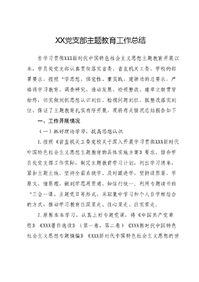 XX党支部主题教育工作总结自学习贯彻XXX新时代中国特色社会主义思想主题教育开展以来,学员处党支部认真贯彻落实省委、省直机关工委、学校的部署要求,按照学思想、强党性、重实践、建新功的总要求,严格将学习教育、调查研究、推动发展、检视整改、建章立制贯穿始终,切实做到抓思想认识到位、检视问题到位、抓整改落实到位,保证了主题教育扎实有序开展,现将有关情况总结报告如下一、工作开展情况(一)抓好理论学习,提高思想认识1.按照《省直机关工委党校关于深入开展学习贯彻XXX新时代中国特色社会主义思想主题教育的具体实施方案》要求,结合学员处党支部工作实际,制定主题教育学习计划,列出学习清单,紧扣主题主线、坚持全面系统学、及时跟进学,坚持读原著、学原文、悟原理,做到学思用贯通、知信行统一。利用专题读书班三会一课、主题党日等形式,采取集中学习和个人自学相结合的方式,推动学习教育往深里走、往心里走、往实里走。2.原原本本学习,认真上好专题党课,将《中国共产党章程》《XXX著作选读》(第一卷、第二卷)《XXX新时代中国特色社会主义思想专题摘编》《XXX新时代中国特色社会主义思想的世界观和方法论专题摘编》《XXX关于调查研究论述摘编》《论党的自我革命》《XXXXXX视察吉林重要讲话重要指示精神摘编》、党的XX大精神、XXXXXX在主题教育工作会议上的讲话、XXXXXX在中央党校建校90周年暨2023年春季学期开学典礼上重要讲话精神列为重要学习内容,做到时常翻阅、重点标注、加强识记、强化交流。要求支部全体党员原原本本学原著、读原文、悟原理,把必学文件和必读书目学深悟透、入脑入心,及时跟进学习XXXXXX最新重要讲话和近期关于主题教育工作的重要指示批示精神,进一步理解核心要义和实践要求,强化理论武装,增强政治自觉。先后组织集体学习18次暨理论学习中心组学习(扩大)会17次,省委领导讲党课1次,工委领导讲党课1次,校长讲党课1次,专家学者讲党课2次,支部书记讲党课1次。处级干部参加读书班1期。全体党员通过学习强国、e支部吉林干部网络学院等网络平台积极开展自学,学习《XXX新时代中国特色社会主义思想30讲》等内容,实现了学习重点全覆盖,切实提高了全体党员的政治素养和理论水平,打牢了主题教育的理论之基。3.丰富载体促学。一是加强爱国主义教育,弘扬爱国主义精神,结合主题党日,组织党员前往东北沦陷史陈列馆,开展学习贯彻XXX新时代中国特色社会主义思想主题教育;组织党员收看《奋进新时代》专题片,观看电影《望道》;在庆祝中国共产党建党102周年之际,校机关党委组织开展了践行使命心向党携手共谱新篇章主题党日活动。通过爱国主义教育,广大党员干部提高了政治觉悟,坚定了对马克思主义的信仰、对中国特色社会主义的信念,进一步振奋精神,鼓舞士气,传承红色基因,不忘初心,砥砺前行。(二)结合工作实际,开展调查研究按照《省直机关工委党校关于大兴调查研究的具体方案》要求,处级干部均制定了调研方案,并结合调研课题《新时代学员管理工作的政治责任和使命担当》展开调研。突出问题导向和目标导向,结合工作实际,通过开展谈心谈话、组织召开学员座谈会、学员个别访谈和电话问询等方式,围绕目前的学员管理方法是否适应新时代党员干部培训工作;是否存在工学矛盾问题;如何提高班主任的管理水平;如何管理与服务齐头并进等问题展开深入调查,找准学员管理中存在的突出问题,经分析研判找出问题产生的原因和解决方法,提高学员管理水平,有效服务于党校中心工作。调研结束后,认真梳理问题,提炼经验做法,分析短板不足,形成了调研报告。通过调查研究,全力破解学员管理中存在的难题和新问题,取得了良好成效。(三)主题教育成果转化在主题教育过程中,党支部深入贯彻落实XXXXXX在主题教育工作会议上的重要讲话,XXX在中央党校建校90周年庆祝大会暨2023年春季学期开学典礼上重要讲话精神,坚持把学思想、强党性、重实践、建新功的总要求贯穿全过程,聚焦主责主业,把主题教育与重点工作有机结合起来。一是持续加强支部的战斗堡垒作用。高标准完成BTX日常维护工作;按照机关党委的要求,及时完成支部星级达标工作;积极参加我为群众办实事主题实践活动;5名在职党员完成年度微心愿认领。二是持续推进学员管理服务工作。通过主题教育,一直以来在学员管理过程中存在的突出问题和学员关心的问题得到了有效解决。大家普遍反映,看到主题教育能够真刀真枪解决问题,自己受到很大触动,今后工作中将把全心全意为学员服务植根于思想中,落实到行动上,着力解决学员最关心的问题,为学员营造良好地学习环境,以优质的服务去影响学员、感染学员。(四)认真检视问题,推动立行立改按照《省直机关工委党校学习贯彻XXX新时代中国特色社会主义思想主题教育检视问题工作方案》要求,全体党