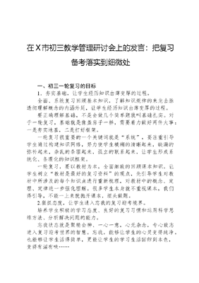 在X市初三教学管理研讨会上的发言:把复习备考落实到细微处一、初三一轮复习的目标1.夯实基础,让学生经历知识由薄变厚的过程。全面、系统复习回顾基本知识,了解知识规律的来龙去脉透彻理解概念的内涵外延,让学生经历知识由薄变厚的过程。要正确理解基础,不是会做几个简单题就叫基础扎实。对于一轮复习,基础就是像盖房子一样,需要着力做好两件大事:一是夯实地基,二是打好框架。一轮复习很重要的一个关键词就是系统,要注重引导学生通过构建知识网络,努力使学生模糊的清晰起来,缺漏的弥补起来,杂乱的条理起来,孤立的联系起来,让学生形成系统化、条理化的知识框架。一轮复习,要以教材为本,全面细致的回顾课本知识,让学生树立教材是最好的复习资料的观点,先引导学生对教材中所涉及的每个知识点进行重新梳理,对教材中的概念、定理、定律进一步强化理解。很多学生本身就不重视课本,我们得引导,不能一上来就抛开课本,埋头做题。2.狠抓态度,让学生进入忘我的复习迎考境界。培养学生积极的学习态度、良好的复习习惯和运用科学思维方法、分析解决问题的能力。忘我状态就是聚精会神、一心一意,心无杂念,专心致志进入复习迎考世界的智慧。忘我,能够让学生的心灵变得纯净,也能够让学生活得简单,更能让学生的学习生活回归到本色,变得有滋有味……引导学生形成良好的解题习惯,培养学生扎实的考试能力落实学生解题的三重境界:一是解,就是想尽一切办解决当前问题。二是思,就是解题后的回顾和反思,总结解题经验和方法。三是归,就是获得的知识经验与书本知识联系起来,回归到中考能力要求上去。解题上强化学生落实三个字:慢(审题),快(书写),全(要点全面,答题步骤规范)。3.紧盯短板,让学生每一天、每一课都有获得感。有计划、有步骤、有措施地指导学生补齐短板。一轮复习尽管强调基础,但依然要突出重点,切忌主次不分,无的放矢,导致复习不深不透,浅尝辄止,蜻蜓点水,雾里看花。为此,教师要在精讲上下足功夫。抓住学情,讲难点重点、易混点、薄弱点;讲思路、技巧、规范;讲到关键处,讲到点子上,讲到学生心里去。题是永远讲不完的,学生也不是讲了就能会的。一轮复习紧盯短板,就是要坚持问题导向聚焦弱项。从年级、备课组、老师都要发现并确立备考需要着力解决的问题。年级思考如何在学生常规管理上求提升,如何在学生分类推进实效性求突破,如何在学生心理调适、考试习惯培养上求突破等。备课组如何在科学备考精准度上求突破。班级如何在班风学风建设上求突破。教师如何在学生知识落实不到位和学科思维能力欠缺上求突破,如何在课堂教学效能最大化求突破,特别是课堂不能只顾完成教学任务不顾学习效果、只求进度不求实效,课堂内容浅、节奏慢,缺乏限时高效训练,针对性差等问题。二、初三第一轮复习的实施1.解决好复习课以及讲评课耗时高、效率低的问题。复习课是第一轮复习中最主要的课型,初三复习后面的轮次中都用到它,我们准备采取如下措施:确定复习内容,设计必要的练习题。复习内容的确定,一般要以课为单位,确定复习内容的依据有四条:文可居文库——海量学习资料,手机电脑均可下载www.wenkeju.com(1)根据教材确定复习内容,教师一定要进一步深入吃透教材,特别要注意发现新授课的遗漏之处以及处理欠妥当的地方,即使复习同一内容,也要尽可能变换角度,变换方法、更好地拓宽学生的思路,启发学生的思维。(2)根据课程标准确定内容,教材内容要同课程标准和南通市中考要求要求进行对照,课程标准和南通市中考要求有要求的,要确定下来;没做要求的,不去花费时间。(3)根据中考题的特点确定重点,对近几年的南通市中考题进入深入研究,总结出南通市中考命题的一般规律,找到中考的重点和热点,并以此作为复习重点。(4)根据学生的实际情况确定重点,深人研究学生,准确把握学生的不足之处,并以此作为复习的重点,是增强复习的针对性,提高复习效率的一个关键。2.解决好目标学生的培优、后进生的帮困问题。建构主义认为,学习不是教师向学生传递知识的过程,而是学生自己建构知识的过程;学生不是被动的信息吸引者,而是信息意义的主动建构者,这种建构不可能由其他人代替。为此,在一轮复习中,我们强调两点:一是帮助学生认识自己,找到目标。威廉·戴蒙将其数十年的研究,归结为一句话:目标对于青少年发展,具有头等重要性。人生有价值的奔赴,都以树立目标为前提。有目标和无目标学习之间的区别,就是豪情万丈建造自己的城邦和日复一日枯燥垒砖的区别。帮助优秀生认识自己的不足,完善自我;帮助后进生清晰自己问题,发展自我。帮助这类学生学生培养内驱力,自主学习能力。每个班级要成为个性化的赋能平台,赋的就是自我驱动、自我激励的习惯,以及自主建构、自主学习的技能。只有这样,才能真正实现从教走向学,完成以学习者为中心的转