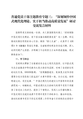 普通党员干部主题教育专题三:深刻领悟中国式现代化理论,实干担当推动高质量发展研讨交流发言材料按照局党支部的统一安排,本人紧紧围绕专题三深刻领悟中国式现代化理论,实干担当推动高质量发展这一主题,牢记新时代新征程党的中心任务,胸怀国之大者,认真学习《纲要》和《摘编》等指定书籍,全面梳理检视自身存在问题,深入剖析问题产生原因,并明确了今后的努力方向和改进措施。现对照检查如下:一、学习体会党的XX大擘画了全面建设社会主义现代化国家、以中国式现代化全面推进中华民族伟大复兴的宏伟蓝图,吹响了奋进新征程的时代号角。XXXXXX强调:实现强国建设、民族复兴宏伟目标需要全党全国各族人民包括广大青年团结一致、全力以赴,继续爬坡过坎、攻坚克难。中国式现代化的建设与中国青年的发展高度统一,相辅相成。中国式现代化为新时代的青年党员干部提供了奋进向上的动力,提供了干事创业、实现人生价值的舞台。中国式现代化建设也离不开青年党员干部的参与、推动和实践,新时代的青年党员干部在实现第二个百年奋斗目标的历史进程中理所当然是参与推进强国建设的生力军,是实现中国式现代化不可或缺的力量。作为新时代的青年党员干部就应该坚定理想信念打牢人生根基,坚持中国共产党的全面领导,捍卫两个确立做到两个维护,内化于心、外化于行,融入血脉、融进实践要始终坚持党和人民事业高于一切,为党分忧、为国尽责、为民奉献,以实际行动诠释对党的绝对忠诚。要勇敢走在时代前列,勇担青春使命,把小我融入大时代,发挥党员先锋模范作用,把青春播撒在民族复兴的征程上,把忠诚书写在党和人民事业中,在推进强国建设中追寻信仰之光,以青春之我创建青春之国家、青春之民族、青春之未来。二、存在的问题(一)对中国式现代化理论的领悟还不足。一是真学深学还不够。对于习XXX提出的中国式现代化这一创新理论,跟进领悟的不够好,仅限于原文学习了,在悟原理上还存在不足,没有做到真正用中国式现代化的理论精髓武装头脑。二是内化转化还有差距。存在学用脱节现象,没有真正使中国式现代化的创新理论进入思想、进入工作,内化为拓宽自己的政治视野、清醒敏锐的政治眼光、立场坚定的政治素养的能力。学习成果结合运用不够,没有完全做到凡事都自觉用XXX新时代中国特色社会主义思想指导全过程。(二)对国之大者的认识存在偏差。一是思想上自觉还不够。虽然能够牢固树立四个意识、坚定四个自信、做到两个维护,始终保持政治立场不移、政治方向不偏,但还没有完全做到凡事都自觉用XXX新时代中国特色社会主义思想指导全过程。二是对指示精神理解不到位。虽然能牢牢把握XX工作姓党的根本政治属性,但有时对上级的部署要求,站位不够高理解不够透,执行起来容易出现偏差,有时过多地强调客观条件存在一定程度的实用主义倾向。(三)树牢正确的事业观还有差距。一是干事创业干劲不足作为党员干部面对新要求新任务,如何运用中国式现代化这一创新理论有效提高自己所负责的办公室工作方面方法措施还不多、针对性不强,争创一流的精气神不足,主动担当解决问题的魄力不够,求稳有余,闯劲不足,在工中上有时还存在小进则满的情绪。二是奉献干事觉悟不够。在工作中,心怀国之大者做的不够,强调中心工作多,对基础性工作过问的少,对业务素质、完成工作关注比较多,对党性修养、道德品质等方面强调比较少正确的事业观存在时紧时松,不能一严到底、久久为功。三、原因分析(一)理论学习还不够系统深入。对XXXXXX提出的中国式现代化的深刻内涵学习领会还不系统、不深入、不全面,未能完整、全面、准确掌握这一创新理论的道理学理哲理,做到既知其言、更知其义,既知其然、更知其所以然。学用结合不紧密,用中国式现代化这一创新理论深化认识,汲取力量、提升本领的能力还不够。(二)政治素质还不够过硬。深刻领悟中国式现代化的科学内涵有差距,运用牢固树立正确的事业观改造主观世界的力度不够,在提升政治站位、强化思想认识,加强政治历练、提升政治本领上还存在不足,不善于从政治上观察、思考、解决问题的习惯。对社会上出现的一些错误言论,缺乏斗争精神,存在畏难情绪,没能旗帜鲜明地坚决予以制止。(三)担当作为还不够主动。未能做到胸怀国之大者,缺乏攻坚克难的志气、敢闯敢试的锐气和大胆负责的勇气,满足于完成既定的任务,创造性开展工作的思路不够开阔,办法不够多。主动担当的能力不足,敢写敢拼敢试的锐气和积极主动作为的劲头。四、努力方向和改进措施(一)提升政治能力,增强工作实效。始终把旗帜鲜明讲政治放在首位,深刻领会中国式现代化的深刻内涵,提高政治判断力,深入理解推进中国式现代化的理论逻辑、历史逻辑和实践逻辑,激励自己自信自强,增强四个意识、坚定四个自信、做到两个维护。严格遵守党的政治纪律和政治规矩,把讲政治贯穿于党性锻炼全过程,严肃
