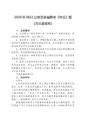 2020年0822公务员多省联考《申论》题(河北县级卷)一、注意事项1.本试题由给定资料和作答要求两部分构成。考试时限为150分钟。总分100分。2.请在题本、答题卡、草稿纸指定位置上用黑色字迹的钢笔或签字笔填写自己的姓名和准考证号,并在答题卡上用2B铅笔将准考证号对应的数字涂黑。3.请用黑色字迹的钢笔或签字笔在答题卡指定的答题区域内作答,超出答题区域的作答无效。4.所有题目一律使用现行规范汉语言文字作答,未按要求作答的不得分。5.监考人员宣布考试开始后,考生方可答题。监考人员宣布考试结束时,考生应立即停止作答,将题本、答题卡和草稿纸都翻过来留在桌上,待监考人员确认数量无误、允许离开后,方可离开考场。严禁折叠答题卡!二、给定材料材料1L县是国家级贫困县,过去师资力量和办学条件整体比较落后。L县一中是该县的重点中学,高考成绩却不是很理想。其实我们的孩子都很想学,也很勤奋,但总体成绩就是不如大城市的孩子。L县一中吴校长说,每当在电视、网络上看到大城市优越的教学条件,孩子们都梦想着能接受和大城市同龄人一样的教育,进行公平的竞争。随着国家对教育公平的重视和教育信息化大潮的推动,同时得益于近几年脱贫攻坚进程的加快,L县一中的软硬件条件如今都得到了较大提升。L县教育局经过反复调查研究,决定在L县一中设立网络直播班,选定一家资质较好的网络教育公司,同步直播省城重点中学七中老师的课堂教学,学生跟着省城七中的同学同步上课、同步作业、同步练习。在网络直播课程中,每门课都有线上线下两位老师,线上的是省城七中的老师,负责课堂授课,授课内容和进度也都以省城七中为准。线下的是L县一中的老师,他们除了课前准备、课间讲授,还需要在课后和没有跟上的同学一起查漏补缺。罗同学是L县一中的高三学生,他对自己刚接触网络直播课程时的情形记忆犹新。刚开始接触直播教学,那边的教学特点就是密度大,知识面覆盖广。有些不适应,感觉差距还是比较大。罗同学说,这种教学模式就像是6门学科有了12名指导老师,他们那边问什么我们就回答什么,一开始觉得有点儿怪,慢慢发现你答的跟那边也差不多,你会发现已经跟上那个课堂了,当时还是有点兴奋,自信心也上来了。网络直播班班主任杨老师认为,新的教学模式除了带来成绩上的提高,更多的是给了学生参照和动力。他们会觉得在追梦的路上自己和省城七中的同学享有了均等的机会,剩下的就看自己的奋斗了。从三年前最初引入一个班试点,逐渐发展到现在15个网络直播班700多名学生上课,越来越多的学生参与到了网络直播教学中。对网络直播班的教学效果,L县教育局王局长介绍说,今年高考成绩发布后,网络直播班本科上线率达到了93%,一本上线率达到了59%。虽然这个功劳并不能只归功于网络直播课程,但毫无疑问,网络直播课程在很大程度上带来了积极改变。对网络直播课程的效果,何同学有另外的感受。她也是L县一中网络直播班的学生,去年毕业考入了一所名牌大学。回忆在网络直播班学习的经历,她说,要说高考增加多少分,可能不是特别明显。但是从省城七中师生身上我学到了很多东西,也打开了我的视野,让我有了清晰的目标,考一个什么样的大学,想去什么样的地方。这好像是一道光,它照亮了我的梦想,让梦想变得明亮清晰。网络直播授课的模式是互联网+教育的产物,在一定程度上打破了地区和学校之间的资源壁垒,实现了优质教育资源跨时空整合、配置和流转。吴校长认为这对教师来说也是锻炼和学习的机会,我们的教师逐年分批地进入这种教学模式里锻炼,并且把省城七中的资源本土化,让它更适合我们自己的学生。在这个过程中,我们教师的教学水平也得到了提升。但吴校长还认为,技术和模式都有一定的局限性,关键还在于教师。L县一中网络直播课程为什么效果好,是因为对课堂教学没跟上的学生,本地教师课后会再进行教学辅导。这些教师非常累,他们上直播班的工作量,是上普通班工作量的三倍,很多教师还要连续加班带晚自习。这对教师的责任心是一个考验,也对教师队伍的管理服务工作提出了挑战。对于网络直播教学模式能否大规模推广,惠及更多学生,王局长坦言,目前还存在很多困难。网络直播教学的资源总量还是很有限,主要集中在语文、数学和英语课上,还有很多课程没有实现资源共享。即便如此,一个网络直播班的费用平均一年也要七万元左右。如果覆盖到乡村,还要铺设网络、增添设备,支出就更大了。不过,只要能切切实实帮助到孩子们,我们还是要想办法去做。材料27月17日凌晨,S公司总裁张总发布一条朋友圈,写道:公司里有些部门有了权力,不是为客户服务,而是变成寻租的工具,这完全违背公司的基本价值观和文化,要用最锋利的刀子将这些腐烂的肉切掉。就在同一天另一家民营企业的三名高管因涉嫌非国家工作人员受贿罪,被警方刑事拘留。该公司还披露过一组反腐数据:2018年,公司