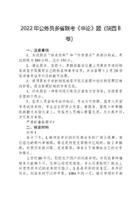 2022年公务员多省联考《申论》题(陕西B卷)一、注意事项1.本试题由给定资料和作答要求两部分构成。考试时限为180分钟。总分150分。2.请在题本、答题卡、草稿纸指定位置上用黑色字迹的钢笔或签字笔填写自己的姓名和准考证号,并在答题卡上用2B铅笔将准考证号对应的数字涂黑。3.请用黑色字迹的钢笔或签字笔在答题卡指定的答题区域内作答,超出答题区域的作答无效。4.所有题目一律使用现行规范汉语言文字作答,未按要求作答的不得分。5.监考人员宣布考试开始后,考生方可答题。监考人员宣布考试结束时,考生应立即停止作答,将题本、答题卡和草稿纸都翻过来留在桌上,待监考人员确认数量无误、允许离开后,方可离开考场。严禁折叠答题卡!二、给定材料材料1每天下午,L镇刘家卓村的村民都会来到广场上跳舞。他们经过的路叫幸福路,路名是村党支部杨书记起的。除了幸福路,村里还有振兴路、党史路等,每条主干道都有自己的名字和路长。上世纪80年代,刚刚包产到户的刘家卓村,村民依靠种植粮食只能糊个口。怎样让村民吃得饱,手头还宽裕呢?刚当上村党支部书记的老李绞尽脑汁。S县是苹果的适生区,李书记笃定,刘家卓村可以种苹果。1984年的一天,他在带领村干部考察了杨陵、眉县和外省的苹果园后,下决心引进了新苗子,并带头载种。此后的三年,是刘家卓的产业走向巅峰的开端。平整土地、栽苗子、起围墙、打井存水……最高潮时,全村5200亩土地,有4000亩都种上了苹果。80年代末,刘家卓的苹果进入丰产期。集中连片的红苹果,引来大批客商。村民靠卖苹果和树苗,迅速致富,村集体也赚得盆满钵满。当年,刘家卓村上缴的农林特产税达60万元,超过了另外三个乡镇的税收总和。2001年,村委会换届选举,小董当选为新的村委会主任。当时,群众的腰包鼓了,但村容村貌却成为一个明显的短板。董主任四处争取项目、组织捐款,甚至自己垫资,把废旧宅基地收回,修村道、建广场、搞绿化,又是热火朝天的几年。只有自己变好才能吸引政府、社会瞩目,刘家卓一直在努力表现自己。董主任说。当时看似在基础设施上下了不少功,其实是他看到产业发展面临的问题,硬件建设为高标准的产业发展创造了条件。种苹果的人多了,也就不像之前那么赚钱了,有的村民坚持不住,把果树拔了,苹果树的种植面积也从高峰时期的4000亩降到了2800亩。不少农民放下土地,离开了刘家卓村。下一步该如何发展?董主任有了发展设施农业的想法。不久,他遇到了正想搞大棚西红柿的小王,两人一拍即合,旭峥贸易有限责任公司随之诞生。投资1500万元,流转土地500亩,架起大棚150座。大棚里种上各种反季节蔬菜、水果……旭峥公司致力于培育自己的蔬菜品牌,他们从外地引进水果西红柿品种,经过三年精心培育,才达到汁水饱满、口感酸甜适中的程度。2020年,第一茬水果西红柿上市,很快卖到全国各地,打入高端市场。装箱销售的西红柿,5斤多可以卖到68元的高价。如今的旭峥公司已经流转1800亩土地,建起280座大棚,组织成立了蔬菜专业合作社和苹果专业合作社,带领358户农民发展绿色有机农业,带动农村贫困户和富余劳动力260余人。为了不断促进群众增收,壮大村集体经济,董主任通过各方筹措资金,紧随旭峥公司建起18座大棚,再承包出去,一段时间内,十多户村民依靠大棚脱贫致富。然而随着时间的推移,这18个大棚已经年久失修,近两年村集体一直在垫资运营,已然不是长久之计。2019年,年轻的小杨成为刘家卓村的党支部书记。在大棚的去留问题上,有的村干部建议直接推平,把土地还给村民,但杨书记认为,大棚建起来不容易,如果能争取到项目,对大棚进行加固改造,重新经营,那是最好不过的事。这个想法得到L镇的大力支持,在多方协调下,2021年,刘家卓村完成了5个大棚的结构改造。一番商议后,村上以每座3500元的价格出租给返乡创业的大学生种植樱桃树。2022年春,正值大棚樱桃春季管理的关键时期,村民们在给樱桃树修枝、浇水、授粉。今年樱桃树第一年挂果,他们会格外上心,3月底樱桃就可以成熟上市了。时下,乡村正迎来难得的发展机会,刘家卓村的历任村干部接力谋发展,村民敢闯、敢试、敢为人先,二者劲往一处使,这些正是乡村振兴所必需的。L镇党委潘书记说。材料2这天,在桐城街道驿道社区,30多名老人在社工的带领下,围在一起做风筝,今年76岁的赵大爷正专心致志地给风筝涂上自己喜欢的颜色。赵大爷说,我们不出社区,就能与老伙伴摆摆龙门阵,唱唱歌、跳跳舞,感觉日子过得很充实,越活越精神,越活越高兴。螺蛳壳里做道场,驿道社区嵌入式养老服务中心场地虽小但功能复合,配套了无障碍通道、理疗间、多功能室、助餐室、护理间、康复室等,适应了养老服务多层次、多样化的要求。我们积极开设老年课堂,每个星期都会提前把每一堂课的时间和内容以课程表的方式排好,轮流开展。我们的活动有趣