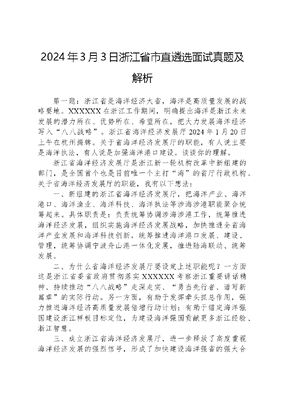 2024年3月3日浙江省市直遴选面试真题及解析第一题:浙江省是海洋经济大省,海洋是高质量发展的战略要地。XXXXXX在浙江工作期间,明确提出海洋是浙江未来发展的潜力所在、优势所在、希望所在,把大力发展海洋经济写入八八战略。浙江省海洋经济发展厅2024年1月20日上午在杭州揭牌。关于省海洋经济发展厅的职能,有人说主要是海洋执法,有人说是加强海洋港口建设。谈谈你的理解。浙江省海洋经济发展厅是浙江新一轮机构改革中新组建的部门,是全国首个也是目前唯一个主打海的省厅行政机构。关于省海洋经济发展厅的职能,我有以下想法:一、新组建的浙江省海洋经济发展厅,把海洋产业、海洋港口、海洋渔业、海洋科技、海洋执法等涉海涉港职能聚合统筹起来。具体职责是:负责统筹协调涉海涉港工作,统筹推进海洋经济发展,组织实施海洋经济发展战略,加快推进全省海洋产业发展和海洋科技创新,统筹推进海洋港口发展、建设、管理,统筹协调宁波舟山港一体化发展,推进陆海联动、统筹发展。二、为什么省海洋经济发展厅要设定上述职能呢?一方面这是浙江省委省政府贯彻落实XXXXXX考察浙江重要讲话精神、持续推动八八战略走深走实、勇当先行者、谱写新篇章的实际行动。另一方面,有助于发挥牵头抓总作用,强力推进海洋经济高质量发展倍增行动计划;有助于锚定海洋强国建设浙江样板目标定位,为建设海洋强国贡献更多浙江经验、浙江智慧。三、成立浙江省海洋经济发展厅,进一步释放了高度重视海洋经济发展的强烈信号,形成了加快建设海洋强省的强大合力。而海洋强省建设是一项系统工程,作为省海洋经济发展厅,要充分发挥职能作用,找准抓实建设海洋强省牵一发动全身的重要抓手,开好局、起好步。四、具体来说,我认为一是建立系统思维。找准浙江海洋经济发展的战略坐标,对全省海洋发展进行系统谋划、顶层设计,制定海洋经济发展规划,谋划推进重大改革、重大政策、重大平台、重大项目。二是建立改革思维。深入剖析海洋经济高技术、高投入、高风险、长周期等特点难点,找准问题关键所在,从体制机制创新寻求破局之道,为全国贡献海洋经济发展制度性经验和创新性成果的浙江样板。三是建立底线思维。坚持人民至上、生命至上理念,坚决守牢海上安全底线,统筹好发展与安全两件大事,以高水平安全保障高质量发展。海洋是浙江的最大优势、最大潜力、最大发展空间,海洋经济前景广阔、大有可为。省海洋经济发展厅要切实扛起主体责任,构筑硬核力量,推动海洋经济整体跃升。第二题:公共服务七优享工程,即幼有善育、学有优教、劳有所得、病有良医、老有康养、住有宜居、弱有众扶,是浙江省政府十项重大工程之一。为健全基本公共服务体系、提高公共服务水平,提供高标准指引,引领公共服务托起老百姓稳稳的幸福。有人说公共服务七优享工程建设要体现标准化和差异化,你怎么看?公共服务七优享工程建设,为浙江两个先行提供有力支撑,让公共服务更为优质、普惠、均衡。关于公共服务七优享工程建设要体现标准化和差异化,我是积极支持的,我认为要将标准化、差异化同步推进。首先,一方面,标准化是提供高质量公共服务的基础环节矩不正,不可为方;规不正,不可为圆。标准化,带来了服务质量的统一与提升。另一方面,差异化是提供高质量公共服务的优化环节。随着经济社会的发展,人们个性化需求也日益增加。比如,人们希望享受到个性化的医疗服务;在教育领域,真正实现因材施教等。其次,为什么说公共服务七优享工程建设要体现标准化和差异化呢?一是标准化服务容易陷入僵化,缺乏灵活性和创新性;标准化服务可能使公共资源分配不均衡,造成资源过度集中。二是差异化服务缺乏一定的规范和制度保障,容易导致服务质量和公正性的问题;差异化服务难以推广和复制,某些服务只适用于个别个体。三是标准化作为公共服务的底线,为差异化提供了标准,促其合理发展;差异化满足不同的个人需求,使公共服务在标准化基础上获得新的发展。再次,浙江公共服务七优享工程建设旨在打造更多突破性、标志性的公共服务成果,使公共服务现代化建设走在前列。为此,我们必需推动标准化和差异化融合发展,提升公共服务质量。最后,具体来说,可以从以下方面努力:一要优化标准化服务。将标准化全面融入幼有善育、学有优教、劳有所得、病有良医、老有康养、住有宜居、弱有众扶各领域,构建特色鲜明、结构清晰的公共服务七优享标准体系。二要完善差异化服务。明确差异化服务的评价指标,加强监管和评估,避免随意性;发挥社会组织、大数据技术等作用,把握人民群众对美好生活多层次需求,动态调整、优化基本公共服务供给结构。三要加强对公共服务人才的培养。通过开展培训和培养计划,提高公共服务机构和人员的专业化水平;提供更多的发展机会,鼓励人才向公共服务行业转移。推动标准化和差异化的融合发展,是提高政府公共服务质量的必由之路。