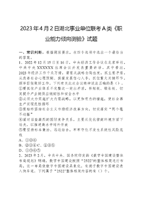 2023年4月2日湖北事业单位联考A类《职业能力倾向测验》试题一、常识判断。根据题目要求,在四个选项中选出一个最恰当的答案。1、2022年12月15日至16日,中央经济工作会议在北京举行,中共中央XXXXXX出席会议并发表重要讲话。其中看出,2023年经济工作千头万绪,需要从战略全局出发,抓主要矛盾,从改善社会心理预期、提振发展信心入手,抓住重大关键环节,纲举目张做好工作。下列有关此次会议精神说法正确的是()。①要抓住产业体系不完整这一突出矛盾,补短板、锻长板、切实提升产业链供应链韧性和安全水平②必须大力实施扩大内需战略,以更加有力的措施,使社会再生产实现良性循环③要始终坚持社会主义市场经济改革方向,切实落实两个毫不动摇④面对日益激烈的国际竞争关系,主要从优化营商环境方面下功夫,以推进高水平对外开放⑤要坚持标本兼治、远近结合,牢牢守住不发生系统性风险底线A、①②④B、②③④C、②③⑤D、①③④⑤2、2023年2月,中共中央、国务院印发的《数字中国建设整体布局规划》明确,数字中国建设按照2522的整体框架进行布局,这一布局使数字中国建设具象化,有助于数字中国建设进入快车道,下列属于2522整体框架内容的有()个。①夯实数字基础设施和数据管理体系两大基础②推进数字技术与创新、协调、绿色、开放、共享五大发展理念相结合③强化数字技术创新体系和数字安全屏障两大能力④优化数字化发展国内国际两个环境A、1B、2C、3D、43、2023年是共建一带一路倡议提出10周年,自2013年提出共建一带一路以来,取得了累累硕果,下列选项中,属于共建一带一路成果的是()。①中老铁路实现全线开通运营。雅万高铁,中泰铁路建造稳步推进②与世界银行、亚投行、亚洲开发银行,成立多边开发融资合作中心③塑造了孔子学院等多个文化交流和教育合作品牌④中蒙俄、中巴、孟中印等六大经济走廊建设进展明显A、①②③B、②③④C、①②④D、①③④4、XXXXXX提出,要坚持问题导向和系统观念。着力破除制约加快构建新发展格局的主要矛盾和问题,全面深化改革,推进实践创新、制度创新,不断()。A、抓落实、提效率、挖潜力B、明目标、定计划、作总结C、学知识、累技能、搞实践D、扬优势、补短板、强弱项5、制定实施中央八项规定,是党在新时代的徙木立信之举。必须常抓不懈、久久为功,直至真正化风成俗。下列选项中,不属于中央八项规定内容的是()。A、一般情况下不得封路、不清场闭馆B、提高会议实效,开短会,讲短话C、精简文件简报,以电子文件取代纸质文件D、到基层调研,要轻车简从,减少陪同6、()是我国目前规模最大,参数最高的托卡马克装置,俗称人造太阳,入选了2022年度党企十大国之重器。A、东方超环装置B、TFR托卡马克装置C、中国环流器二号M装置D、中国环流器二号A装置7、下列关于我国十四五以来科技成就的描述,错误的是()。A、综合性太阳探测专用卫星夸父一号成功发射,获得了首批太阳图像B、我国科学家首次在玻色子体系中,诱导出了奇异金属态C、神州十五号成功发射,我国空间站正式建成D、嫦娥四号实现人类探测器首次月球登录8、2023年3月7日中午时分,中年人陈某为节省旧床垫处理费用,直接将重达27.7公斤的床垫从8楼抛下。床垫在下落过程中碰到了楼下平台,反弹到高压架空电线,造成数处线路、变压器刀闸及熔断片烧坏,小区周围部分区域停电。事发后,陈某主动到公安机关投案,并赔偿相关损失,获得相关单位和个人的谅解。下列关于该案件的说法中,正确的有()项。①陈某的行为情节严重,扰乱了公共管理秩序,已构成高空抛物罪②陈某具有自首情节,并获得谅解,做法可以从轻或减轻处罚③应当判处陈某有期徒刑一年零两个月,并处罚款人民币2000元A、0B、1C、2D、39、关于租赁合同,下列说法错误的一项是()。A、租赁期限六个月以上的,应该采用书面形式B、租赁期限不得超过二十年,超过二十年的,超过部分无效C、约定的租赁期限自续订之日起不得超过二十年D、当事人未依照法律,行政法规规定办理租赁合同登记备案手续的,会影响合同的效力10、新修订的《中国人民解放军文职人员案例》规定,军队管理类文职人员实行层级与文员等级并行制度,下列关于军队文职局级及以下岗位职务层级对应的最低文员等级的说法,错误的是()。A、军队文职局级正职,一级文员B、军队文职处级副职,三级文员C、军队文职科级正职,八级文员D、军队文职科级副职,十级文员11、诗句渭城朝雨浥轻尘,客舍青青柳色新中的渭城位于今天的()。A、四川省B、陕西省C、贵州省D、湖北省12、战争是一面镜子,能够让人更好的认识和平的珍贵。下列关于战争的诗句按照出现的先后顺序排列正确的是()。①为有牺牲多壮志,敢教日月换新天②醉里挑灯看剑,梦回