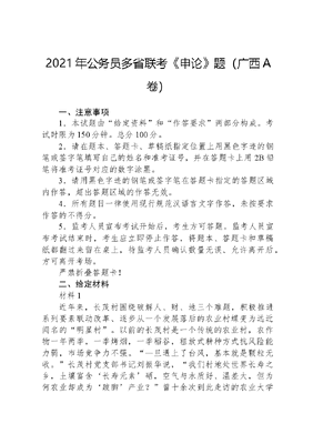 2021年公务员多省联考《申论》题(广西A卷)一、注意事项1.本试题由给定资料和作答要求两部分构成。考试时限为150分钟。总分100分。2.请在题本、答题卡、草稿纸指定位置上用黑色字迹的钢笔或签字笔填写自己的姓名和准考证号,并在答题卡上用2B铅笔将准考证号对应的数字涂黑。3.请用黑色字迹的钢笔或签字笔在答题卡指定的答题区域内作答,超出答题区域的作答无效。4.所有题目一律使用现行规范汉语言文字作答,未按要求作答的不得分。5.监考人员宣布考试开始后,考生方可答题。监考人员宣布考试结束时,考生应立即停止作答,将题本、答题卡和草稿纸都翻过来留在桌上,待监考人员确认数量无误、允许离开后,方可离开考场。严禁折叠答题卡!二、给定材料材料1近年来,长茂村围绕破解人、财、地三个难题,积极推进系列要素联动改革、逐步从一个发展落后的农业村蝶变为远近闻名的明星村。以前的长茂村是一个传统的农业村,农作物一年两季,一季烤烟,一季稻谷,粗放式耕种方式抗风险能力弱,市场竞争力不强。—旦遇上了台风,基本就是颗粒无收。长茂村党支部书记刘振华说,我们村地处世界长寿之乡,土壤富含长寿元素硒,空气与水质好、温差大,但为何农业却成为跛脚产业?曾十余次到此走访的农业大学王教授直言,欠发达地区的资源禀赋优势本来就不明显,若是以分散的土地、少量的资金延续传统农业生产形态,收益自然一般。32岁的黄波是长茂村的致富能手。去年上半年,他一口气向村里的股份合作经济联合社租下40亩地发展木耳种植,这40亩地,涉及几十户人家,我现在不用一一去谈,只要找村里股份合作经济联合社就行,省去大量沟通成本。去年以来,为解决承包地分散化、碎片化和低效使用等问题,长茂村建立村级土地合作社。农民以承包经营权入股,以求将分散在每家每户的耕地经营权化零为整,实现股权到人、股份合作、集体运营。刘振华介绍,村级土地合作社以合适的价格集约土地,并将集约后的土地以竞价方式承租出去。对于土地租金增值部分,土地合作社进行二次分配。50%返还给土地出租农户,50%归作集体,用于村里产业发展、关爱老人等公益事业。黑木耳产业园是长茂村近些年发展一村一品特色产业的缩影。该产业园由长茂村利用集体经济扶持资金与产业帮扶资金投资兴建,总投资约500万元,占地约10亩,实行生产、加工、销售一体化经营。记者在黑木耳产业园看到,几十个村民忙着栽培菌种、制作菌棒、养菌,柳琴就是其中一位。在这上班,一个月有4000元左右的工资,也能照顾家里。她笑言。据了解,在前期土地流转基础上,长茂村利用村集体经济建设厂房和种植基地,然后每年以20万元价格租赁给企业,探索党支部+公司+基地+专业合作社+农户形式,联手组建产业化联合体。同时,村党支部组织农户成立产业合作社,发展专业化生产,形成生产、供销、信用三位一体综合合作模式,有效解决农户传统种植模式风险大、竞争力较弱的问题,为村民提供内有技术、外有销路的产业链服务。随着乡村振兴战略的推进,农村发展产业有资金需求,但金融机构有规避风险的责任,钱从哪儿来,怎么才能用好的问题愈发突出。为此,长茂村按照因地制宜、入社自愿的原则,探索成立长茂村资金互助社,并设立村级互助基金。互助基金的资金来源为村民自筹、财政支持和社会捐赠三部分,我们实际筹款103万元。刘振华说。之后,在互助基金中设置100万不动本基金,用于村集体、农业合作社及村民在银行担保贷款,担保贷款总额度为300万元。不动本基金的利息,一部分归村集体,一部分返还给资金互助社社员。基金担保+村集体审核+银行授信合作方式,为长茂村带来多渠道、多方式的融资服务,有助于满足农户短期种养、技术设备购买与更新、产业投资等方面的资金需求,也为长茂村股份合作经济联合社开展项目投资提供资金支持。推进乡村振兴战略、如何释放沉淀资源、推动产业兴旺,是不少乡村遇到的现实难题。在王教授看来,只要思路和方法得当,就能找到适合本地的致富之路,就像把米、红豆、红枣等熬制成八宝粥,能得到更多附加值。长茂村走的正是这样一条路。材料2把她的家粉刷一新,给独自生活的她更多支持。某公益平台上,为女孩小珊修缮房屋的公募计划得到不少爱心网友的积极参与。1元、10元、100元……不到一个月,爱心捐款就超过了修缮所需。小珊家住C市N区。唯一的亲人去世了,自己又身患多种疾病,这让她一度有了轻生的念头,是N区社区救助顾问团队把她从疾病与孤独中拉了出来。我们希望为她粉刷的不仅仅是墙面,也是内心。为小珊修缮房屋正是为其定制的救助组合拳中的一步;修葺后的房屋腾出一间出租,能有效缓解其家庭债务。同时,社区救助顾问团队为其提供专业心理咨询、继续教育、就业指导等服务,帮助她重拾生活信心。小珊的故事是C市N区近年在全国率先推出社