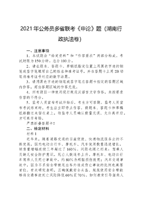 2021年公务员多省联考《申论》题(湖南行政执法卷)一、注意事项1.本试题由给定资料和作答要求两部分构成。考试时限为150分钟。总分100分。2.请在题本、答题卡、草稿纸指定位置上用黑色字迹的钢笔或签字笔填写自己的姓名和准考证号,并在答题卡上用2B铅笔将准考证号对应的数字涂黑。3.请用黑色字迹的钢笔或签字笔在答题卡指定的答题区域内作答,超出答题区域的作答无效。4.所有题目一律使用现行规范汉语言文字作答,未按要求作答的不得分。5.监考人员宣布考试开始后,考生方可答题。监考人员宣布考试结束时,考生应立即停止作答,将题本、答题卡和草稿纸都翻过来留在桌上,待监考人员确认数量无误、允许离开后,方可离开考场。严禁折叠答题卡!二、给定材料材料1近年来,随着道路交通的日益便捷、快递物流服务业的不断发展,国内电动自行车、摩托车、汽车使用数量迅速增长,销售量增幅连续三年超过了160%。问题也随之而来:驾乘人员缺乏安全防护意识,死亡人数逐年上升。摩托车、电动自行车驾乘人员死亡事故中,约80%为颅脑损伤致死;汽车交通事故中,因为不系安全带被甩出车外造成伤亡事故的比例也高居首位。有关研究表明,正确佩戴安全头盔、规范使用安全带能够将交通事故死亡风险降低60%至70%。如何教育引导驾乘人员正确佩戴安全头盔、规范使用安全带,已经成为交通安全管理和道路执法部门高度重视的问题。2020年1月1日,J市出台了《J市电动自行车管理条例》,规定电动自行车驾驶人必须佩戴安全头盔,《条例》还规定:电动自行车驾驶人及搭载人未佩戴安全头盔,将处以警告或20元以上、50元以下罚款。为推动该条例落实,J市还开展一盔一带安全守护行动。根据新出台的《条例》,J市H区交管部门加强执法管理,坚持现场查处与自动抓拍相结合,明确处罚范围,全面加大查处力度。2020年,全年共查处摩托车和电动自行车驾乘人员未佩戴安全头盔、汽车驾乘人员未使用安全带违法数量同比分别上升131.6%、78.3%,摩托车和电动自行车驾乘人员不佩戴安全头盔、汽车驾乘人员不使用安全带非现场查处周违法量分别下降41%、79.6%。法律的震慑作用、警示作用得到彰显,群众安全头盔佩戴率、安全带使用率明显提升。各位网友,大家好!这里是全国交通安全直播月活动现场,我是H区交巡警小谢。今天,我们通过H区交警平台进行一盔一带安全守护行动直播……民警主播小谢对着手机,在直播间里展示了目前市面上常见的4种安全头盔,讲解它们各自的特点,并邀请搭档演示正确佩戴头盔的方法,详细解读道路交通安全法中关于使用安全带的规定。这场直播不错,有意义!支持文明出行!网友们纷纷留言、点赞。当日,共有上万名网友观看了直播。近日,家住该区佳园社区的陈先生忘戴头盔骑摩托车外出,在小区大门正巧遇到交警在社区开展共享头盔活动,他借到头盔后感慨道:交警把头盔送到小区大门口,太方便了。以后出门忘戴头盔,在小区门口就可以借到。H区交管部门还联合该区外卖、物流企业开展警企联合劝导活动。活动期间,全区共设置警企联合劝导点20余个,出动警力300余人次,外卖、物流企业派员500余人次,纠正外卖送餐员、物流配送人员不戴安全头盔2000余人次,向外卖和物流企业通报240余次。H区交管部门负责人在接受记者采访时表示,今年H区以《J市电动自行车管理条例》的出台为契机,创新工作方式方法,用新办法解决老问题,真正做到了旧曲新唱一盔一带安全守护行动成绩斐然,有效提高了电动自行车驾乘人员的安全防护水平,助推道路交通事故预防减量控大工作取得了新成效。数据显示,该区2020年汽车、摩托车和电动自行车登记数量达到历史新高,但驾乘人员死亡人数和受伤人数自2006年以来却首次出现了下降。材料2近年来,T市N区深入推进生态环境综合行政执法改革,生态环境质量持续改善,空气质量优良天数比率逐年上升PM2.5平均浓度排名位列全省第四,全省考核断面地表水优于Ⅲ类比例为100%,地表水全面消除劣Ⅴ类水体……2019年,N区环境生态局挂牌成立,下设六个区域性综合行政执法支队,执法范围覆盖全区12个街道乡镇,70%以上执法人员下沉至各执法支队,开展一线执法。2020年5月,N区生态环境局自动监控平台发出预警,某印染企业的废水排放数据有异常,废水排放指标为红色,存在超标排放嫌疑,局综合行政执法指挥中心,第一时间通过移动执法平台向企业所在区域执法支队发出指令,环境执法人员和监测人员立即启动大数据应用执法八步法,对案件进行查处。执法人员到现场后定位报到,亮证告知,信息核实,现场检查,现场勘探笔录制作,打印笔录,电子归档,实现闭环,这一过程全部通过执法记录仪全程录像,同时上传省生态环境厅平台,采样监测结果表明,企业废水超标排放。N区生态环境局立即会商,确定企业存在环境违法
