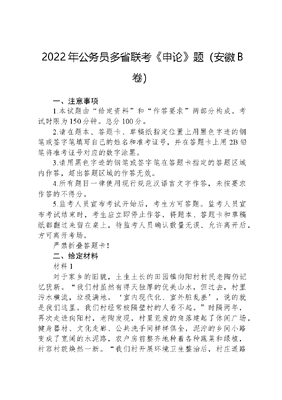 2022年公务员多省联考《申论》题(安徽B卷)一、注意事项1.本试题由给定资料和作答要求两部分构成。考试时限为150分钟。总分100分。2.请在题本、答题卡、草稿纸指定位置上用黑色字迹的钢笔或签字笔填写自己的姓名和准考证号,并在答题卡上用2B铅笔将准考证号对应的数字涂黑。3.请用黑色字迹的钢笔或签字笔在答题卡指定的答题区域内作答,超出答题区域的作答无效。4.所有题目一律使用现行规范汉语言文字作答,未按要求作答的不得分。5.监考人员宣布考试开始后,考生方可答题。监考人员宣布考试结束时,考生应立即停止作答,将题本、答题卡和草稿纸都翻过来留在桌上,待监考人员确认数量无误、允许离开后,方可离开考场。严禁折叠答题卡!二、给定材料材料1对于家乡的旧貌,土生土长的田园镇向阳村村民老陶仍记忆犹新。我们村虽然有得天独厚的优美山水,但过去,村里污水横流,垃圾满地。室内现代化、室外脏乱差,说的就是我们这里。我们村经常被隔壁村的人看不起。时隔两年,再次走进向阳村,老陶发现,村里荒废的角落建起了休闲广场,健身器材、文化走廊、公共洗手间样样俱全,泥泞的乡间小路变成了宽阔的水泥路,农户房前整齐地种着各种蔬菜和绿植,村容村貌焕然一新。我们村开展环境卫生整治后,村庄道路宽了,出行更方便了,我家房前屋后也变得越来越整洁。乡亲们吃完饭,就在休闲广场上散步聊天,生活质量比以前提高了不少,腰杆子都挺直了。村民老李自豪地说。2021年以来,向阳村已经开展了10余次集中环境整治,组织党员干部、村民、返乡大学生对村里的垃圾、牛羊粪、废弃建筑材料等进行了全面清理。村党支部吴书记介绍:我们还通过招标方式实现生活垃圾收集运输市场化运作,建立了小型微动力污水处理系统,生活垃圾处理站的两台焚烧炉每天能吃掉6吨生活垃圾,有效解决了村里的生活垃圾和污水处理难题。村里还成立了保洁办公室,将人居环境整治转向物业化管理、市场化经营。在保洁办公室的推动下,村里陆续对村民家里的旱厕进行了水冲厕所改造。村民老张家的卫生间已经改造完成,新安装的马桶上贴着一张用户联系卡,上面标有维修、监督和村级联系人的电话。村里环境改观了,如何增加收入又是一个问题。为壮大村集体经济,村里积极探索党支部+龙头企业+合作社的模式,以入股的方式增加村集体收入,带动村民增收。吴书记介绍道,向阳村在镇里的农产品开发公司投入股金80万元,按占股比例分红,村集体经济每年保底收益为5万元。同时,公司还通过订单种植养殖、订单收购带动240户农户增收致富。今年,村里将以发展肉鸭养殖项目为主,推动村民收入水平再上新台阶。村民老刘忙得不亦乐乎,每天不仅要饲养好自己养的5000多只鸭子,还要忙着把收捡好的鸭蛋送到附近的合作社加工。而就在几年前,他还只是一个养鸭规模不大的农户。过去养殖规模很小,现在一年收入有10万元左右,这得益于产业发展的带动。老刘高兴地说。为了更好地带动群众增收,村里还引导村民成立了专业的养殖合作社,不仅免费为像老刘这样的养殖户提供更多的养殖技术,还就近收购他们的产品进行深加工。合作社在壮大集体经济的同时,也为村民提供了更多的就业岗位。村子近年来变化很大,房子漂亮,住着舒服,每天都有专门的人打扫公共卫生,村容村貌改善非常明显,更重要的是邻里关系和睦,家家户户门口都挂有彰显家风家训的匾牌。村民老张说,村里建设的家风家训一条街对教育后代帮助很大,村里的孩子现在都能把家风家训背出来了。今年年初,在村党支部的指导下,向阳村召开了村民代表大会,大家一致举手通过了新修订的村规民约。此外,村里还组织大学生返乡开展社会实践,通过实地走访老前辈、查阅文史资料,挖掘向阳村的历史文化,探究过去的风俗习惯,编写了一本图文并茂的《向阳村史》。下一步,村里还要推进村史研究成果转化,建设村史馆,并进一步实施乡贤文化工程,引导乡贤为本村的发展建言献策、出资助力。这些举措得到了镇政府的肯定,多次组织镇村干部前来取经。吴书记高兴地跟大家说道:村里的发展,既要摘掉穷帽子,又要改变老样子,还要留住好根子。材料2农村寄递物流是农产品出村进城、消费品下乡进村的重要渠道之一。近年来,K县农村寄递物流体系建设取得了长足进步,但与群众的期待尚存在最后一公里不顺畅的问题。日前,K县在线上开展了关于K县农村寄递物流体系建设意见征集活动,网友们纷纷留言反映意见建议。●我常年在外面打工,有时会网购一些生活用品给家里的老人和小孩,但村里没有收发快递的服务站,需要自己到镇上取,路途遥远,十分麻烦。此外,老人也不懂取件码,取快递存在很多困难,请邻居帮忙取件也不是长久之计。●快递可以到镇里,但我们村到镇里还很远,遇到农忙时节,根本没时间去取。而且快递代收员还兼做其他事情,经常不在,有时态度也不好,过去一趟要提前预约,