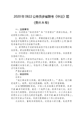 2020年0822公务员多省联考《申论》题(贵州A卷)一、注意事项1.本试题由给定资料和作答要求两部分构成。考试时限为150分钟。总分100分。2.请在题本、答题卡、草稿纸指定位置上用黑色字迹的钢笔或签字笔填写自己的姓名和准考证号,并在答题卡上用2B铅笔将准考证号对应的数字涂黑。3.请用黑色字迹的钢笔或签字笔在答题卡指定的答题区域内作答,超出答题区域的作答无效。4.所有题目一律使用现行规范汉语言文字作答,未按要求作答的不得分。5.监考人员宣布考试开始后,考生方可答题。监考人员宣布考试结束时,考生应立即停止作答,将题本、答题卡和草稿纸都翻过来留在桌上,待监考人员确认数量无误、允许离开后,方可离开考场。严禁折叠答题卡!二、给定材料材料1我们都在努力奔跑,我们都是追梦人。是的,我们都是追梦人。追梦,我们收获满满;追梦,我们希望满满。正如XXXXXX所说,中国人民具有伟大梦想精神。改革开放40多年的征程,就是一个追梦之旅。改革开放之初,我们党以非凡的胆略、坚定的自信设计了用70多年、分三步走基本实现社会主义现代化的宏伟蓝图。改革开放40多年的追梦路上,我们咬定青山不放松,风雨无阻朝着这个伟大目标前进。从站起来、富起来到强起来,这是奋斗的力量,也是梦想的力量。党的十九大对我国发展提出了更高的奋斗目标,形成了从全面建成小康社会到基本实现现代化、再到全面建成社会主义现代化强国的战略安排,发出了实现中华民族伟大复兴中国梦的最强音。但是,船到中流浪更急,人到半山路更陡,并且愈进愈难、愈进愈险而又不进则退、非进不可。在这样的关键时刻,我们要心怀梦想、奋勇拼搏,一步一个脚印,一棒接着一棒,在新时代创造中华民族新的更大奇迹!梦想是拼出来的,奇迹是干出来的。改革开放40多年来的辉煌成就背后,是40多年的不懈努力。未来中国梦的实现,同样需要汗水的浇灌。没有人能随随便便成功。改革开放40多年的历程告诉我们:伟大事业都始于梦想,基于创新,成于实干。梦想是激发活力的源泉,只要有梦想,就会有力量。只要有梦想,则时光不弃,未来可期。材料2只因看了一眼岩山,从此她就与岩山结缘。她就是D市岩山驻村帮扶工作组组长、驻村第一书记小孙。几年前,小孙从一所名牌大学硕士研究生毕业,来到D市商务局工作。有一次,市委、市政府组织机关干部下基层社会实践活动,她随着实践小组来到了岩山。太美了!小孙被岩山美丽的风景深深震撼,花红柳绿山清水秀,真是如诗如画。当地淳朴的民风,热情好客的村民更令她印象深刻。不过,令她同样印象深刻的还有岩山的贫困。岩山共有1345户、4130口人,其中贫困户占60%,人均耕地不足0.8亩,村民收入主要依靠传统农业和外出务工,是典型的国家级贫困村。脱贫是这里的村民一代又一代的梦想。如果能帮助岩山村这样长期贫困的地方摆脱贫困,人生该是多么有价值啊!小孙的心里涌起一个强烈的念头。此时,D市正深入开展脱贫攻坚行动。巧合的是,岩山村正是商务局的对口扶贫村。小孙主动请缨,担任岩山驻村帮扶工作组组长。作为名校研究生,有更好的机会,为什么选择到偏远乡村?面对不解的目光,小孙没有回答,只是报以微笑。从驻村工作开始的第一天起,帮助岩山这个贫困村脱贫致富沉甸甸的责任,便落在了小孙的肩上。刚入村时,小孙准备先找村民了解情况.但却听到了这样的风凉话:咋还派个女干部?一个城里女人能干啥?为了开好头,获取村民的信任,她和工作组同事,到田间地头了解情况,走家串户查找穷根,入村不到两个月,就完成了全村所有贫困户的走访,做到村里的大事小情、家长里短都了然于心。随后小孙与工作组同事组织村民参加手工纺织、月嫂服务等培训班。与此同时,他们筹集资金,在全村开工建设引水上山工程,彻底改变了村里几十年来缺水的落后状况。春节前,贫困户饲养的年猪还在愁销路,工作组全程参与推销,终于换来了80多万元沉甸甸的过年钱……一连串雪中送炭的实质性帮扶拉近了村民和工作组的距离,村民们被小孙这位女干部的真情付出深深打动。农村富不富,关键在支部。如何发挥基层党组织的战斗堡垒作用是驻村帮扶的首要工作。小孙深有感触地说。为此,她和工作组同事带着村民党员积极开展学习教育活动,提升党员的先锋模范意识。为了提高村干部、村民代表引领产业发展、带领群众致富的能力,小孙多次带领他们到先进地区学习考察,明显感觉到岩山的民心齐了,村干部的干劲足了、水平高了。小孙帮助村民脱贫致富的信心更强了。如何用工业化理念改变村民传统的生产生活方式,尽快引进增收产业项目为村民创造具有长期稳定收益的就业岗位,实现更多人的致富奔小康,是驻村帮扶工作组和村两委班子每天都要琢磨的大事情。工作组得知外省一家大型现代纺织企业老总是D市人,有回乡投资的想法,便第一时间与他取得联系,进行对接和项目考察。小孙在充分了解到该纺织项目
