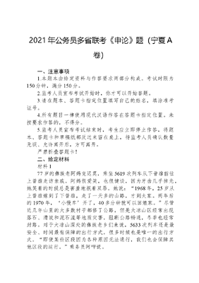2021年公务员多省联考《申论》题(宁夏A卷)一、注意事项1.本题本由给定资料与作答要求两部分构成。考试时限为150分钟,满分150分。2.监考人员宣布考试开始时,你才可以开始答题。3.请在题本、答题卡指定位置填写自己的姓名,填涂准考证号。4.所有题目一律使用现代汉语作答在答题卡指定位置。未按要求作答的,不得分。5.监考人员宣布考试结束时,考生应立即停止作答,将题本、答题卡和草稿纸都反过来留在桌上,待监考人员确认数量无误、允许离开后,方可离开。严禁折叠答题卡!二、给定材料材料177岁的彝族老阿妈克迟莫,乘坐5619次列车从下普雄前往上普雄走访亲戚。阿妈很爱笑,也很健谈,因为牙齿几乎掉光,她笑着的时候总是害羞地抿着双唇。她说:1968年,25岁从上普雄嫁到了下普雄,走了一天多的山路,才到夫家。两年后的1970年,小慢车开了,40多分钟就可以回娘家。尽管近几年山里的大多数村子都修了公路,但是大凉山区经常出现落石、滑坡和泥石流等地质灾害,阻断公路畅通,冬季也经常封路。对于大凉山深处的彝族老乡们来说,5633次列车还是最安全、时间最有保障的出行方式,很多时候也是唯一的出行方式。即使某些区段因为各种原因无法通行,我们也会保障其他区段的运行。乘务员阿呷说。在过去的几十年间,这趟被称为小慢车的列车早已彻底进入当地人的日常生活。作为孩子们的校车、当地人的赶集车、公交车、婚车……这趟列车也在用润物无声的方式支持着大凉山区的脱贫攻坚。即使是普通话不流利的彝族老乡,也会在听到小慢车三个字时,第一时间吐出一个好字。2020年是成昆铁路通车50周年,作为服务民族地区、助推地方经济、巩固国防建设的钢铁大动脉,成昆铁路串起了沿线群众的幸福生活。5619/20次和5633/34次两辆公益性小慢车与成昆线同龄,在悠长岁月里传承铸道精神,穿行于大凉山腹地,最长运行里程353公里,停靠26个车站,自1995年以来票价从未变过,最高25.5元,最低2元。5619次、5633次小慢车串联起彝族老乡们对美好生活的追求。一张张朴实无华的笑脸,让小慢车充满了阳光和温度。3月开始,正是大凉山采收蕨菜、青岗藤、蒲公英、党参等土特产的季节。5633次尼波站开车后各车厢大件行李处都堆满了农产品。有的时候,这些土特产在小慢车上就完成了交易,老乡们在车厢里拿出秤杆子,当场称重交易,省时又省力,在到达终点前就已经把手上的土特产出售一空。阿莫的随身物品很简单,一个皮质挎包、一杆秤。他此次乘车的目的是收购蕨菜。他穿梭在车厢里,不断寻找心仪之物,终于在8号车厢的大件行李处找到了几大包新鲜水嫩的蕨菜,在与货主沟通后,阿莫拿出秤杆子,一袋一袋地称了起来,这一趟阿莫收购了300多斤蕨菜。现在,阿莫已经不再依靠坐火车运输货物赚钱了。他选择了火车+电商的新路,开办猪场,制作凉山猪腊肉,在电商平台销售,然后用大车把腊肉运到县城去发快递。今年春节,他的几千斤腊肉几乎销售一空,挣了几万块钱。为了供阿树上学,父母通过小慢车销售家里种植的烤烟、土豆、玉米,他们最大的心愿就是阿树能找到一份稳定的工作。2017年,铁路部门履行扶贫承诺来到学校招工,阿树与另外5名彝族同学脱颖而出,成为小慢车的乘务员。得知儿子能够在铁路部门上班的消息,一家人都高兴坏了。妈妈说,这下阿树既找到了稳定的工作,又缓解了家里的经济压力。从乘客变为铁路人,小慢车一直温暖着这位青年的心。近年来,小慢车列车党支部围绕精神文明建设和精准扶贫,积极促进民族团结进步,不断优化彝乡情服务内涵,完善便民利民措施。将民俗风情与列车服务举措结合,设计制作了带有彝族文化元素的揭示揭挂,列车方向牌和车内引导标识都标注了彝汉双语。同时,班组服务小分队坚持到车厢、到座位进行安全服务和文明乘车宣传,一并提供针线包、胶带、捆扎绳等便民服务,列车广播还增加了彝汉双语播报服务,车内乘务员彝语汉语双语上岗。为了方便日常彝族老乡运输家禽、牲口,小慢车贴心地在行李车厢增设了牲畜拴挂处,每趟车进行消毒,实现了牲畜与旅客分开,让车厢环境更卫生、整洁。为了让彝族老乡能把所有东西搬上车,有的车站还会提前开放站台,让老乡先把货物堆在车门前,有时这趟列车的开车时间会推迟几分钟。我们这种车时间弹性大,不像高铁,都是按秒计算的。列车员称,和多数人熟悉的先买票再上火车的流程略有不同,5633次列车一路停靠的大多数车站都只能被称为乘降站,也就是可以上下车但不具有售票资格的车站,乘客从乘降站上车后再在车上补票。在阿呷看来,教育是阻断贫困的最重要的途径。现在更多彝族年轻人通过小慢车能够走出大山到外面学习、务工,这些都是让当地更快发展的希望。教育进步带来的最直接的变化就是在列车上抽烟、乱扔果皮的人少了,即使有