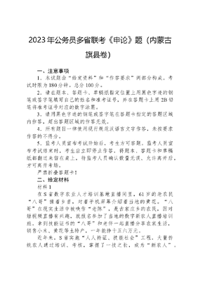 2023年公务员多省联考《申论》题(内蒙古旗县卷)一、注意事项1.本试题由给定资料和作答要求两部分构成。考试时限为180分钟。总分100分。2.请在题本、答题卡、草稿纸指定位置上用黑色字迹的钢笔或签字笔填写自己的姓名和准考证号,并在答题卡上用2B铅笔将准考证号对应的数字涂黑。3.请用黑色字迹的钢笔或签字笔在答题卡指定的答题区域内作答,超出答题区域的作答无效。4.所有题目一律使用现行规范汉语言文字作答,未按要求作答的不得分。5.监考人员宣布考试开始后,考生方可答题。监考人员宣布考试结束时,考生应立即停止作答,将题本、答题卡和草稿纸都翻过来留在桌上,待监考人员确认数量无误、允许离开后,方可离开考场。严禁折叠答题卡!二、给定材料材料1在S省数字农业人才培训基地直播间里,61岁的老农民八哥操着乡音,对着手机屏幕介绍着当地的黄花。八哥在现实生活中被唤作老陈,是古家庄乡的农民,因对短视频直播有兴趣,就报名参加了当地的数字新农人直播培训班。拿到技能证书的八哥和老伴一起直播分享农家生活,销售小米、黄花等土特产,一年能挣十五六万元。近年来,S省实施人人持证、技能社会工程,大量传统农人通过培训、考核,掌握了一技之长,成为新农人。D市结合当地产业发展、考虑农民兴趣诉求、调研市场情况,把培养目标分为农业经理人、返乡下乡创新创业者、新型农业经营与服务主体、种养加技术能手等类别。还先后出台20多个技能评价的地方标准,对参训农民进行技能考核与分级评价。不同的培训项目,不同的课程内容和培训时长,高、中、初三个等级的证书,为广大农民提供了多元选择。S省农业发展的一个突破口在特与优,不同地方根据地域特色,逐步形成优势产业,比如Z市聚焦小杂粮、菌类种植,C市重点发展药茶、红枣产业等。老陈所在的D市高素质农民培训学院就依托园区企业,针对黄花种植、采摘、加工、物流等全产业链问题展开培训,农民考核通过后可直接进入相关企业工作。X市的郝大姐曾是贫困户,在参加培训班后,学会了木耳吊袋种植方式。如今,她办起了合作社,年收入过百万,带动几十户村民就业。她说:没有政策的支持和老师们的帮助,我走不到今天。X市利用专门学院、县乡级合作社等单位,整合农科院所学者、农业部门农技专家等师资,对农民进行培训,还选送一批农村青壮年到涉农大中专院校参加大中专学历教育。青年农民创业者卫东在取得技能证书后,经常回培训班交流经验,还积极尝试学到的新种植方法,带动了不少人增收致富。我们坚持缺失补什么,采取订单式菜单式模式,实现农民下单、专家配菜',通过课堂教学、实习实践、线上培训、跟踪辅导等形式,让农民在学中干、在干中学。S省农业农村厅科教处许处长说,无论是专业教师还是身边榜样,都是培养高素质农民的好老师,都是可以动员起来的力量。S省出台了农村实用人才职称评审办法,将农民作为一项职业纳入职称评定范围,并在项目扶持、资金贷款、培训、招聘等方面享受倾斜支持。农民可以评职称,我们感觉特自豪,干劲儿更足了。刚获得中级职称的水稻种植大户老田说起这个还很兴奋。5年前,T市龙湖镇的方明从IT行业转战农村。多年的农业创业经历,让他感受到了新农人的不易。做农业,投入大,回本慢,招人用工遇到困难,更是家常便饭。T市的星创天地应运而生,这个半公益性质的农业孵化器,通过资源整合,面向入驻新农人,提供现代农机作业、技能培训、用工推荐、商业资源对接等服务,几年时间见证了不少项目从雏形成长为营业额超千万元的潜力股。我们以培育省级农村创新创业园区和孵化实训基地为抓手,搭建返乡下乡在乡人员创新创业平台,为新农人创新创业提供完备的基础设施和更高效交易便捷的公共服务。省农业农村厅詹处长说,截至2022年,全省已培育省级以上农村创新创业园区(基地)184个。材料22019年,国务院办公厅印发的《关于加快发展流通促进商业消费的意见》明确提出,要活跃夜间商业和市场。过去几年间,夜间经济正在成为各地深挖消费潜力的重要战场之一。夜幕降临的M市春和夜市热气腾腾,熙熙攘攘。香脆鲜美,别处没有,欢迎品尝!张文彬一边忙碌一边吆喝。一车两人,卫生许可证、健康证、营业执照一应俱全。去年,张文彬瞄准车尾箱经济崛起时机,从养殖场进货,做起了炸蚂蚱、炸金蝉子生意。服务嘴的时候,要用心,含糊不得。夜市虽然是地摊生意,但现在有很多专业做餐饮的人进来了,你看那边,大饭店的大厨都到夜市做锅包肉和拔丝地瓜了,这就对厨艺有了更高要求,不是任何人都能随便干的。张文彬认为,这对夜市的发展是好事,可以打造更专业的夜市餐饮。往前走几步,是一家榴莲摊。摊主是一家三口,女主人小廖之前一直做社区团购,主要做线上。市里鼓励夜间经营主体发展,点燃了大家的创业激情,现在外面还有很多摊主在排队申请进