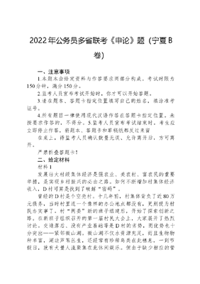 2022年公务员多省联考《申论》题(宁夏B卷)一、注意事项1.本题本由给定资料与作答要求两部分构成。考试时限为150分钟,满分150分。2.监考人员宣布考试开始时,你才可以开始答题。3.请在题本、答题卡指定位置填写自己的姓名,填涂准考证号。4.所有题目一律使用现代汉语作答在答题卡指定位置。未按要求作答的,不得分。5.监考人员宣布考试结束时,考生应立即停止作答,将题本、答题卡和草稿纸都反过来留在桌上,待监考人员确认数量无误、允许离开后,方可离开。严禁折叠答题卡!二、给定材料材料1发展壮大村级集体经济是强农业、美农村、富农民的重要举措,是实现乡村振兴的必由之路。如何不断增加村集体经济收入,D村可算是找到了破解密码。曾经的D村是个空壳村。十几年前,村集体背负了近80万元债务,当时村里连一个像样的办公地点都没有,更别提为村民办实事了。村两委新的班子组建后,开始了探索创新之路。在新班子组织召开的第一届村民大会上,大家展开了热烈讨论。交通落后、没有产业基础等是D村的劣势,而优势也十分突出——紧邻微山湖。微山湖不仅水资源充足,而且生物物种丰富,湖边芦苇丛生,还经常有珍稀鸟类在此栖息,一到节假日,就有大量人流聚集在此休闲娱乐。但由于缺少相应的管理整治,鸟类栖息地时常变成烧烤点,不少区域甚至乱石堆砌、脏污不堪。明确了自己的比较优势后,村两委最后做出决定:整治沿湖滩地,发展休闲观光产业。D村邻湖沿线的浅滩和斜坡曾经杂草丛生、湿滑不平,村里决定在湖边修建沿湖步道,将原来的土石斜坡修整为阶梯式的过渡带,并设置了小码头、垂钓区和停车场等公共设施。这些改造和新建的服务设施吸引了越来越多的游人。我参与了这片沿湖区域的开发建设,步道沿线的公共设施比如小码头的渡轮、停车场等虽然收费不高,但因为来的人多,收益很不错。村民老李回忆说。D村因地制宜,变洼地为聚宝盆,将比较优势转化为发展优势。经过几年的努力,沿湖滩地不仅常年碧波荡漾、芦苇密布、水鸟成群,而且沿湖带的休闲观光产业逐渐发展起来,渔家乐、农家乐、码头汇、映月岛等一批高质量、有特色的休闲观光项目如雨后春笋般涌现,不仅为村民创造了更多就业、创业机会,还大大增加了村集体经济收入。有了这笔钱,D村两委有了发展底气,除了一部分用来还债外,其余的钱一部分用于扩建沿湖步道、停车场,增设环湖公园、儿童游乐场等休闲场所,另一部分则用来发展其他集体产业。村子的主干道上是一个马路集市,有几十年的历史,辐射周边10余个村,在集市的中段有个老电影院,年久失修,已经坍塌。为进一步拓展集体经济收入来源,经村民大会商议,村两委决定在老电影院原址建商用房,由集体出资建设,产权归集体所有,房屋租给商户,租金为每年5万元,这笔收益不仅可观,而且十分稳定。无独有偶,村里的老窑厂部分土地已经复垦,还留下了一个大窑坑。村两委变窑坑为资源,发动村里的能人创业,发展水产养殖。由集体出资,将窑坑简单平整后流转给这些水产养殖户,集体经济又增加了一笔固定收入。另外,D村抓住县里对附近河道进行拓宽的机会,利用挖出的土方复垦土地30亩,全部种植了经济林,而后又将这些经济林流转给农家乐的老板,用于拓展其经营场所和范围。如此一来,既扩大了绿化、保护了环境,又改善了生产条件,延伸了产业链条,拓展了增收空间。经过几年的努力,D村不仅还清了债务,还能保持集体每年有笔不菲的收入。带领一个村发展就好比过日子,得想方设法多渠道去寻找致富门路,将鸡蛋放到多个篮子,不仅降低了风险,还提高了收益。D村党支部韦书记说。有了集体收入后,D村开始完善农业基础设施、修建水利、搭桥铺路,为农业现代化提供保障。村里先后投入20多万元修建了生产渠6000米、生产路12000米,大大方便了农户。同时,鼓励农田流转经营,推动农业的产业化和机械化,引导种植大户发展绿色农业,叫响微山湖品牌,农产品品质和产量不断提升。经过不懈努力,农田的小麦和水稻产量翻了两番,土地流转费也由一开始的50元每亩提高到300元,再到现在的700元。栽下梧桐树,引得凤凰来。村两委深知,只有引入和发展企业,才能为村集体带来更多的收益。在完善农业基础设施的同时,村里还开始加强工业基础设施建设,多方招引项目。去年,鸿发生物科技有限公司看中了D村的基础设施和自然资源,决定在村里投资建设秸秆收储加工项目。通过充分整合资源、盘活土地、鼓励创业,村里还招引农产品加工厂3家、电子材料厂1家,使近百名村民实现就地就业。蛋生鸡、鸡生蛋,无穷尽,只有让钱生钱,村集体经济收入才能源源不断,才能为群众办更多的实事、好事。韦书记说。材料2H市平川县和云安县过去经济发展较为落后。近些年来,平川县虽然取得了一定发展,但镇与镇之间的发展不平衡问题却越来越突出,而云安县则打出了一套乡镇集群化建设的组合拳,有效推动了县域乡镇
