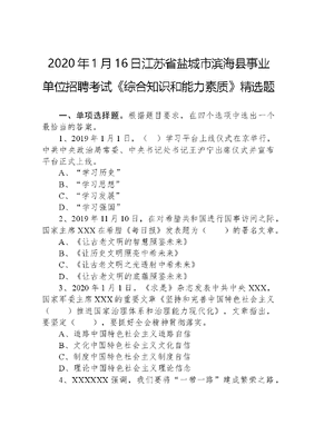 2020年1月16日江苏省盐城市滨海县事业单位招聘考试《综合知识和能力素质》精选题一、单项选择题。根据题目要求,在四个选项中选出一个最恰当的答案。1、2019年1月1日,( )学习平台上线仪式在京举行,中共中央政治局常委、中央书记处书记王沪宁出席仪式并宣布平台正式上线。A、学习历史B、学习思想C、学习发展D、学习强国2、2019年11月10日,在对希腊共和国进行国事访问之际,国家主席XXX在希腊《每日报》发表题为( )的署名文章。A、《让古老文明的智慧照鉴未来》B、《让历史文明照亮中希未来》C、《让古老文明之光透射中希未来》D、《让古老文明的底蕴照鉴未来》3、2020年1月1日,《求是》杂志发表中共中央XXX,国家军委主席XXX的重要文章《坚持和完善中国特色社会主义( )推进国家治理体系和治理能力现代化》,文章指出,要坚定( ),要抓好全会精神贯彻落实。A、道路中国特色社会主义道路自信B、文化中国特色社会主义文化自信C、制度中国特色社会主义制度自信D、理论中国特色社会主义理论信念4、XXXXXX强调,我们要将一带一路建成繁荣之路,符合历史发展规律。这条繁荣之路,( )是解决一切问题的总钥匙。A、开放B、改革C、发展D、创新5、中国特色社会主义进入新时代,我国社会主要矛盾已经转化为人民日益增长的( )需要和( )的发展之间的矛盾。A、美好生活不充分不平衡B、幸福生活不平衡不充分C、幸福生活不充分不平衡D、美好生活不平衡不充分6、我国的根本政治制度是( )。A、人民代表大会制度B、人民民主专政制度C、民主集中制制度D、社会主义制度7、1949年4月,华东军区海军在江苏省( )成立,张爱萍任司令员兼政委,中国人民海军从此诞生。A、盐城市B、泰州市C、常州市D、徐州市8、含有重要的国家秘密,泄露会使国家的安全与利益遭受到严重损害的文件,属于( )。A、秘密文件B、绝密文件C、机密文件D、保密文件9、我国历史上第一个国家是( )。A、夏朝B、商朝C、秦朝D、西周10、我国古代一部杰出的史学著作,以纪传等体例进行编写,史料翔实,文笔生动,是后世编写史书的典范,鲁迅称其为史家之绝唱,无韵之离骚。这部史书是( )。A、《尚书》B、《春秋》C、《史记》D、《道德经》11、《步辇图》是中国十大传世名画之一,描绘的是吐蕃赞普派丞相到长安觐见唐太宗,并向文成公主求婚的故事,它间接的反映了唐朝与边远民族的友好交往。其作者是( )。A、张择端B、阎立本C、顾恺之D、周昉12、落后就要挨打,是近代中国屈辱历史给我们的警示,在中国近代史上,腐朽的清政府被迫同列强签订的第一个不平等条约是( )。A、马关条约B、北京条约C、南京条约D、辛丑条约13、大禹治水的故事家喻户晓,大禹治理的是( )的洪水。A、长江流域B、汾河流域C、淮河流域D、黄河流域14、在中国传统文化的诸多文学作品当中,四书五经占据着相当重要的位置,其中五经是《诗经》、《尚书》、《礼记》、《春秋》和( )。A、《论语》B、《周易》C、《中庸》D、《资治通鉴》15、美国学者罗伯特·卡茨将领导者应具备的技能分为三类,即概念技能、人际技能和( )。A、决策技能B、技术技能C、判断技能D、沟通技能16、公告与通告的区别在于( )。A、前者应写明主送单位,后者不需写明主送单位B、前者范围大,后者范围小C、前者可登报,后者不可登报D、前者内容复杂,后者内容简单17、在新世纪新阶段,我国的民主党派已经成为各自所联系的一部分社会主义劳动者、社会主义建设者和拥护社会主义爱国者一个政治联盟,我国现有民主党派( )个。A、10B、9C、8D、718、2014年5月15日,国务院公布了指导事业单位深化改革的实施条例《事业单位( )条例》,该条例自2014年7月1日开始实施。A、分类管理B、人员聘用C、人事管理D、人事制度改革19、十九大报告中指出,建设生态文明是中华民族永续发展的千年大计,必须树立和践行( )的理念,坚持( )的基本国策,像对待生命样对待生态环境。A、山水林田湖是一个生命共同体环境资源保护B、绿水青山就是金山银山节约资源和保护环境C、绿水青山就是金山银山合理利用每一寸土地和切实保护耕地D、山水林田湖是一个生命共同体节约资源和环境保护20、从两个一百年奋斗目标到提出中国梦,从把握中国经济发展新常态到牢固树立五大发展理念······蕴藏鲜明时代内涵的治国理政总体方略与时俱进、不断发展。治国理政总体方略的发展所体现的哲理是( )。A、人类社会是一个不断发展变化的过程B、真理反映的对象是客观事物及其规律C、真理性的认识随着实践的发展而发展D、理论是否