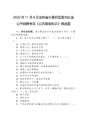 2022年11月6日吉林省长春新区面向社会公开招聘考试《公共基础知识》精选题一、单项选择题。每小题后的四个备选答案中只有一个最符合题意的答案。1、函,在公务活动领域上属于( ),在文种上属于( )。A、专用公文;陈述呈请性文件B、通用公文;规范性文件C、专用公文;领导指导性文件D、通用公文;商洽性文件2、以下关于低碳经济的说法,不正确的是( )。A、保持低水平的能源消耗B、2003年由美国率先提出C、建立清洁能源结构,发展清洁能源技术D、降低二氧化碳排放3、我国的外交政策的宗旨和目标是( )。A、和平共处五项原则B、维护世界和平,促进共同发展C、独立自主,不结盟D、加强和发展同发展中国家的团结与合作4、新的规范性公文产生了,对同一事物约束、规范的旧文件应( )。A、废止旧文B、新不废旧C、两文并存D、相辅相成5、下列法律谚语与其蕴含的法学理念对应正确的是( )。A、举证之所在,败诉之所在——谁主张谁举证B、平等者之间不存在司法管辖权——司法管辖权的普遍性C、法律不保护权利上的睡眠者——法的首要价值目标是正义D、任何人不因思想受处罚——法律面前人人平等6、江河上游造纸厂排放污水,造成下游农作物欠收、农业减产,但农户却不能得到补偿的情况在经济学上被称为( )。A、生产的外部经济B、生产的外部不经济C、消费的外部经济D、消费的外部不经济7、加强社会建设,是社会和谐稳定的重要保证。加强社会建设,必须以( )为重点。A、城镇化建设B、保障和改善民生C、环境保护D、创新驱动发展规划8、下列哪个不属于行政机关的行政司法行为( )。A、监督检查B、行政调解C、行政裁决D、行政复议9、用于对下级机关布置工作,阐明工作活动的指导原则的领导指示性文件,称为( )。A、命令B、批复C、通知D、指示10、分管政府某一方面行政业务的部门即( )。A、辅助机关B、派出机关C、领导机关D、职能机关11、从唯物辩证法的观点看,人类与黄种人、白种人之间的关系是( )。A、多数与少数的关系B、共性与个性的关系C、质量和数量的关系D、思维与存在的关系12、含有重要的国家秘密、泄露会使国家的安全与利益遭受到严重损害的文件,属于( )。A、机密文件B、秘密文件C、绝密文件D、保密文件13、( )是针对现实中出现的较重大的问题,为了解情况、澄清事实、制定解决问题的政策措施,总结典型经验,制定专人或派出调查组,深入实际调研后写成的书面报告。A、调研总结B、调查报告C、总结D、调研汇报14、当一个人担任多种职务时,在公文书写中应当( )A、各种职务全部列出B、只列其中一种即可C、使用最重要的一种职务,并用全称D、只列出与文件内容有关的职务全称15、—般而言,通货膨胀被称为影响国民经济健康发展的毒瘤,这是因为通货膨胀往往会造成( )。 A、国民经济增速起伏不定B、资产持有者收益下降C、社会财富分配更加不公D、国民经济结构变化加剧16、改革开放以来,有大量民工进入城市打工,在北京,甚至有一半人口是外地打工人员,造成这种现象最不可能的原因是( )。A、地方政府鼓励民工外出打工B、农业成本太高,各农户收入过低,又没有别的挣钱机会C、经济发展需要大量吃苦耐劳的劳动力D、民工进城后可享受与城市居民同等待遇17、下列标题中不属于总结的一项是( )。A、学书法的秘密B、大学生的昨天、今天和明天C、读书剪报,我积累知识的一种方法D、借风扬帆,我县乡镇企业发展外向型经济的经验18、目前,在我国解决水资源矛盾的最有效途径是( )。A、节约用水B、综合利用C、提高水价D、南水北调19、中国特色社会主义的本质属性是( )。A、公平正义B、共同富裕C、社会和谐D、和平发展20、计算器使用的进制数为( )。A、十进制B、百进制C、千进制D、二进制21、在我国,目前调整民事法律关系的法律渊源主要是( )。A、《中华人民共和国宪法》B、《中华人民共和国民法典》C、《中华人民共和国民法典草案》D、《中华人民共和国民法典修正案》22、组织的领导者应该学会弹钢琴,这种说法指的是领导应该( )。 A、开放型性格B、全面看问题C、团结合作D、管理专家23、运用试管香蕉技术培育出香蕉品种的方法属于( )。 A、基因工程B、细胞工程C、酶工程D、发酵工程24、马克思说:哲学家们只是用不同的方式解释世界,而问题在于改变世界这句话表明了马克思主义哲学的( )。A、实践性B、辩证性C、阶级性D、唯物性25、2012年11月29日,中共中央XXXXXX在参观《复兴之路》展览时,提出了实现中国梦。中国梦指的是( )。A、实现中华民族的伟大复兴B、实现全民教育C、实现和谐社会D、实现全民的小康社会26、在月球上可能发生的现象是( )。A