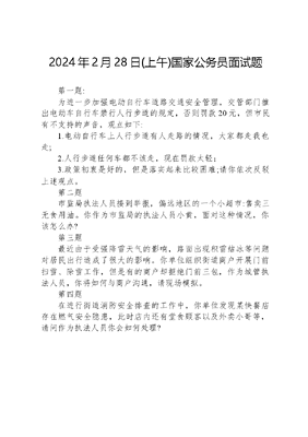 2024年2月28日(上午)国家公务员面试题第一题:为进一步加强电动自行车道路交通安全管理,交管部门推出电动车自行车禁行人行步道的规定,否则罚款20元,但市民有不支持的声音,观点如下:1.电动自行车上人行步道有人走路的情况,大家都走我也走;2.人行步道任何车都不该走,现在罚款太轻;3.政策初衷是好的,但是落实起来比较困难;请你依次反驳上述观点。第二题市监局执法人员接到举报,偏远地区的一个小超市:售卖三无食用油。你作为市监局的执法人员小黄,面对这种情况,你该怎么办?第三题最近由于受强降雪天气的影响,路面出现积雪结冰等问题对居民出行造成了很大的影响。你单位组织街道商户开展门前扫雪、除雪工作,但是有的商户却拒绝门前三包,作为城管执法人员,你将如何与商户沟通,请现场模拟。第四题在进行街道消防安全排查的工作中,你单位发现某快餐店存在燃气安全隐患,此时店内还有堂食顾客以及外卖小哥等,请问作为执法人员你会如何处理?