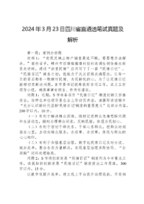2024年3月23日四川省直遴选笔试真题及解析第一题:案例分析题材料1:村民反映土特产销售渠道不畅,需要想办法解决。前些日子,嵊州市石璜镇雅璜村驻村选调生胡佳薇在村里走访时,通过浙里民情应用写下了一篇民情日记。民情日记诞生之初,就致力于关注百姓点滴需求,让每一页的背后都有一颗倾听民情、为民解忧的心。为了让民情日记能够切实解决问题,S市委书记统筹抓好各项工作,成立工作领导小组,确保事事有回音、件件有落实。问题1:近期,S市准备召开民情日记制度创新工作推进会,你所在单位领导要在会上作动员讲话,请撰写讲话稿中充分认识新时代坚持'民情日记'制度的重要意义这部分内容,200字以内,10分。(一)有利于解决群众困难。随时记录群众急难愁盼问题和生活动态,随时办理群众诉求,反映民情,体现为民初心。(二)有利于密切干群关系。干部心系群众,把群众时刻装在心里,主动向群众服务,办好事、办实事,体现与群众的心心相印。(三)有利于加强基层治理。数字化民情日记及时分流、赋分派单,整合各类力量解决,实现基层治理多跨协同、全周期闭环处理格局。问题2:S市将创新发展民情日记制度列为今年重点工作,请就如何创新发展民情日记制度提出工作思路,300字以内,15分。以数字化提升效率。建立线上平台提升治理效能,开发相关软件应用,便捷记录民生民情,拓展软件功能,全面收集问题建议,实现自上而下任务全落地、自下而上民情全回应。以网格化直抵一线。坚持党建引领,探索建立多元网格力量队伍,借助网格员自身优势,形成服务内容全方位、服务对象全覆盖、服务时间全天候的服务体系。以精准化保障群众。依托民情日记,摸准实情,找准问题,对辖区居民情况全面梳理,不断完善优化服务流程,构建响应迅速、办理高效的工作机制。以长效化创新机制。健全完善走访调研、问需求效制度机制,建立清单式管理办法,深入践行四下基层活动,精准施策、逐项落实,着力构建共建共治共享的治理新格局。第二题:公文写作题材料:J市发改委为了更好推进碳达峰碳中和工作,组织工作组到三个先进地区考察,第一个考察区位于下营化工产业园区的潍坊亚星新材料有限公司了解到,企业通过对设备进行转型升级,将生产运行中的余热进行回收再利用,为企业节能提效与绿色转型注入新动能。目前,该项目已正式投入使用。问题:你是J市发改委的考察人员,准备向市双碳改革工作领导小组提交考察报告,请拟出考察报告提纲,600字以内,25分。关于碳中和碳达峰的考察报告提纲为更好推进我市碳达峰、碳中和工作取得良好成效,我市发改委组织三个工作组分别赴三个先进地区进行考察,现将考察情况汇报如下:一、基本情况考察组深入三个地区,实地考察重点企业、社区及城市街道的绿色转型发展情况,并通过座谈会形式,详细了解各地在绿色低碳转型发展方面采取的重要措施。此次考察让大家开阔了思路,看到了差距,也激发了我市加快绿色转型,推动低碳文可居文库——海量学习资料,手机电脑均可下载www.wenkeju.com发展的信心和决心。二、主要做法一是聚焦规划转型,加强顶层设计。对接先进地区,制定双碳工作方案,推进绿色低碳发展。二是推动产业转型,优化发展路径。发展壮大绿色低碳产业,推动产业升级改造,实现废污循环利用,构建绿色低碳循环发展经济体系。三是实现空间转型,完善基础设施。优化城市道路交通体系,建设口袋公园,推广使用清洁能源。四是推进生活转型,倡导低碳生活。倡导绿色低碳生活理念,推进绿色出行方式,开展全民节约行动,推进废旧闲置物资循环利用。三、经验启示我市在碳达峰碳中和工作中的进一步发展中,还需多处用力,多方着手。一是优化顶层设计。对标先进,结合我市实际,制定碳达峰碳中和的发展规划,明确重点,细化责任,全面推进绿色低碳发展。二是聚焦绿色转型。打造废污资源的循环利用体系,实现绿色循环发展,推动城市空间结构、开发模式、建设方式绿色转型。三是倡导低碳生活。推广绿色低碳生活、出行等方式,营造绿色低碳生活氛围,实现生活绿色转型。第三题:大作文材料:XXXXXX的讲话;各地生活性服务业发展的经验做法,15分钟生活圈、文化区;一站式供给平台,一站多能;各个领域的专家人才表述。问题:结合四川省实际,围绕推动生活性服务业向高品质和多样化转型升级,自拟题目,写一篇策论文。1500-2000字,50分。文可居文库——海量学习资料,手机电脑均可下载www.wenkeju.com积极领题、点题、破题、答题推动生活性服务业高质量多样化发展在我国经济高质量发展阶段的大背景下,群众的消费需求从注重量的满足转向追求质的提升,对生活性服务业提出了更高的要求,推动生活性服务业向高品质和多样化升级成为必然。因此,在经济发展新常态下,要以促进生活性服务业转型升级、培育新的增长点