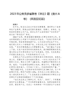2023年公务员多省联考《申论》题(贵州A卷)(网友回忆版)材料1近年来,X省先后成功申报并创建葡萄、棉花等6个优势特色产业集群,聚焦全省范围内基础好、规模大、有特色、比较优势显著的主导产业,推动主导产业由县域的块状经济向全省带状经济转变。2022年6月,第29届国际葡萄酒大奖赛全球榜单公布,夜光杯葡萄酒业公司旗下产品荣获3项金奖。依托T县的气候环境优势,积极布局葡萄酒产业,公司目前已研发生产干红、桃红两大系列七个葡萄酒产品,并通过线上线下渠道销往世界各地。夜光杯葡萄酒业公司谭董事长说,我们整合产业链上下游,在生产端采用标准化栽培技术,提升酿酒葡萄的品质,通过领办合作社带动周边千余户农民增收。同时,还依托酒庄开发酒庄旅游业态,年均接待游客3万人次。在棉花主产区L县的依力村高标准农田建设现场,装载机、推土机、挖掘机等大型机械相互配合,一块块小地块变成了平整的大条田。棉农小艾种了248亩地,看着眼前平整好的大条田,他说:以前棉花地都是小地块,高低不平,平整后就可以使用大型机械了,不仅减少了投入,还能提高棉花产量。截至2022年底,全县高标准农田面积已达100万亩,比十年前增加5倍,棉花产效增长40%;农民也从土地上解放出来,收入渠道更加多元了。L县耿副县长说高标准农田建设为全县棉花产业持续补链强链打下了坚实基础。我们先后成立了制种公司、轧花厂、纺织厂,不断提高棉花产业发展效益。守信集团郭董事长说,集团将继续开发家纺、服装等产品,完成从一粒棉种到一件衣服的全产业链发展。目前,L县近50%的棉花已就地转化为纺织产品,规模化经营、标准化生产、机械化作业,棉花全产业链发展集群已初步形成。在C县塔格村,村民阿力正在播种冬小麦,北斗导航无人驾驶播种机下种均匀、播得直,同步铺设滴灌带,方便了后期我们的管理和采收。塔格村党支部刘书记说:这几年,我们村用北斗导航无人驾驶播种机播种的小麦高产稳产,村民种植冬小麦的积极性很高。现在种地与原来相比,说轻松又不轻松。Q县河子村种植大户老马2022年种植了1500亩冬小麦,种地都机械化了,不再像原来那样拼体力,而是多动脑子,努力学习和掌握新知识。截至2022年,X省农作物综合机械化水平达到87.5%,农林牧渔综合机械化水平达到72.6%。塔河流域的人们,至今依然对去年夏天的一场洪水记忆犹新。塔河进入夏季汛期不久,就形成了60年不遇的大洪水。汛期的主河道大水翻涌,向下游行进。当叶尔羌河山区段来水剧增时,阿尔塔什水利枢纽一面拦截洪峰,一面加大下泄水量。我们积极利用这一股洪水,通过叶尔羌河沿线6个分水枢纽,把水高效引入农区和胡杨林区。塔河流域K县管理局夏局长说,洪水来了,流域管理机构怎么分,我们怎么接,接后怎么分配使用,都有具体的实施方案。2021年以来,塔河流域水资源管理体制进行了一系列改革,实现了从注重供给侧向满足需求侧转变,从关注大河来水向深入灌区服务转变,从管住灌区用水向千方百计保障灌区需求转变,塔河流域各大灌区水资源利用率明显提高。塔河流域管理局王副局长说,得益于塔河流域各地的科学应对,洪水静悄悄流过农田、村庄和胡杨林,80%都得到了有效利用。作为X省特种乳产业的知名企业,我们持续健全产业链、构建融合发展格局,企业不仅生产鲜驼奶、驼奶粉、奶片,还文可居文库——海量学习资料,手机电脑均可下载www.wenkeju.com研发了驼绒制品、驼乳化妆品、保健品,今后还将继续延伸骆驼产业链,走出一条以科技为基础的骆驼产品深加工发展之路。源旺生物科技集团潘董事长说,集团还在品质、工艺、服务三个方面同步发力,攻克驼奶保鲜等相关核心技术,还在F县积极布局集旅游、康养、文化等于一体的骆驼小镇项目,带动当地农牧民增收致富。正在深刻改变农业内涵的高质量发展,将成为不可阻挡的时代趋势。省农业农村厅王副厅长深有感触地说。材料22022年,航天科工集团有多名航天技术工人荣获全国五一劳动奖章。为宣传先进,激励集团广大干部职工,《航天科工集团报》近日刊发了关于他们的专题报道,以下是报道的主要内容:集团一分厂工人小陈说:我师傅对技术的追求近乎痴迷他夜以继日研究、总结出的一套听声辨量绝活,靠听觉就能分辨出切削用量的合理性,高效解决了多项航天重器研制难题。跟着我师傅干,永远都有动不完的脑子学不完的技术。小陈口中的师傅就是该厂车工专业技术带头人赵师傅,他带领的团队承担并圆满完成了多项航天产品机械结构件、骨架类核心结构件的研制和生产任务。尽管赵师傅本人在团队中获得的技术专利是最多的,但他还是心怀紧迫感、使命感:航天技术日新月异,不创新、不敢于突破各种各样的技术限制,现在好不容易积累起来的发展优势就要消耗殆尽。作为团队乃至整个集团的技术核心骨干,他担任了集团