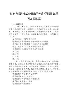2024年四川省公务员录用考试《行测》试题(网友回忆版)一、常识判断1、XXXXXX指出:中国特色社会主义制度是一个严密完整的科学制度体系,起四梁八柱作用的是根本制度、基本制度、重要制度,其中具有统领地位的是党的领导制度。党的领导制度是一个系统完备、内涵丰富的制度体系,主要涵盖以下几项?①不忘初心、牢记使命的制度②维护党中央权威和集中统一领导的各项制度③党的全面领导的制度和全面从严治党的制度④为人民执政、靠人民执政的各项制度⑤提高党的执政能力和领导水平的制度A、2项B、3项C、4项D、5项2、深化党和国家机构改革,是贯彻落实党的XXX精神的重要举措,是推进国家治理体系和治理能力现代化的集中部署。搞好机构改革组织实施工作至关重要。要继续运用好一系列宝贵经验,把住要害和关键,把工作做深做细,有组织、有步骤、有纪律推进机构改革组织实施工作。这些宝贵经验包括:①坚持党对机构改革的全面领导②坚持不破不立、先破后立③坚持推动机构职能优化协同高效④坚持中央和地方一盘棋⑤坚持改革和法治相统一⑥坚持把理论创新贯穿改革全过程A、①②③④B、①②③⑥C、①③④⑤D、①④⑤⑥3、XXXXXX强调,不断做强做优做大我国数字经济。下列关于我国数字经济的说法,正确的是:①全国网络零售市场规模连续多年位居世界第二②数字经济具有高创新性、强渗透性、广覆盖性的特点③以数据资源为关键要素,以现代信息网络为重要载体④深入实施宽带中国计划,建成全球最大的光纤和移动宽带网络A、①②③B、①②④C、①③④D、②③④4、XXXXXX在2023年中央经济工作会议上强调,继续实施积极的财政政策和稳健的货币政策,加强政策工具创新和协调配合。下列说法错误的是:A、适当缩减地方政府专项债券用作资本金范围B、优化财政支出结构,强化国家重大战略任务财力保障C、落实好结构性减税降费政策,重点支持科技创新和制造业发展D、引导金融机构加大对科技创新、绿色转型、普惠小微、数字经济等方面的支持力度5、XXXXXX指出,要以识才的慧眼、爱才的诚意、用才的胆识、容才的雅量、聚才的良方,着力把党内和党外、国内和国外各方面优秀人才聚集到党和人民的伟大奋斗中来。把各方面优秀人才聚集到党和人民事业中来,要坚持做到:①坚持把引进人才作为战略基点,充实高科技人才队伍文可居文库——海量学习资料,手机电脑均可下载www.wenkeju.com②发挥我国人才体系的鲜明政治优势,坚持党对人才工作的全面领导③破除人才培养、使用、评价、服务、支持、激励等方面的体制机制障碍,深化人才发展体制机制改革④积极营造识才爱才敬才用才的环境,坚持为做好人才工作创造良好社会条件A、①②③B、②③④C、①②④D、①②③④6、下列说法与《中国共产党基层组织选举工作条例》相符的是:A、预备党员只有选举权,没有被选举权和表决权B、党的基层组织应当按期进行换届选举,也可自行决定延长或提前选举C、党的基层组织设立的委员会一般由党员大会选举产生,每届任期一般为5年D、进行选举时,有选举权的到会人数不少于应到会人数的五分之四,会议有效7、下列劳动合同属于无效劳动合同的有几项?①王某伪造电工资格证,与某物业公司签订劳动合同,从事电工作业②未经9岁的童星李某同意,其经纪人与某文娱公司签订了广告代言的劳动合同③某企业与大学应届毕业生张某签订劳动合同,注明用人单位有权根据生产经营变化及员工的工作情况调整其工作岗位,员工必须服从单位的安排④赵某与某企业签订了推销某款产品的劳动合同,一周后该产品被相关部门认定为假冒伪劣商品,而赵某事前并不知晓A、1项文可居文库——海量学习资料,手机电脑均可下载www.wenkeju.comB、2项C、3项D、4项8、抗日战争时期,中国共产党相继在华北、华中、华南地区创建了许多抗日根据地,牵制和抗击了大量侵华日军,在全民族抗战中发挥了重大作用。下列根据地创建于抗日战争时期的是:A、晋察冀根据地B、鄂豫皖根据地C、湘鄂赣根据地D、左右江根据地9、下列关于存款准备金率的说法,正确的是:A、降低存款准备金率,商业银行的贷款能力也会随之降低B、一般对法定存款准备金率的调整应根据商品市场供求来确定C、法定存款准备金率是一种宏观调控手段,属于一般性政策工具D、通缩环境下,政府通常会采取提高存款准备金率来刺激经济发展10、下列关于军事知识的说法,错误的是:A、高超音速导弹飞行速度可达10马赫以上B、强激光武器具有不受外界电磁波干扰的特点C、中国自行设计制造的第一艘核潜艇隶属于北海舰队D、制导武器都按照发射前预先设定的飞行轨道打击目标11、中国有着悠久的烹饪历史。下列关于烹任的说法与历史事实不符的是:A、豆在商周之时更多是指一种盛食物的器具B、蒸这种烹饪方法直到北宋时期才得以普及C、春秋时期的中国人在烹