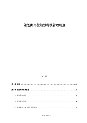 策划类岗位绩效考核管理制度目 录第一章 总则.3第二章 绩效考核实施标准.3一、前期策划总监3二、前期策划经理4三、前期策划主管/执行策划助理..6第1页 / 共9页四、执行策划总监7五、执行策划经理8六、执行策划主管/执行策划助理..9七、激励考核说明.12第二章 本制度附则说明..15第一章 总则一、目的为加强公司各业务绩效管理的总方针,通过对考核激励体系的完善,充分发挥激励的杠杆调节作用,促使团队提高效率努力实现业务目标。二、适用范围本制度适用于天津优仕勤业公司策划线各岗位所有在岗员工。三、生效日期 本制度自下发当月起生效第2页 / 共9页第二章 绩效考核实施标准一、前期策划总监1、激励与岗位业务指标和管理目标,以及年度各类指标完成情况挂钩。2、激励组成: 季度佣金 + 年度佣金 3、季度佣金:以季度为节点,所负责部门整体实现签约项目奖励标准作为季度佣金基数,结合季度指标达成结果发放。季度签约项目奖励标准:类别季度指标指标说明奖励标准咨询类当季指标书以当季下达的指标为依据完成咨询项目指定咨询类报告,项目结案奖励2000元/案;营销代理类完成代理项目指定代理类报告,年销5亿以上项目,代理合同签约后,奖励10000元/案;完成代理项目指定代理类报告,年销3-5亿项目,代理合同签约后,奖励5000元/案;完成代理项目指定代理类报告,年销3亿以下项目,代理合同签约后,奖励3000元/案;季度佣金 = 咨询类奖励 + 营销代理类奖励4、年度佣金:以年度为节点,所负责部门年度整体实现签约项目奖励标准作为年度佣金基数,结合年度岗位考核结果发放。年度签约项目奖励标准:类别年度指标指标说明奖励标准咨询类业务指标书以四个季度下达的累计指标为依据90%以上完成咨询项目并全部结案年度奖励10000元完成率在90%以下的无年度奖励;营销代理类完成代理项目指定代理类报告,年度奖励基数50000元/年年度奖励金=50000*代理合同签约指标达成率;年度岗位考核内容及权重:类别指标指标说明权重评分标准完成率≥90%完成率<90%业绩指标年度业务指标以年度本部整体业务指标为依据50%100%实际完成率部门管理本部门管理以本部门管理工作目标的推进和达成为依据30%按实际表现打分培训带教以本部年度整体培训带教工作和部门员工稳定性完成率为依据10%按带教培训完成率员工成长部门员工转正通过率以及晋级情况10%合格率≥90%,100分,80-8