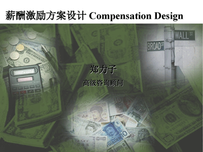 薪酬激励方案设计Compensation Design郑力子郑力子高级咨询顾问高级咨询顾问如何把企业战略策略与人力资源策略联系在一起?How to link business strategy with HR strategy together ?远景战略目标人/财/物岗位设置;A市人才供求状况;薪酬水平长期目标短期目标商业活动(1)开拓X产品在A城市的市场资源十年内成为国内市场上的 三甲五年内在国内市场上的市场占有率15% 三年内销售额增长一倍本年度产品X在市场上的份额增长两倍战略规划业务流程、组织结构工作分析岗位评估岗位评估薪酬激励 人力资源开发培训体系职业生涯规划业绩管理人力资源管理核心人力资源框架薪酬的目的 薪酬的目的 -- -- 薪酬推动行为 薪酬推动行为 Purpose of CompensationPurpose of Compensation——Compensation Compensation drives behaviordrives behavior吸引Attract保留Retain激励Motivate加入To join工作To work改善企业绩效To improve organization performance商业目标Business Objectives完成商业活动报酬经济的非经济的直接的基本工资业绩奖金股权红利各种津贴间接的保险福利补助优惠工作有趣的工作挑战性责任感褒奖的机会成就感发展的机会工作环境合理的政策称职的管理意气相投的同事恰当的社会地位标志舒适的工作条件弹性时间工作制缩减的周工作时数共担工作自助食堂式报酬便利的通讯报酬体系薪酬方案的目标薪酬方案的目标Compensation Program ObjectivesCompensation Program Objectives1.对内公平性2.对外竞争性3.企业支付能力4.容易管理者掌握5.符合法规6.便于员工理解平 衡 平 衡 (1)(1)BalanceBalance$成本成本对外竞争性External Competitive企业支付能力Affordable平 衡 平 衡 (2)(2)BalanceBalance竞争公平公平对外竞争性External Competitive对内公平性Internal Equity薪 酬 系 统 的 构 成薪 酬 系 统 的 构 成Reward System ComponentReward System Component薪酬策略:如何支付薪酬支付理念:公司支付什么,为什么要支付岗位分析:岗位描述岗位价值:岗位评估工资幅度 职级划分薪酬支付体系薪酬哲学四个基本问题:Why, What, How, Who•Why:为什么我们需要薪酬计划?该计划的首要目标是什么?•What:我们支付什么?付酬的因素是什么?•How:我们如何支付?用什么样的支付方式•Who:哪些人适合该薪酬计划?合格的标准是什么?薪酬的理念(续)Why:为什么我们需要薪酬计划?该计划的首要目标是什么?•Attract吸引:•Motivate激励:•Retain保留:•Align一致:•Recognize承认:•Provide Security提供保障:薪酬的理念(续)What:我们支付什么?付酬的因素是什么?•Organizational Objectives 组织的目标(关键业绩指标)•Departmental/Team Objective部门/团队目标•Personal Objective个人目标•Role Requirements职位要求(职位所要求的知识、经验、技能等)•Personal Development个人发展(教育、培训和发展)How:我们如何支付?用什么样的支付方式薪酬的理念(续)•Direct Compensation直接薪酬: 1、固定薪酬:基本工资+(津贴) 2、变动薪酬: 短期激励或奖金(与业绩相联系)长期激励(略)•Indirect Compensation间接薪酬:1、福利: 2、Perquisites零时津贴(俱乐部资格、车补、个人财务计划、特别津贴)•Other Compensation其他方面薪酬: 延期薪酬(如:为避税而设计的薪酬支付计划)关于付薪理念的讨论3P工资Pay for…….Pay for…….Pay for…….3P工资之一Pay for ……为 ? 付薪什么是工作?什么是岗位?什么是职位?什么是工作?什么是岗位?什么是职位?–工作:工作:组织内部分性质相近或相关任务的组合,是构成组织组织内部分性质相近或相关任务的组合,