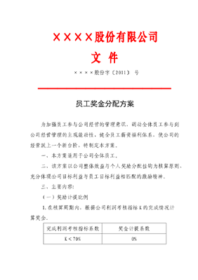 ××××股份有限公司文 件 ××××股份字〔2011〕 号——————————————员工奖金分配方案为加强员工参与公司经营的管理意识,调动全体员工参与到公司经营管理的主观能动性,健全员工薪资福利体系,使公司的经营跃上一个新台阶,特制定本方案。一、本方案适用于公司全体员工。二、该方案以公司整体效益与个人奖励分配挂钩为核算原则,充分体现公司目标利益与员工目标利益相匹配的激励精神。三、主要内容:(一)奖励计提比例1.在核算周期内,根据公司利润考核指标K的完成情况计算奖金。完成利润考核指标系数奖金计提系数K<70%0%70%≤K<100%1%K =100%2.5%K>100%5%例:本年度的利润指标额为1000万元,实际完成计划的110%,则该周期内可供各部门共享的奖励为1000*110%*5%=55万元。(二)分配系数公司系数该系数体现了员工在企业的经营管理及战略发展方面的贡献差异,以此作为划分奖励的主要依据,具体如下:分类系数高层管理类3中层和初级管理类2.5业务类2服务类2一线员工1 ※系数与薪酬制度内的档级进行匹配挂钩。 接上例:各类别可分类奖金系数总额为2.5+2.3+2+2+1=9.8,平均系数奖金为55万÷9.8=5.61万,高层管理类员工可分配奖金为5.61*2.5=14万元中层和初级管理类员工可分配奖金为5.61*2.3=12.9万元业务类员工可分配奖金为5.61*2=11.2万元服务类员工可分配奖金为5.61*2=11.2万元一线员工可分配奖金为5.61*1=5.61万元(三)岗位系数岗位系数根据员工目前所处的岗位,按不同的层级给予确定,具体如下:职务分类系数总经理3副总经理2.7总监、总经理助理2.5部门正副职2.2主管1.5专员1一线员工1接上例:高层管理类可分的奖金系数总额为3+2.7+2.5=8.2,平均系数奖金14÷8.2=1.7万元,副总经理级别可分配奖金为1.7×2.7=4.5万元。中层和初级管理类可分的奖金系数总额为2.2+1.5=3.7,平均系数奖金12.9÷3.7=3.48万元,部门正副职可分配奖金为3.48*2.2=7.65万元,主管可分配奖金为3.48*1.5=5.2万元.四、各部门需配合人力资源部门做好奖励发放的核算工作,核算结果经财务部门审核,报董事长审批通过后给予发放。五、本方案的解释权由行政人事部负责。六、本方案从20年月日起执行。二○一四年十二月十五日
