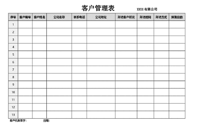 客户管理表XXXX有限公司序号客户编号客户姓名公司名称联系电话公司地址拜访客户状况拜访时间拜访方式预期目的12345678910111213客户代表签字:日期: