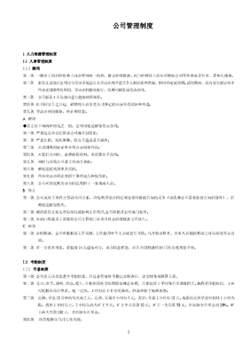 公司管理制度1人力资源管理制度1.1人事管理制度1.1.1聘用第一条一般员工的招聘原则上由企管部统一组织,报总经理批准。部门经理以上岗位招聘由公司管理委员会负责,董事长批准。第二条新员工录用后公司应与劳动者依法订立劳动合同并建立个人相关资料档案,同时约定试用期。试用期间,没有发生被证明不符合录用条件情形的,劳动合同继续履行,否则可解除该劳动合同。第三条公司新员工上岗前应进行健康状况体检。第四条自合同订立之日起,被聘用人员享受公司规定的应该享受的各种待遇。第五条劳动合同的解除、终止和续签:A 解除●员工有下列两种情况之一的,公司可依法解除劳动合同。第一条严重违反劳动纪律或公司规章制度的;第二条严重失职、徇私舞弊,给公司造成重大损害;第三条 在试用期间被证明不符合录用条件的;第四条 在签订合同时,提供虚假资料,采取欺诈手段的;第五条 同时与其他公司建立劳动关系的;第六条 被依法追究刑事责任的;第七条 符合劳动合同法第四十条所述几种情形的。第八条 公司可以依照劳动合同法第四十一条裁减人员。B 终止第一条公司或员工欲终止劳动合同关系,应依照劳动合同法规定履行提前告知的义务(该法规定不需要提前告知的除外),否则依法赔偿损失。第二条被辞退员工如无理取闹以致影响工作秩序,公司将提请公安部门处理。第三条各部门辞退员工须报经公司主管部门审查并经总经理批准方可执行。C 再签第一条合同期满,公司将根据其工作实绩、工作能力和个人小结进行考核。凡考核合格者,在本人自愿的基础上可以续签劳动合同。第二条若一方欲不再签,需提前15天通知对方,双方同意再签,应在合同期满后15日内办理再签手续。1.2 考勤制度1.2.1 作息制度第一条公司员工应自觉遵守考勤制度,月底企管部将考勤记录核查后,送交财务部核算工资。第二条元旦、春节、清明、劳动、端午、中秋和国庆节按照国家规定休假,月薪制员工平时每月可调休四天。休假采用轮休制,工休可根据各岗位性质,统一安排。工时制员工不享受调休,但加班给予加班补助。第三条迟到、早退10分钟内每次扣2元,迟到、早退半小时扣5元,迟到、早退1小时扣10元。扣款的迟到早退时间以1小时为限,迟到1小时以上,2小时以内为旷工半天。旷工半天罚款30元;旷工一天罚款50元,并扣除全月奖金的30%;旷工两天罚款100元,并扣除全月奖金。第四条 扣罚数额以当月工资为限。11.2.2 考勤打卡制度第一条打卡是记录员工上下班考勤的依据,公司员工必须严格执行本制度。第二条不论日夜班,上班时间必须打卡进公司,下班时必须打退卡。常白班员工每日打卡四次。第三条因工作需要加班,加班结束离开公司时方可打退卡。第四条员工因公迟到、早退时应在门卫保安处登记注明并打卡后方可进入或离开公司。第五条如打卡记录中当班人员未打卡,特殊情况须在24小时内由上级主管出具书面证明,否则按旷工处理。第六条员工打卡情况由保安人员负责监督。第七条严禁请别人代打卡和替别人打卡。1.2.3 病、事假管理制度 A 病假第一条持医院的有效证明,请病假3天(含)以内由部门负责人批准。3天以上呈公司领导审批报企管部备案。第二条病假每月2天(含)以内不扣当月奖金,2天以上7天(含)以内扣除当月奖金的30%,7天以上扣除当月全额奖金。第三条 工伤事故发生后,必须24小时内报企管部,同时企管部向县人事和社会保障局通报工伤情况。工伤事故相关事宜按国务院颁布《工伤保险条例》办理。B 事假第一条员工无特殊事情不得请假。如需请假者,必须先填写请假条注明请假原因并经批准。第二条事假1天(含)以内由主任批准,超过1天由部门经理批准,超过3天以上报分管领导审批,并报企管部备案。第三条请事假一天扣当日工资,1天以上3天(含)以内扣当日工资并扣除当月10%奖金,3天以上7天(含)以内扣当日工资并扣除当月50%奖金,7天以上扣当日工资并扣除当月全额奖金。第四条请假者须提前履行书面请假手续,特殊情况(除不可抗力)可以电话请假或委托代办并及时补办请假手续,无故不请假或未经批准而不正常上班的,按旷工处理。1.2.4 婚、丧、产假管理制度第一条婚假假期7天。第二条产假按照国家有关规定,结合公司实际,进行休假,最长不超过三个月。第三条丧假:员工直系亲属死亡,可带薪丧假3天。第四条需延长休假时间的按事假处理,并履行请假手续。第五条事假结束后未到公司报到者,按自动离职处理(有不可抗力原因除外)。2办公事务管理制度2.1工作服、胸卡、考勤卡管理制度第一条新员工上岗培训时到企管部领取胸卡、考勤