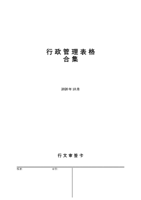 行 政 管 理 表 格 合 集2020年10月行 文 审 签 卡核准: 会签:核稿: 承办部门:起草人:发文编号:〔〕 号主送单位:抄送单位:文件标题:文件附件:附注:共页 第 页文件、传真签办卡发文(传真)机关 文件(传真)编号收件日期:年 月 日密 级: 缓 急:文件、传真标 题收文部门呈办意见领导批示办理阅签办毕记录发文登记表发文日期制发文单位文 件 名 称文件编号文件份数签收人备注印鉴证照使用审批登记表使 用时 间印鉴、证照名称(证照须注明使用原件或复印件)使用事项(注明使用份数)临时带出使用特别事项审 批签 字使用人签 名归还签注 年 月日1.2.3.带出使用人:使用地点:带出时间: 月 日至 月 日 年 月日1.2.3.带出使用人:使用地点:带出时间: 月 日至 月 日 年 月日1.2.3.带出使用人:使用地点:带出时间: 月 日至 月 日 年 月日1.2.3.带出使用人:使用地点:带出时间: 月 日至 月 日 年 月日1.2.3.带出使用人:使用地点:带出时间: 月 日至 月 日注:本表须保存三年以上。领取印鉴证照审批登记表领取印章/证照名称领取部门/单位审 批领取人姓名领取人职务领取时间经办人交回时间合 同 报 表报表期: 年序号合同名称合同号我方当事人对方当事人合同标的名称合同价款(万元)合同签订日期合同履行期合同履行情况合同审批人备注正常延期中止解除未履行其它合同专用章使用登记表公章名称:北开合同专用章( )序号日期使用部门使用事项使用人签字备注快递收件登记表日期收件部门收件号发件人发件单位地址经办人收件人签字快递发件登记表日期发件部门收件单位联系人及电话收件地址寄件内容重量单价总价经办人寄件人名片印制申请单日期: 年 月 日姓名部门期望完成时间名片所需刊登的信息:主管领导意见综合管理部意见 话费补贴申请单姓名部门岗位手机号申请理由申请人: 年月 日主管领导公司审核根据集团规定,该职务/岗位话费补贴标准为元/月。 审核部门:公司领导意见客户接待审批单日期申请部门客户公司名称客人姓名及职务来访人数公司陪同人员申请用餐标准用餐地点申请住宿标准住宿地点房间(天)数其他招待事项公司领导: 主管领导:部门经理:经办人:出差费用申请报销单出差人所在部门随行人所在部门出差期年 月 日至 年 月 日 共 天出差事由出差计划□有 □无出差路线出发时间暂支旅费部门经理公司领导申请日期报销记录(财务填写)报销日期报销金额备注:主管会计:物资领用登记表物品名称:序号日期领用部门收入支出剩余领用人备注