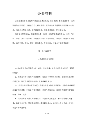 企业管理企业管理是对企业的生产经营活动进行组织、计划、指挥、监督和调节等一系列职能的活动过程。并能实行行之有效管理,从而使企业获得最大的经济和社会效益。增强企业发展后劲,做大做强企业。使企业强起来,职工富起来。结合企业管理实际,根据国家法律、法规,和现有条件自身情况,本照 合法、合理、具体的原则,在此基础上制订该管理制度,目的是:使企业职责明确,运作平稳、流畅、高效,团结奋进,开拓创新,使企业更加繁荣昌盛!第一章 行政管理一、总经理岗位责任制1、认真贯彻党和国家的方针、政策、法律法规,并遵守有关法令法规,做到合法经营。2、主持公司的日常生产经营管理,实施公司年度经营计划;根据市场需求和公司实际,制定公司的市场运营、发展战略及规划。3、 拟订公司的基本管理制度。领导公司建立各级组织机构,并按公司战略规划进行机构调整;制定各种规章制度,并深入贯彻实施;决定各职能部门主管的任免、报酬、奖惩。4、代表公司参加重大的内外活动,加强企业文化建设,抓好公司的文明建设,培育企业文化,提高职工素质,改善职工福利,搞好社会公共关系,树立公司良好的社会形象。第 1页5、 定期主持召开员工座谈会,了解员工动向,指导生产、销售、服务的每个环节;检查、督促和协调各部门的工作进展情况。6、 加强公司质量、环保、安全管理工作,负责处理公司重大突发事件,重大质量事故。对质量、环保、安全工作作出成绩的个人和集体进行表彰奖励。7、 定期主持召开生产例会,质量、安全及经济活动分析会,并制定合理,可行的应变对策。8、 充分发挥预测与计划,组织与指挥,督促与检查,教育与激励,革新与挖潜的各项工作。二、生产部经理岗位责任制1、负责公司的日常生产、设备、电气、安全管理。协助总经理制定公司的质量方针、目标,完成公司年度生产计划。负责生产任务完成。2、根据市场需要,及时调整配料,按计划生产各种强度等级的水泥,满足工程的需要,并配合销售部服务跟踪信息反馈 。3、制定公司内部各项生产管理,奖惩制度,充分调动员工的工作积极性,保证完成各月生产任务。4、及时处理生产中设备、电气和排查生产中的各项隐患,事先预防,深入了解实情,针对薄弱环节,分析处理。5、协调配合,加强公司质量、安全、环保工作,并对做出成绩的个人和集体给予表彰奖励。6、深入实际,了解情况,查看现场,掌握当天的生产动态,做出总结,分析,提高,召开相关会议,及时安排、布置处理。第 2页7、抓好公司建设,培育企业文化,注重辖区环境,改善生产条件,树立企业形象。8、注重生产节能降耗,减亏增效,逐步实现清洁生产。三、质量部经理责任制1、认真贯彻执行国家《产品质量法》、《水泥质量管理规程》等方面的法律、法规和政策。协助总经理抓好节能、降耗、减污、增效的工作。2、负责企业质量管理工作,确定企业质量方针目标,根据市场的动态制订产品 质量发展规划,在总经理的领导下对公司的质量管理工作负主要责任。3、督促检查企业各部门质量工作的开展情况,确保各项质量按规划完成。4、加强原材料进厂管理,随时掌握企业产品质量情况,做到心中有数,针对薄弱环节,对影响产品质量的重大技术性问题,组织有关 人员进行分析、检查、总结并做好实验研究。5、对内负责协调、改善处理重大质量事故,对外组织相关人员处理质量纠纷,认真对待、处理用户所反映的问题,树立维护企业形象。6、熟悉企业产品质量状况,正确指导生产,负责产品质量的奖惩工作。对一贯重视产品质量的先进典型进行表彰和奖励;对出了严重质量事故的,及时查明原因,严肃对待,情节恶劣的要给予经济处罚或降职处分。7、负责组织抓好质量管理教育,领导开展质量活动,评价产品质量情况,对产品质量难题进行攻关。 8、为拓展市场,提高知名度,配合搞好售后服务和征求用户意见。搞好信息反馈工作,根据用户意见研究持续改进提高质量的措施和办法。第 3页9、对企业的生产成果进行监督、考察和检验。积极抓好新型混合材料(助磨剂)等的应用提高工作。四、行政部经理岗位责任制1、负责公司本部的行政管理和日常事务,当好领导的参谋,协助领导搞好各部门之间的综合协调,加强对各项工作的督促和检查,建立并完善各项规章制度,促进公司各项工作的规范化管理。2、负责公司的公文、资料、信息和宣传报道工作,沟通内外联系,保证上情下达和下情上报。3、负责公司来往文电的处理和文书档案的管理工作,负责对会议、文件决定的事项进行催办、查办和落实。4、加强对外联络,拓展公关业务,促进公司与社会各界的广泛合作和友好往来,树立良好的企业形象。5、负责本公司职工各类业务技能的培训、教育、计划、安排、协调工作。6、负责加强考勤、卫生、食堂、宿舍、车辆、出差等后勤管理工作。7、负责公司的印章、文件、证照、传真、劳动合同、办公用品的领用保管工作。8、全公司组织系统及单位工作职责、编制人数的规划、研