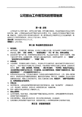 厦门蚁族网信息科技有限公司公司前台工作规范和的管理制度第一章总则公司前台作为公司涉外窗口,经常性与客户接触,具有较重大的责任,前台接待直接代表企业形象和服务质量,因此,公司的前台接待必须严格遵守接待工作规范。反之,则会给公司形象造成严重的不良影响。有鉴于此,为提升公司的外在形象和服务水平,统一规范前台的工作秩序和员工行为及操作程序,特制定前台工作规范和管理制度,对前台工作进行细化、具体化。适合范围:本制度适用于前台工作人员。管理部门:公司行政部。第二章 电话接待流程及话术1.电话接听:a)接听电话时,首先要热情、精神饱满,因为我们代表着公司形象。电话铃响第二声到第三声的时候,接起电话。话术:您好,蚁族网。 请问您找哪位?不以喂开头,使用礼貌用语。b)接电话的语气要不紧不慢,并始终保持轻松愉悦的声调,禁止在接听电话时,使用不文明语言,或者不耐烦的语气语调。应调整好表情,微笑是可以通过电话传递的,多使用礼貌用语,如:谢谢您、请问还有什么可以帮您的吗?、不用谢等等。2.来电转接:a)来电转接时,首先要确认接听人在座位上,并且确认其可以接听电话(是否在接听手机或者与领导汇报工作)。尽量不要告知来电者公司人员的电话,尽量采取留下联络方式通知公司同事,回电给对方的形式。话术:好的,请您稍等,帮您转接。(确认可以接听) 不好意思,他现在不在座位上/正在接听电话/目前外出不在公司,不方便转接。是否需要帮您留言,或者留下您的联系方式,稍后请他回电给您? (不方便接听或不在位子上)。b)对方找的如果是总经理,又知道总经理姓氏,则需要礼貌的问清楚对方的姓名、公司,要有一定的辨别能力,辨别无关电话和重要电话的区别。重要电话来电转接,做好记录,如遇推销,无法说出需转接者姓名的电话,或者与公司无关的来电,就要以礼貌的借口拒绝。婉拒话术:请留下您的联系方式,如果需要我们会与您联系。3.来电记录:a)做好来电记录,主要是需要留言的来电和需要回电的来电记录。填写电话留言条(来电者姓名、公司、转达事宜、联系电话、来电时间)放在明显的位置,并提醒同事。b)留言一定要及时转达给有关部门或者相关人员。4.其他注意事项:a)让对方先挂线。在接听电话、打电话给客户或者打电话给上级领导时,应有礼貌的等待对方先收线,这样整个电话才算圆满结束。b)如果没有在前台,要留心前台电话铃响,要尽快用附近电话接起,并礼貌接听。c)如果要离开公司或者暂时不能接听电话,需要提前告知上一级领导或者同事代为留意接听电话。第三章访客接待规范厦门蚁族网信息科技有限公司1.外来访客接待:a) 遇到有访客来,应立即起身招呼来访客人。面朝向来访者点头,微笑致意。您好!请问您找哪位?您贵姓?是否有预约? 如有需要,要填写来访登记表。了解其所拜访对象,请来访者到洽谈间或者会议室等待,立即联系被拜访者或者相关人员,并为客人倒水。b) 如果来访者等待时间过长,被访者还在忙,要主动关照一下来访者,并向其说明一下,并提醒被访者,询问是否需要相关其他人员先接待等。c)接待来访客人时,应尽量避免来访者经过或滞留在办公区域,如果经接洽者允许,可以有前台引导来访者进入办公区域。d)如果遇到拜访对象不在,应让来访者在洽谈间等待,立即联系被访者,告知其有来访者,看是需要来访者等待,还是另约时间。再委婉告知来访者。e)送客:客人离开时,要起身、面带微笑礼貌送客。话术:请您慢走、您辛苦了、再见。等等。客人走后,要及时将客人使用过的一次性杯子清理,桌椅摆回原位。保持会议室和洽谈间的整洁。2.对内同事接待:a)早上上班有主动和同事,特别是领导打招呼问好。话术:早上好、早、某总/姓名+早上好!。下班也要和同事打招呼。话术:辛苦了,我先走了,明天见。领导,请问您这边还有什么需要我做的工作吗,(如果没有)那我先走了,领导再见!等等。b)前台要保持有人在位置上,如果有事离开,需要主动交代同事帮助接听电话或者接待访客,首先是同部门的同事,其次是其他部门的同事。c)礼貌对待其他同事或者领导安排的工作。话术:可以,但是我要先和我的部门主管说明一下,因为我目前有工作在做,所以时间上和部门主管确定一下,再答复您,是否可以完成,以及完成的时间,您看可以吗?或者,您直接和我们部门主管说一下,让他安排?(工作量较大,一小时内无法完成的工作。)好的,可以。(可以顺手帮助完成的工作)。d)注意,对待同事一定要谦和有礼,可以帮忙的尽量帮忙,一时不能做到或者完成有困难的,不直接决绝,可以向其说明目前的工作情况,并及时向部门主管汇报,合理调整配置工作。第四章快递、信件、物品收发管理规范1.快递、信件、报纸收发:a)发件:在收到公司员工要寄的文件资料、物品时,要在快递登记表