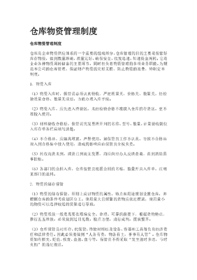 仓库物资管理制度仓库物资管理制度仓库是企业物资供应体系的一个重要的组成部分。仓库管理的目的主要是保管好库存物资,做到数量准确、质量完好、确保安全、收发迅速、加速资金周转。它是企业各种物资周转储备的主要环节,同时担负着物资管理的多项业务职能。为规范本公司的仓库管理,保证财产物资的完好无损,防止物资的浪费,特制定本制度。1.物资入库(1)物资入库时,保管员必须认真验收,严把质量关、价格关、数量关,经检验质量合格、数量无误后,方能办理入库手续。(2)物资入库,应先进入待验区,未经检验合格不准放入仓库的存货区,更不准投入使用。(3)材料验收合格后,保管员凭发票所开列的名称、型号、数量、计量验收就位入库存单各栏应填写清楚。(4)不合格品,应隔离堆放,严禁使用。如保管员工作不认真,导致不合格品混入到合格品中投入使用,造成的影响应由保管员全权负责。(5)托收而货未到,或货已到而无发票,均应向经办人反映查询,直到消除悬事挂账。(6)各部门的余料入库,仓库保管员根据余料的名称、数量开具入库单,注明某部门的退料。2.物资的储存保管(1)物资的储存保管,原则上应以物资的属性、特点和用途规划设置仓库,并根据仓库的条件考虑划区分工,使用量大且频繁的货物应就近摆放,使用量小的物资可以选择较远的货架进行存放。(2)物资堆放一般是需要在堆垛安全、合理、可靠的前提下,根据货物特点,推行五五堆放,必须做到过目见数,检点方便,成行成列,摆放整齐。(3)仓库保管员对库存、代保管、待验材料以及设备、容器和工具等负有经济责任和法律责任。因此必须要做到人各有责,物各有主,事事有人管。仓库物资如有损失、贬值、报废、盘盈、盘亏等,保管员不得采取发生盈时多送,亏时克扣的违纪做法。(4)保管物资要根据其自然属性,考虑储存的场所和保管常识处理,加强保管措施,使公司财产不发生保管责任损失。同类物资堆放,要考虑先进先出,发货方便,留有回旋余地。(5)保管物资,未经部门领导的同意,一律不准擅自借出。(6)仓库要严格保卫制度,禁止非本库存人员擅自入库。仓库严禁烟火,明火作业需经保卫科批准。保管员要懂得使用消防器材和必要的防火知识。3.物资出库(1)所有发料凭证,保管员应妥善保管,不可丢失。(2)物资出库坚持一盘底,二核对,三出库,四减数的原则。对贪图方便,违反出库原则造成物资失效、霉变、大料小用、优料劣用以及差错等损失,保管员应负经济责任。(3)物资出库按月平均单价计量出库。领料单应填明材料名称、规格、型号、领料数量或材料用途,领料人签字。属计划内的材料应有材料计划,属限额供料的材料应符合限额供料制度,属规定审批的材料应有审批人签字。同时,超费用领料人未办手续,不得发料。(4)发料必须与领料人办理交接,当面点交清楚,防止差错出门。(5)对于部门领料,属部门定员领料,必须是固定岗位人员领取。其他部门领料,必须由部门的领导签字才可发料,否则,造成物料损失,由管理员承担经济责任。(6)对于专项申请用料,除计划采购员留作备用的数量外,均应由申请单位领用。常备用料,凡属可以分割折另的,本着节约的原则,都应折另供应,不准一次性发料。4.其他有关事项(1)创造五好仓库(安全、优质、方便、多储、低耗)是每个保管员努力的方向,每月对仓库进行一次检查,以促进创五好仓库的开展。(2)允许范围内的差错、合理的自然损耗所引起的盘盈、盘亏,每月都可以上报,以便做到账、卡、物、资金四一致。(3)记账要字迹清楚,日清月结不积压,托收、月报及时。(4)保管员调动工作,一定要办理交接手续,移交中的未了事宜及有关凭证,要列出清单三份,注明情况,双方签字,需领导见证,双方各执一份,报人事部存档一份,事后发生纠葛,仍由原移交人负责赔偿。对失职造成的亏损,除原价赔偿外,还要给予纪律处分。(5)库存盈亏反映出保管员的工作质量,力求做到不出现差错。