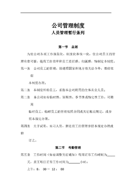 公司管理制度人员管理暂行条列第一节总则为使公司各项工作规范化、制度化和统一化,使公司员工的管理有章可循,提高工作效率和员工责任感、归属感,特制定本制度。第一条公司员工的管理,除遵照国家和地方有关法令外,都应依据本制度办理;第二条本制度所称员工,系指本公司聘用的全体从业人员;第二条本公司如有临时性、短期性、季节性或特定性工作,可聘用临时员工,临时员工的管理依照合同或其它相应规定,或参照本规定办理。第四条关于试用、实习人员,新进员工的管理参照本规定办理或修订之。第二节考勤管理第五条工作时间(如有调整另行通知)每周正常工作时间为 天,员工每日正常工作时间为 小时:上午:8: 00 - 12 : 00 下午:13 : 00 - 18 : 00第六条 所有员工必须严格遵守公司考勤制度,实行打卡签到制度。第七条 迟到、早退、旷工1. 员工均需按时上、下班,工作时间8:00开始后半小时内到班者为迟到,超过30分钟以上者,按旷工半日论处。2.工作时间下班前半小时内下班者为早退,早退一次安旷工处理;3.员工当月内迟到、早退合计每三次以旷工一日论;4.无故迟到超过半小时者以旷工半日论;5.无故提前半小时以上下班者,以旷工半日论;6.未经请假或假满未经续假而擅自不到职以旷工论处。7.员工旷工,不发当日薪资,并扣除月度奖金和季度奖金。8.连续旷工三日或全月累计旷工六日或一年累计旷工达十二日者,予以除名,不发给资遣费。第八条请假制度事假和病假,必须提前准备好假条,由负责人签字方可生效,电话请假得到许可后,假后要及时补上假条并找负责人签字。1.病假员工须于上班开始的前一个小时内,即 7 :00 - 8 :00前致电负责人,请假一天以上的,病愈上班后须补假,并向行政部出示县级以上医院就诊证明。2.事假2.1一般性事假需提前一天以上告知相关负责人,并及时办理请假手续;2.2紧急突发事情必须由本人,不得委托他人告知负责人,经负责人核准,方可离开工作岗位,否则按旷工论处。事假期间不计发工资。(注:每个员工每季度只有一次紧急事假,请假时间在2天以内并认真履行各项手续的,可以不予以扣罚工资)第九条休假制度按国家规定,员工除星期日休息外,还享有以下有薪假日: 元旦(3天)、春节(7天)、劳动节(3天)、端午节(3天)、中秋节(3天)和国庆节(3天),由于业务需要,公司可临时安排员工于法定的公休日、休假日照常上班。第三节人员培训第十条为提高员工的业务、知识技能及发挥其潜在智能,使公司人力资源能适应本公司日益迅速发展的需要,公司将会举行各种教育培训活动,被指定员工,不得无故缺席,确有特殊原因,应按有关请假制度执行。第十一条新员工进入公司后,须接受公司概况与发展的培训以及不同层次、不同类别的岗前专业培训,培训时间应不少于24小时,合格者方可上岗。新员工培训由公司根据人员录用的情况安排,在新员工进入公司的前两个月内进行,考核不合格者不再继续留用。第四节人员考核第十二条试用考核员工试用期间(两个月)由相关负责人考核,期满考核合格者,填具试用人员考核表经总经理(负责人)批准后正式录用。第十三条平时考核由相关负责人和办公室依照通用的考核标准和具体的工作指标考核标准进行,主管及其以上人员每两个月考核一次,其他人员每个月考核一次。从员工进入公司起将对所有员工进行严格的日常规范考核,日常规范和每月工资奖金挂钩。第十四条业绩考核公司根据员工的实际情况,确定开始业绩考核的时间,即时将有专人负责跟踪,除后勤人员以外,其它所有人员都将列如业绩考核范畴。业绩考核与工资、奖金、提成、福利挂钩。第十五条考核结果所有人员的考核结果均由办公室保存,作为确定薪酬、培养晋升,确定业绩、奖励、福利、调职的重要依据。第十六条离职辞职1、员工因故不能继续工作时,应填具辞职申请经相关负责人批准后,办理手续。并视需要,开据《离职证明》。2、员工辞职,需提前一月提出申请:责任人员辞职根据职级的不同,需提前2—3个月提出辞职申请。否则按照公司相关制度扣除15日薪资相抵,补偿公司损失。3、由于工作表现和工作业绩两个月均不达标者,根据相关规定由办公室人员提前一个星期告知,然后按照规定办理相关手续,自动离职。第五节生活娱乐第十七条公司根据业绩情况、经营情况可定期组织开展一些集体娱乐活动;第十八