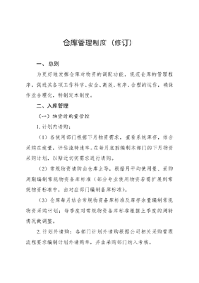 管理制度(修)仓库订一、总则为更好地发挥仓库对物资的调配功能,规范仓库的管理程序,促进其各项工作科学、安全、高效、有序、合理的运作,确保作业合理化,特制定本制度。二、入库管理(一)物资请购量管控1.计划内请购:(1)各使用部门根据下月物资需求,查看系统库存,结合采购在途量,评估流转速率。在每月底前编制本部门的下月物资采购计划,以贴近切实需求进行请购。(2)常规物资请购由仓库主导,根据月平均使用量、采购周期编制常规物资备库标准(部分专业使用物资若需扩展到常规物资标准中,由对应部门编制备库标准)。(3)仓库每月结合常规物资备库标准及库存余量编制常规物资采购计划;每季度对常规物资备库标准根据上季度的周转情况做调整。 2.计划外请购:各部门计划外请购根据公司相关采购管理流程要求编制计划外请购单,并由采购部门纳入考核。3.各部门申请物资量过大或请购后长期未使用,造成呆滞三个月以上库存资金,超过部门呆滞库存资金最大控制量部分,仓库与财务提出部门批评项,扣分标准为每超过部门呆滞库存资金最大控制量10%扣部门绩效2分。(二)到货前准备1.到货通知,采购员接到供应商的送货通知后,提前一天将到货批次、到货品种、到货数量等有效信息通知仓库管理员。2.仓库管理员根据到货信息提前做好到货接收准备工作,根据物资性质整理库存预留存储空间。3.货位整理要求按品种整合零散存货点,按先进先出的原则把老库存移至储存前方,留出足够空间,并在整理货位的过程中清理货架卫生,保持仓储空间整洁干净。(三)到货验收1.采购员接到供应商的具体送货到达时间后,通知仓库管理员。2.物资送达仓库后送货员将货物整齐堆放到分拣区,仓库管理员与采购员、送货员共同确定送货数量及包装是否完好,来货物资以采购部门的采购订单为收货依据,并在《送货单》上进行签字,将待验收货物拆装摆放至各库分拣区后整理、归类摆放,方便验收。3.常规物资由仓库管理员按照《采购订单》和供应商《送货单》等凭证对来货进行验收,核对到货物资的名称、型号、规格和数量,一般物资应随到随验,及时收料,大宗物资的验收时间不超过三日;对于成套设备应以出厂说明书所列内容验收;特殊设备和技术要求高的备品,由技术部门、请购人员、采购人员和仓库管理员共同验收。仓库管理员对照《采购订单》数量,清点实际送货数量。3.物资入库前,仓库管理员必须对照货物与《采购订单》、《送货单》所列的型号、数量或规格是否相符,严格检查物资的质量、数量、品种、保质期、外包装等;如发现型号、数量、规格不符及包装破损的,应做好相应记录,以下情况不得入库:(1)来货物资名称、规格、型号、数量与采购订单不符;(2)未附产品合格证、化验单和技术资料等;(3)表面检查发现损坏、渗漏、锈蚀或附件不全;(4)商品质量低劣、残次;食品接近或超过保鲜期、变质;物资包装破损严重,或者存在其他存放安全问题;(5)无采购订单且不在采购计划内;(6)定制不符合要求。对于验收结果不符合标准的物资,及时通知采购联系进行退、换货工作。(四)到货入库1.验收合格,仓库管理员将《采购订单》在XXXX中生成《采购入库单》,打印并签字办理入库手续,做到帐、货相符。2.《采购入库单》入库单一式四联,黄联交给供货商,蓝联交采购结算使用,红联交财务入账,白联留存,月底装订存档。3.仓库管理员根据系统生成的对应物资条码,对需要贴条码的物资进行贴条贴防盗磁工作。遇破损和数目有差异的物资统一整理归类,告知采购员联系供应商退换补发,合格物资根据物资属性分类、分数目装箱、装袋上架,并填写物资查存卡。4.食品、餐饮库物资要建立健全物资查存卡,写明物资到货期,生产日期,保质期等信息。5.入库完毕,仓库管理员通知各部门申领物资。6.如遇紧急采购事项必须进行库外现场接收,根据以下内容进行:(1)采购员接到供应商的送货通知后,根据《采购订单》编制《现场使用接收单》,并通知仓库管理员、请购人员或使用人现场验收,如验收需技术支持则通知相关技术部门,验收人员在《现场使用接收单》上签字确认。相关技术部门根据分管物资的特性,检验采购物资质量是否合格,并在《现场使用接收单》上签字确认。(2)库外现场收货物资在验收后由采购管理员提交《采购订单》、仓库管理员根据《现场使用接收单》、《采购订单》生成《入库单》,打印并签字办理入库手续,保证账实一致。7.若仓库管理员因工作失误,出现货物与单据不符等问题所造成的经济损失由仓库管理员承担。(五)货物存放保管1.存货的储存保管,原则上应根据物资的属性、特点和用途规划设置仓库,并根据仓库构造划区分工,合理、有效地使用仓库面积,存放时应考虑其忌光、忌热、防潮等因素,妥善存放。2.仓库管理员对所经管的物资,以有利于先进先出的作业原则分别决定储存方式及位置。3.凡周转量大的物资用落地堆放方