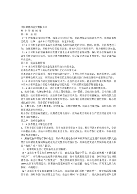 泾阳县盛和商贸有限公司财 务 管 理 制 度第一章总 则(一)为加强公司财务管理,规范公司财务行为,提高增强公司综合竞争力,依照国家相关政策、法规,结合本公司实际情况,制定本制度。(二)公司财务管理的基本任务是做好各项财务收支的计划、控制、核算、分析和考核工作;合理筹集资金,积极参与经营投资决策,有效利用公司各项资产,努力提高经济效益。(三)公司财务管理基本原则是建立健全企业内部财务管理制度,做好财务管理基础工作如实反映企业财务状况,依法计算和缴纳税收,保证投资者权益不受侵犯,保证企业利益不受损失。第二章资金筹集管理(一)本公司筹集的资本金为各股东投入的资本金。资本金是指企业在工商行政管理部门登记的注册资本。资本金在生产经营期间,投资者除依法转让外,不得以任何方式抽走。如需要增资,应经公司董事会研究决定,依照法定程序报经工商行政管理部门办理注册资本变更登记手续。(二)本公司的所有者权益除实收资本外,还包括资本公积、盈余公积和未分配利润。其中资本公积和盈余公积经公司董事会研究决定,可以按照规定程序转增资本金。(三)本公司和所属企业,通过负债方式筹集的资金,分为流动负债和长期负债。1、流动负债,包括短期借款,应付及预收账款、应付票据、其他应付款等。其中应付及预收账款、应付票据等负债,应由销售或营业部门负责,财务部门积极配合。短期借款及其他负债则由财务部门负责筹措其发生和偿还。各部门自行筹措的短期经营性借款,除总经理批准的以外,财务部门不负责偿还 。 2、长期负债,包括长期借款,应付债券、长期应付款等,均由总经理授权,由财务部门负责筹措其发生和偿还。财务部门在筹措短期借款、长期借款等负债时,应考虑是否有利于生产经营或投资项目及财务风险等情况。第三章货币资金管理(一)货币资金日常收付管理1、在财务部门设置专职出纳员,负责办理货币资金(现金、银行存款)的收付业务。会计不得兼任出纳。出纳不得兼任其他业务工作。除登记现金、银行存款日记账外,不得保管凭证和其他账目。2、所有现金和银行存款的收支,都必须先通过会计在审核原始凭证无误后填制收付款凭证;然后由出纳检查所属原始凭证是否完整后办理收付款,并在收付凭证及所属原始凭证上加盖收讫或付讫戳记。3、对零用现金实行定额备用金管理制度:(1)各部门单项支出在1000元以下的,首先从备用金中开支,然后汇总填制单据报销审批单,将取得的合法发票单据附在后面,按审批流程报批签字后,到财务部门办理报销手续,由会计填制付款凭证,凭此到出纳处领取现金,以补充部门备用金。单项在1000元以下的零用支出,所取得的发票单据在7日内报销,临近月末的,在月末之前及时报销,不得跨月。(2)各部门单项支出在1000元以上的,应由用款部门填制借款单,按审批流程报批签字后,到财务部门办理预支款手续,由会计填制付款凭证,凭此到出纳处领取支票或现金。用款部门在购置物品经验收入库等手续办妥后,应及时汇总填制单据报销审批单,将取得的合法发票单据附在后面,按审批流程报批签字后,到财务部门办理单项报销手续。如预支款与实际支付不一致时,应在报销时办理多退款(或少补款)手续。单项在1000元以上的支出,所取得的发票单据要及时报销列账,时限为7天。(3)审批权限规定:①所有支出均由各部门负责人审核后报总经理审核批准;②专项用途资金支出,由总经理审核批准; ③因经营需要代收代付款项,由总经理审核批准,但必须坚持先收后付,不改变原款形式及用途原则。(二)现金管理(1)所有现金业务收入当日送存开户银行;所有支付的现金,应从库存现金限额中支付或从开户银行提取,不得从公司现金收入中直接支付,即坐支;因生产经营需要从开户银行提取现金,应据实写明用途。(2)按照国家现金管理规定,库存现金只能用于工资性支出、个人福利劳保支出、农副产品收购、差旅费、零星开支、备用金及银行结算金额起点以下的小额款项。其他特殊情况使用现金需经总经理批准。(3)库存现金采用核定限额管理,每日的现金结存数,不得超过核定的限额,超过部分应及时送存银行。不准以白条抵库存。企业单位之间的经济往来,一般应通过银行进行转账结算;不准出借银行账户和套取现金。(三)银行存款管理(1)支票付款必须经过两人或两人以上的签章方为有效。支票和财务专用章,必须分别掌管,不得由一个人包办。(2)必须按顺序号签发支票。签发支票在支票备查簿上登记。(3)不准出租出借银行账户,不准签发空头支票和远期支票,不准套取银行信用。(4)不准签发空白支票,如确属需要,也要填写签发日期和款项用途,并封住最高限额。(五)其他货币资金管理(1)根据业务需要合理选择银行汇票、银行本票、信用卡、信用保证金等结算工具。(2)及时办理结算,对逾期尚未办理结算的银行汇票、银行本票等,应按规定及时转回。(3