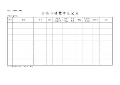 编号:A0604-{BH}涉 密 存 体 登表储载记单位(盖章): 序号名称编号密级产生或到校时间载体形式保密期限件数产生部门或来源经手人去向注:涉密载体管理部门(项目组)留存。