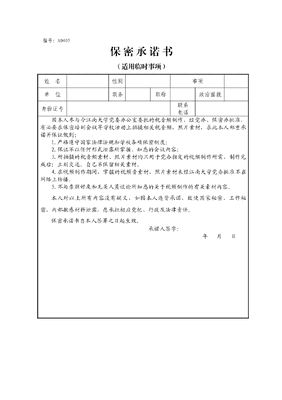 编号:A0405保 密 承 诺 书(适用临时事项)姓名性别事项单位职务 职称政治面貌身份证号联系电话因本人参与今江南大学党委办公室委托的视音频制作,经党办、保密办批准,有必要在保密培训会议等学校活动上拍摄相关视音频,照片素材,在此本人郑重承诺并保证做到:1.严格遵守国家法律法规和学校各项保密制度;2.保证不以任何形式泄露所掌握、知悉的会议内容;3.所拍摄的视音频素材、照片素材均只用于党办指定的视频制作所需,制作完成后;立刻交还。自己不保留相关素材。4.在视频制作期间,掌握的视频音素材,照片素材未经江南大学党办批准不在网络上传播。5.不与亲朋好友和无关人员谈论所知悉的关于视频制作的有关素材内容。本人对以上所有内容没有疑义,如因本人违背承诺,致使国家秘密、工作秘密,内部敏感材料泄露,愿承担相应党纪、行政及法律责任。保密承诺书自本人签署之日起生效。承诺人签字:年 月 日