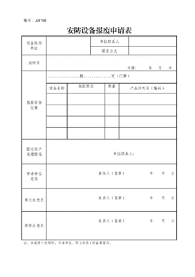 编号:A0708安防设备报废申请表设备使用单位单位联系人联系方式巡检员日期: 年 月 日报废设备位置________________楼______________室(门牌)设备名称报废原因数量产品序列号(编码)固定资产处理情况 单位联系人:申请单位意见责任人(签章)年月 日保卫处意见负责人(签章)年月 日保密办意见负责人(签章)年月 日注:本表用一式两份、申请单位、保卫处各1份备案留存。