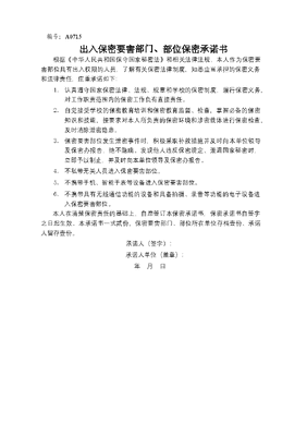 编号:A0715出入保密要害部门、部位保密承诺书根据《中华人民共和国保守国家秘密法》和相关法律法规,本人作为保密要害部位具有出入权限的人员,了解有关保密法律制度,知悉应当承担的保密义务和法律责任,庄重承诺如下:1.认真遵守国家保密法律、法规、规章和学校的保密制度,履行保密义务,对工作职责范围内的保密工作负有直接责任。2.自觉接受学校的保密教育培训和保密教育监督、检查,掌握必备的保密知识和技能,按要求对本人所负责的保密环境和涉密载体进行保密检查,及时消除泄密隐患。3.保密要害部位发生泄密事件时,积极采取补救措施并及时向本单位领导及保密办报告,绝不隐瞒。发现他人违反保密规定、泄漏国家秘密时,立即予以制止,并及时向本单位领导及保密办报告。4.不私带无关人员进入保密要害部位。5.不携带手机、智能手表等设备进入保密要害部位。6.不携带具有无线通信功能的设备和具备拍摄、录音等功能的电子设备进入保密要害部位。本人在清楚保密责任的基础上,自愿签订本保密承诺书,保密承诺书自签字之日起生效。本承诺书一式贰份,保密要害部门、部位所在单位存档壹份、承诺人留存壹份。承诺人(签字):承诺人单位(盖章):