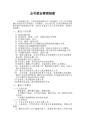 公司前台管理制度公司的前台是一个单位的脸面和名片.所以前台工作人员必须掌握公司前台的工作职责、工作要求、办公礼仪等.这对于塑造单位形象有着非常重要的作用!为使公司前台人员工作更加规范,特制订本制度。一、前台工作内容1)接转总机电话。2)负责传真、快速、文件、报纸的收发与管理。3)负责前台接待、登记。4)引见、招待、接送来宾。5)负责公司前台的卫生清理及桌面摆放并保持整洁干净。6)负责前台花卉植物的维护和保养。7)负责清洁员的工作监督与考核,检查公司清洁与卫生情况。8)接受行政经理工作安排并协助人事文员作好行政部其他工作;9)不得随意离开工作岗位,造成不便。10)做好会前准备、会议记录和会后内容整理工作及开会时需要配合的一些相关后勤工作.。11)及时更新公司员工通讯录。12)记录员工考勤,登记迟到早退及外出情况。13)检查员工佩戴工作证情况,无证者禁止其进入公司楼上。14)协助各部门之间的协调工作。做招聘及安排员工面试。完成上级交付的其它任务。15)每天打扫经理办公室卫生及安排好茶水工作。16)公司电脑,打印机复印机等文印设备,发现故障应及时通知维修人员或供货商修复.确保设备正常使用。并协助各部门进行文字扫盲相关设备及时添加打印纸。17)公司员工外出做好外出登记表。18)积极完成直接上级分配的临时性任务。二、前台工作要求(一)仪容仪表:服装整洁,服饰整齐端庄,搭配协调。头发整齐不零乱,不得批头散发,需化淡妆,给人清新的印象,忌浓妆。上班前不能喝酒或吃有异味的食品。(二)工作要求:1.凡与公司业务无关人员应拒绝入内。2.上班时间,不得有闲杂人等在前台区域高谈阔论,影响公司形象。3.接待公司客人应礼貌请其座下,再通知部门相关人员是否接见。4.上班时间不准打私人电话或电话聊天。5.上班时间不准看书籍和报纸。6.上班时间禁止做其他与本职工作无关的事情,以免影响工作质量。7.负责会客室的整洁,并主动给参加会议的人倒茶水,会议结束后,立即清理会议室。(三)负责前台电话转接,接电话礼仪要求:1.铃声响起三声之内,应立即接起电话。2.接电话时要说您好!沁坤电子商城,有什么可以帮您?不允许出现喂,喂或你找谁或查问对方你是谁,你有什么事等。3.如果找公司领导,不能随意报出领导在哪,更不能随意报出领导的电话。4.代接电话时对方如有留言,应当场用纸笔记录对方姓名,电话及内容,之后复述一遍,以免有误。并告诉对方会及进转告。5.遇到对方拨错号码时,不可大声怒斥,或用力挂电话,应礼貌告知对方,如果是自己拨错了号码应向对方表示歉意。(四)前台工作态度: 前台对待员工或其他客人要礼貌大方、热情周到。对来找高层管理者的客人,要问清事先有无预约,并主动通知被找者。三、来访接待礼仪1.客户或来访者进门,前台马上起身接待,并致以问候或欢迎辞。如站着则先于客人问话而致以问候或欢迎辞。 单个人问候标准语如下: 先生,您好!或先生,早上好! 小姐,您好!或小姐,早上好! 您好!欢迎来到XX公司。 来者是二人,标准问候语则为: 二位先生好! 二位小姐好 先生、小姐,你们好! 来者为三人以上,标准问候语则为: 各位好!或各位早上好!各位下午好 大家好!或大家早上好!大家下午好! 对已知道客户或来访者姓名的,标准问候语如下: X先生好! X小姐好! 对已是第二次或二次以上来公司的客户、来访者,在沿用单个人问候标准语并看到客户点头或听到客户跟说你好之后,还可选用如下标准问候语: 先生,我记得您前不久(以前)来过我们公司,今天光临,再次表示欢迎! a) 引导客户或来访者到咨询厅就座,递上茶水,送上公司营销宣传资料; b) 当场解答或电话通知相关业务接待人员出现,介绍时先介绍主人,后介绍客人; c) 引领客户或来访者接触相关人员,行走时走在客户或来访者侧前位置,并随时用手示意。途中与同事相遇,点头行礼,表示致意; d) 进入房间,要先轻轻敲门,听到回应再进。进入后,回手关门; e) 介绍双方,退出。如相关人员抽不开身回应,则安抚客户或来访者稍等,退出。 四、违纪处理前台如违反本制度,视情节给予批评,或处50元以上,100元以下罚款,屡教不改者直接辞退。
