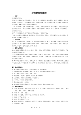 第 1 页 共 3 页公司通用管理制度一、仪容 仪容要端庄大方。面部:头发要梳理好,不准留长发,怪发式,不染夸张颜色,梳洗整齐。女性长发要扎好。不准浓妆艳抹(可化淡妆),不准戴夸张饰物。男性脸部清爽干净。男性不得蓄须,头发标准为前不遮眼,后不盖领,两侧不过耳;男士不准留大胡子。衣着:正确佩戴工号牌,保持牌面整洁,无破损;穿规定的工作服,服装要整洁,衣服要洗净烫平、纽扣要全部扣好,袖口及裤脚均不得卷起。不得裸背敞胸,穿短裤、背心,卷裤脚,不准穿拖鞋、凉鞋到工作区域。指甲:不得留长指甲,指甲要清洁不得藏污垢。不得染指甲油。气味:上班前不吃异味食品,饭后漱口,保持口腔清洁,无异味,不得用强烈香水。经常洗澡,保持身体气味清新,防止汗臭。二、行为规范坐、立、行姿势要端庄,举止要大方。坐时不准将脚放在桌、椅上,不准跷脚、摇腿;站立时姿势要自然大方,两手垂放或自然弯曲在背后或胸前,不得两手插兜,不要呆板不动,倚墙、靠壁或倚椅靠柜;行走时不能摇头晃脑,拉手、搭肩。 三、服务礼节礼貌1、对待宾客态度要自然、大方、稳重、热情、有礼,做到笑面迎客,用好敬语。不得以肤色、种族、信仰不同而以貌取人。 2、与客人相遇要主动让路,重要宾客会见时主动握手,特别是女宾,若客人先伸出手来和你握手时,应面带笑容与客人握手。握手时,姿势要端正,腰要直,上身向前倾,用力要随对方的表示,不能用左手与客人握手。 3、与客人谈话时应站立端正,讲究礼貌,不左顾右盼,低头哈腰或昂首叉腰,用心聆听客人的谈话,不与客人抢话,不中途插话,不与客人争论,不强词夺理,谈话有分寸,语气要温和,语言要文雅。 四、基本服务礼仪:1. 在营业场所内见到客人、上司或同事都主动、热情地问好。2. 始终面带微笑,始终保持正确的立相、坐相、走相及使用规范的行礼方式。3. 以正确的方式与客人说话,听客人说话。4. 做到四轻:说话轻、走路轻、关门轻、操作手势轻。5. 走路靠右,不在客人面前横穿,不超越客人。6. 不串岗,不在工作场所扎堆聊天。7. 接打电话使用统一应答语。8. 使宾客感到亲切和温暖,是一种最普通、最基本、最常见的礼貌礼仪。五.基本待客用语:1. 寒喧:欢迎光临、您好、您早、晚安、再见、请多关照、真是个好天气、请走好、告辞了、辛苦了、请进、谢谢、不客气、请再次光临。2. 承答:是、好的、知道了。3. 谢绝:十分抱歉,实在对不起、真不好意思、打扰了。4. 询问:对不起,请问……。5. 请求:给您添麻烦了……。6. 道歉:照顾不周,实在抱歉,让您久等了,打扰了, 给您添麻烦了, 今后一定注意,请稍等一下。7. 中途退席:失礼了。第 2 页 共 3 页8. 确认姓名:对不起,请问是哪一位?9. 接话:是、好的。六、员工劳动纪律 1、工作时间:按公司实际规定执行。 2、按时上、下班,上、下班要走员工通道,不旷工,不擅离职守;严格执行交接班制度;不得私自调班或调休,需调班时必须找好调班人员,征得经理同意后方可调班,不准串岗。 3、员工上班前不得饮酒,吃生葱、蒜等食品。上班时不准抽烟、吃零食、咀嚼口香糖。不得剔牙齿,抠鼻孔,挖耳朵,打饱嗝,伸懒腰,打呵欠,打喷嚏;不随地吐痰,丢杂物,修指甲、搔痒等。 4、上班时间不准做私活、会客、洗衣服、洗澡、看书报、下棋、打私人电话;不得带亲友到餐厅公共场所、餐厅玩耍、聊天;不准开收录音机、电视机,不准哼唱歌曲、小调。 5、服从领导的工作安排和调度,按时完成任务,不得无故拒绝或终止工作。 6、爱护公司的财产,爱护一切工(用)具,注意节约原材料,节约用电、用水,注意设备的维修、保养;不私拿公司物品。 七、员工考勤 1、员工上、下班时必须打记时卡。打卡后应将卡片放回原处,严禁代人或委托人打卡,违者给予处罚。 2、迟到或早退、旷工:凡超过或提前规定的上、下班时间一分钟,即被认为是迟到和早退。需按公司相应规定处理。 3、如因公差、外勤、加班、病假、事假等原因未能打卡,应向经理报告,应备有病、事假条及医院证明等,以备核查。八、用餐制度:1. 公司实行工作餐制度,员工凭本人餐卡就餐,不得外借。2. 所有员工必须在指定场所范围内文明用餐。3. 员工用餐时间严禁喝酒,任何食物不得带入或带出公司。 八. 从业人员健康管理制度 1、建立食品从业人员的花名册,所有从业人员经健康体检合格后方可上岗。 2、新参加工作和临时参加工作的食品生产经营人员必须进行健康检查,取得健康证明后方可参加工作。 3、已取得健康证明的食品从业人员每年必须进行健康检查,健康合格的有效期限为一年。 4、建立健康申报制度,工作期间凡患有痢疾、伤寒、病毒性肝炎、活动性肺结核、化脓性或渗出性皮肤病以及其它有碍食品卫生的患病人员应及时向部门负责人申报,立即停止直接接触食品工作。 对不参加健康体检的人员按部门