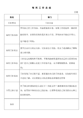 每 周 工 作 总 结日期姓名部门工作事项工作内容本周工作内容罗列自己的工作内容,内容要做到丰富,如果工作比较单一那就要做的细节,让领导觉得你是在努力干活,罗列内容不能过于夸大,也不能过于简短;本周工作重点要学会总结出重点内容,比如说会计付款,攻克了或者解决了哪些老大难问题,本周工作体会工作肯定有顺利和不顺利,不顺利的时候是因为自己什么原因导致的?是自己的粗心还是工作经验不足,从中要吸取教训,获得成长;本周工作需求工作发现了自己的不足,就要提出自己的工作需求,比如说对项目不是很了解,可以要求公司每次都给出详细的文档等下周工作计划有了体会和感悟该怎么进行下一步的工作?那就要拿出计划目标出来,在周报中体现出自己的目标,让领导看到自己努力的决心和工作的积极性。备注