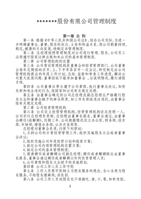 *股份有限公司管理制度第一章 总 则第一条 根据《中华人民共和国公司法》,结合公司实际,为进一步明确董事会,董事,股东的权力,义务和利益关系,使公司朝着持续,稳定,健康的方向发展,特制定本管理制度.第二条 总经理按照管理制度对公司进行管理.股东,公司员工必须遵守国家法律法规和本公司的基本管理制度.第二章 公司管理机构的设置第三条 公司常设管理机构是董事会和经营管理部门.公司董事会每年定期按时召开,上,下半年各召开一次会议,研究制定由公司管理机构提出的年度工作计划,总结.监督和审查工作进度,解决公司重大发展问题.董事因故不能参加董事会 ,应说明情况,履行请假手续.第四条 公司董事应带头遵守公司章程,执行董事会决议,如有失职和违法违纪行为,按国家和公司有关规定处理.第五条 由董事会确定的公司总经理及副总经理应严格履行股东大会和董事会赋予的神圣职责,如工作失职或违法违纪,由董事会按有关规定处理. 第三章 公司经营管理机构第六条 公司设立经营管理机构,经营管理机构设总经理一人,公司实行总经理负责制,总经理由董事长提名,董事会通过,由董事会聘任(或解聘),任期三年.公司根据情况设立办公室,财务部,技术部,市场部,增值业务部,公共关系部等.总经理对董事会负责,行使下列职权:1,主持公司的日常经营管理工作,组织实施股东大会或者董事会决议;2,组织实施公司年度经营计划和投资方案;3,拟定公司内部管理机构设置方案;4,拟定公司的基本管理制度;5,提请聘任或者解聘公司副总经理;聘任或者解聘除应由董事长提名,董事会通过聘任或者解聘以外的负责管理人员;6,公司章程和股东大会授予的其他职权.第四章 公司工作人员工作守则第七条 工作人员要牢固树立为股东服务的观念,全心全意为股东服务,不给股东增麻烦,添负担.第八条 公司工作人员到股东处不准搞吃,拿,卡,要,如有违犯,1股东有权拒绝并可举报到公司,对违纪工作人员,公司将给予纪律处分.第九条 公司工作人员要努力学习,提高自己的工作水平和工作能力,严格按公司章程,制度办事.讲究工作方法,保守公司秘密,不该讲的话不讲,不该做的事不做,维护全体股东利益,提高工作效率,为公司节约开支.第十条 公司工作人员因公到股东处,费用由公司支付,如应股东邀请前往,则费用由邀请者负责.第十一条 工作人员因公需应酬,要报告总经理批准.否则,不予报销.第五章 公司开支管理第十二条 公司管理人员应本着开源节流,量入为出的原则,为公司及股东着想,努力增加收入,降低费用,节约开支.1,公司董事开会,每人每天费用150元,其中餐费50元/人?天,住宿100元/人?天,来往乘火车,乘坐比火车标准高的交通工具,需经董事长批准.2,公司因公邀请股东来公司研究工作的,由公司负责其食宿与交通费用,食宿标准与董事开会相同.3,股东本人要求来公司办事的,其本人及随行人员费用自理.4,公司来客户要严格控制招待费用,超出公司规定的,谁支出谁个人负责,公司不予报销.5,公司工作人员出差,实行费用包干,超出部分自负.第六章 公司网站后台管理权限第十三条 各地,市,县代理网站后台的开启,由市场部提请书面报告,经总经理批准后,方可开启.第十四条 股东管理后台的关闭,必须由市场部作市场报告并提前15天通知当事人,由董事会研究决定,董事长签字批准后,交由市场部执行.第七章 公司保密工作第十五条 公司全体工作人员,股东应保守公司机密,如故意向竞争对手提供本公司机密,一经发现,按相关规定处理,情节严重的交由司法机关处理.第十六条 公司不能越级以各种借口通过一点通客户端界面上发布,宣传公司的各项业务,公告宣传工作.第八章 监事会工作第十七条 公司监事要切实履行职责,向股东负责,及时向股东报告公司情况.监事因故不能履行职责时,应提前委托他人行使职责.第九章 股东,联盟伙伴行为准则第十八条 股东要严格遵守公司章程,履行有关义务,对违反公2司章程的股东,公司有义务通知其限期改正.第十九条 对违反公司章程与其它网站合作或拒绝信息联网合作的股东,市场部应先做好回归工作;对拒不合作者,公司有权对其进行处罚,其经营的市场由公司市场部做好手续后,另安排其它单位或个人合作经营;如若给公司造成重大经济损失,公司可以通过法院起诉,要求其赔偿经济损失,对拒绝执行者,公司可建议法院强制执行拍卖其股份,取消其股东资格.第二十条 遵守公司章程和管理制度,不得跨地区经营侵害其他股东利益.如有侵害,其他股东可向公司举报,公司核实后,对被侵害的单位赔偿的标准按5000元/户执行,如果拒绝赔偿则关闭后台,取消经营资格.第二十一条 股东有义务维护公司利益,维护公司的统一和团结,有事情要通过组织解决,不得向公司和全体股东提供虚假情况,制造混乱和恐慌.如有上述行为,公司应立即加以制止和解决,解决不成时应立即向