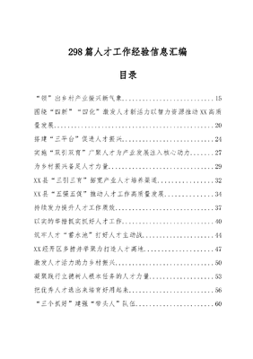 298篇人才工作经验信息汇编目录领出乡村产业振兴新气象15围绕四新四化激发人才新活力以智力资源推动XX高质量发展..20搭建三平台促进人才振兴24实施双引双育广聚人才为产业发展注入核心动力.27为乡村振兴备足人才力量.29XX县三引三育拓宽产业人才培养渠道.32XX县五强五促推动人才工作高质量发展..34持续发力提升人才工作质效..37以实的举措抓实抓好人才工作40筑牢人才蓄水池打好人才主动战44XX经开区多措并举聚力打造人才高地..47激发人才活力助力乡村振兴..50凝聚践行立德树人根本任务的人才力量.53把优秀人才选出来培育好用起来.56三个抓好建强带头人队伍..60XX区厚植留才土壤助力强省会.62创新人才培养机制让国有企业出新篇65被骗回来的书记不骗人.67打造招才引智强磁场汇聚推动高质量发展人才.72人才荟萃添动力稳岗就业暖民心.75推进人才大汇聚,助力高质量发展..81XX县建立四个机制打造一支永远不走的退役军人工作队89聚焦三力打造人才领创热土赋能乡村振兴92XX区四个精推动村级组织领军人才华丽蝶变.95不忘人民这个根..98聚焦引育用留激发人才创新活力..100三步棋助力乡土人才破土飘香102XX县实施人才四大工程助推高质量发展.105畅通技能人才成长三关.107XX县三举措,打造基层人才聚水池.109133加快聚集新时代创新创业人才.111133加快聚集新时代创新创业人才.114四化集结乡村振兴骨干队伍..117构筑人才强磁场,引才涌入蓄水池122三式工作法助推乡村人才振兴.125四举措补齐医疗卫生人才不足短板129搭建三个平台助推东西部人才协作走深走实.132架好三座桥深化东西部人才交流协作.136写好人才三篇文章激发乡村振兴活力.139鼓励引导人才向艰苦边远地区和基层一线流动141培育乡土人才助力乡村振兴.144抓机制强服务激发人才活力助推高质量发展..147一场沙盘推演为人才交流聚力增温.151待遇提升再发力开局起跑添动力153XX县双校并进夯实乡村振兴人才基础157党建引领促发展五育并举育人才..159健全人才公寓配给体系营造安心留人良好环境163X区四诊疗法破解人才发展壁垒..165XX全力打造人才蓄水池人才总量有望超过105万人.167XX建设国家级人力资源服务产业园一园三区扩规模强辐射170XX去年新增大数据人才2.03万余名